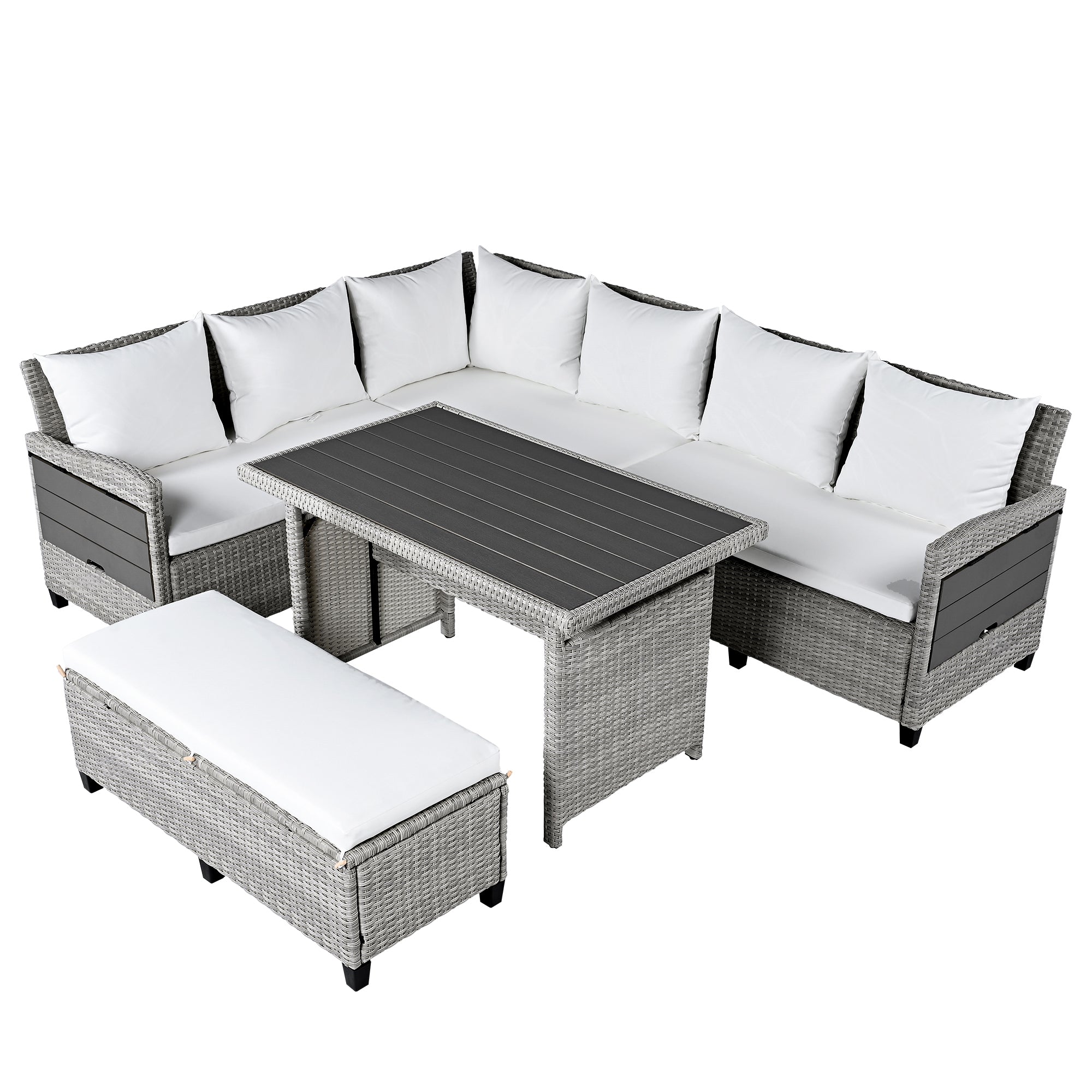 | Pieces Included | 2*loveseat+1*corner sofa+1*table+1*long bench+ 7*back pillows+4* seat cushions |