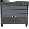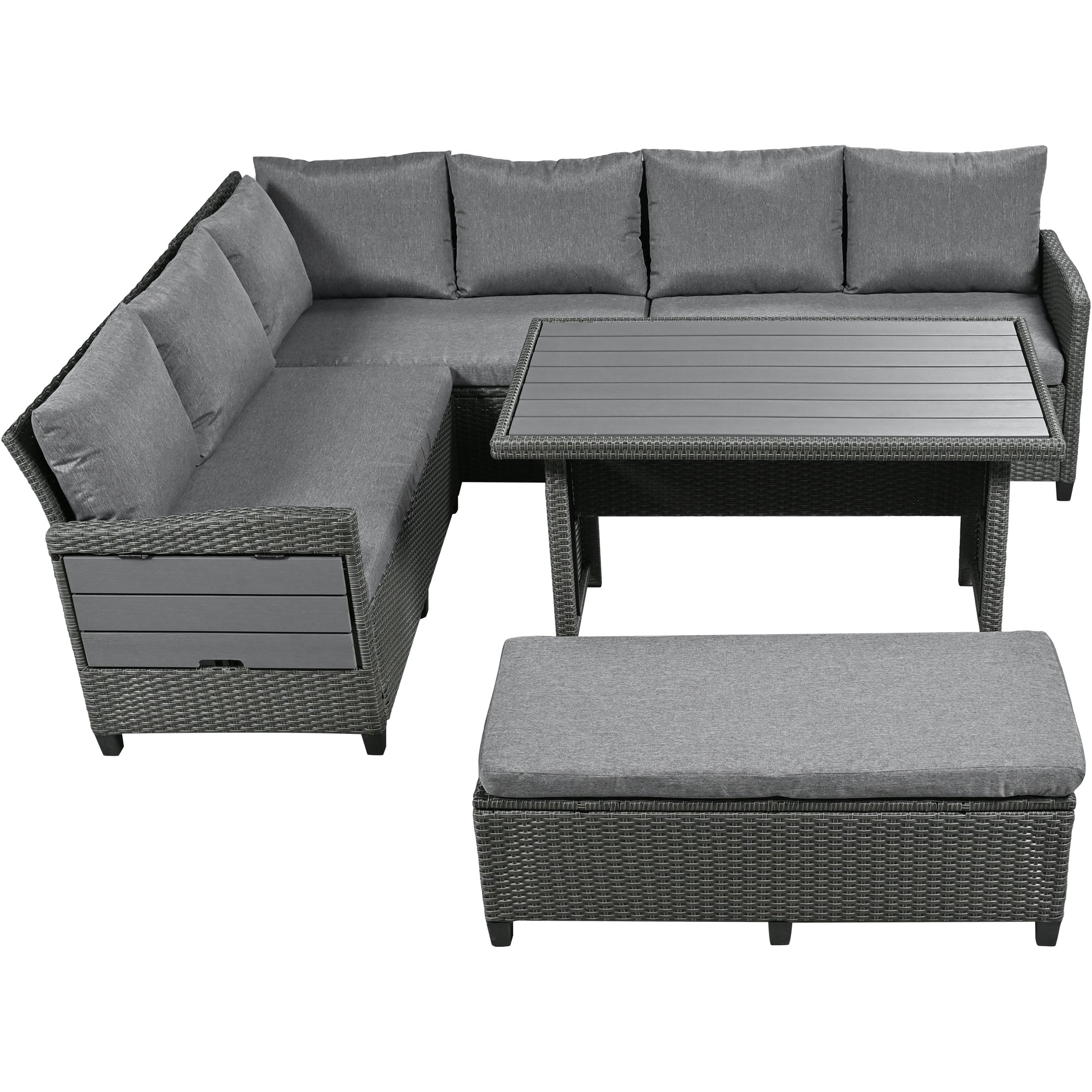 - [5-Piece Sectional Sofa Set] With 2 loveseats with side tables, 1 corner sofa, 1 long bench and 1 dining table, this 5pcs rattan sofa set can comfortably seat 7 people while the spacious table is perfect for placing food and drinks. Adjustable feet under table will make it level and stable as much as possible. Transform your backyard into a leisure place easily and enjoy your sunny time!