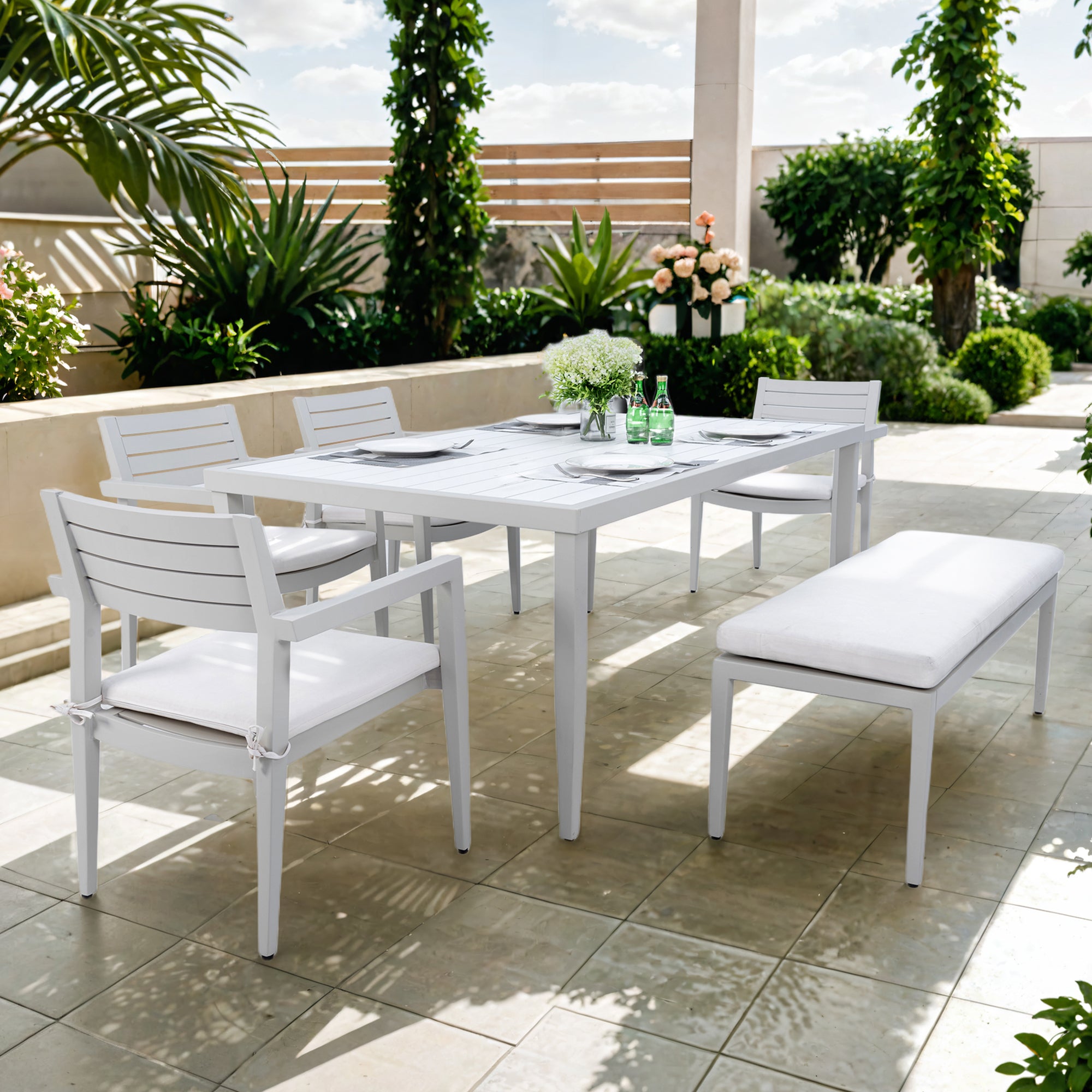6PC Patio Aluminum Furniture, Modern Dining Set, including 4 Dining Chairs & 1 Dining Bench Sunbrella Fabric Cushioned and Two-tone Table Top Rectangle Table with Umbrella Hole, Matte White+Grayish W1886S00005-djyc