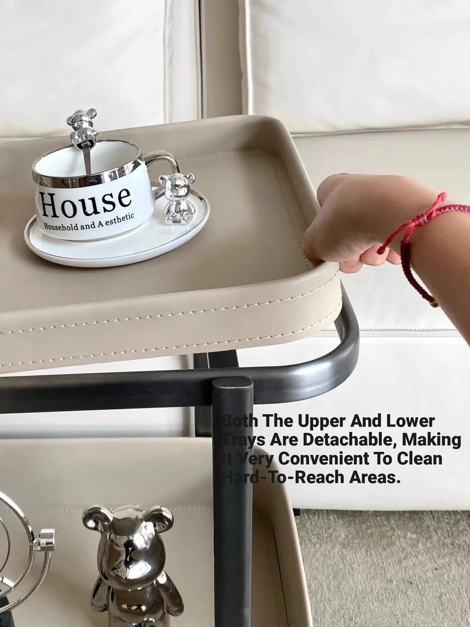 | A Better Home Starts with BICROOM | Elevate your living space with our stylish Tea Table, designed with a sleek stainless steel frame and chic synthetic leather accents for a modern touch that complements any decor. This versatile Tea Table not only serves as an elegant serving cart but also doubles as a stylish display for your favorite decor pieces, making it the perfect addition to your home. Featuring smooth-rolling wheels, the Tea Table offers effortless mobility, allowing you to easily transition it between rooms or reposition it as your needs change. Crafted from durable stainless steel and synthetic leather, this Tea Table combines practicality with aesthetics, ensuring it withstands daily use while maintaining its elegant appearance. With its sophisticated design and ample storage space, this Tea Table is ideal for hosting gatherings or serving afternoon tea, ensuring both functionality and style in one attractive package. Transform your living area with this Tea Table, a fusion of modern materials and chic design that not only enhances your space but also provides a convenient solution for entertaining guests. |