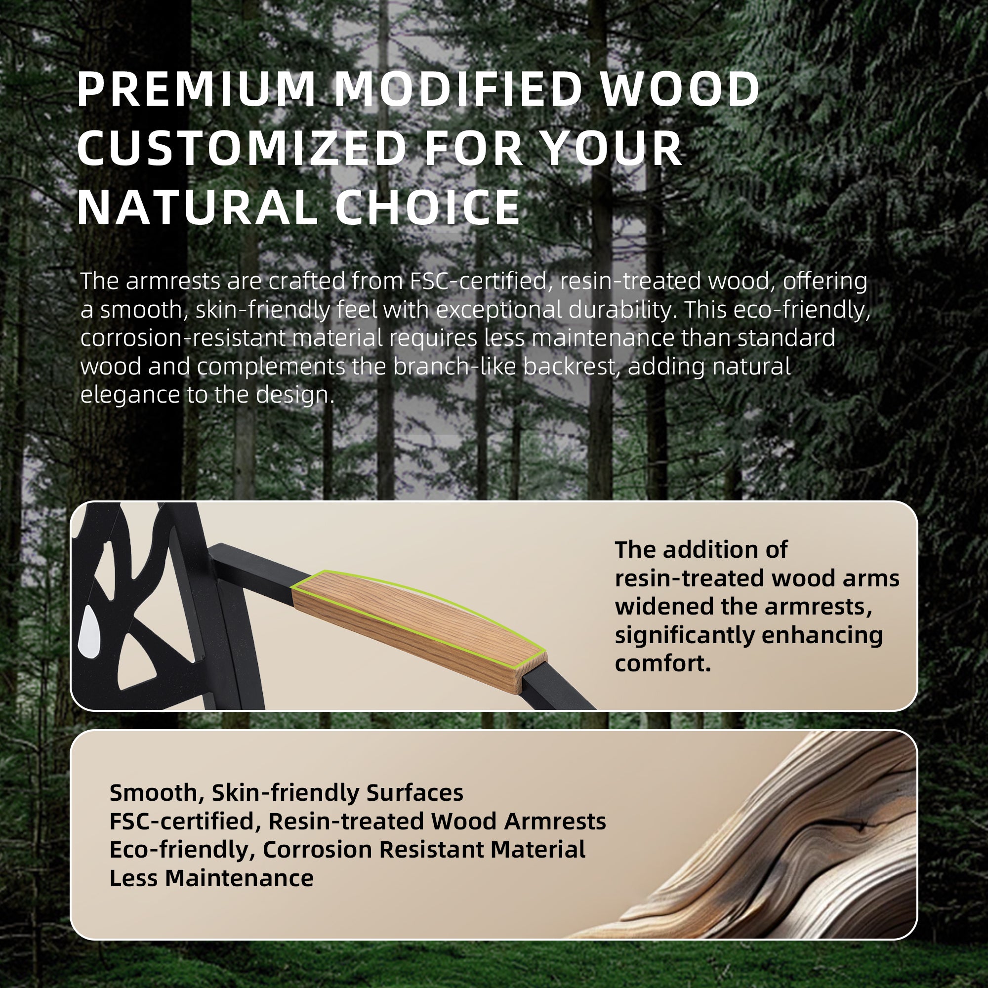 - The armrests of this chair are crafted from FSC-certified, resin-treated wood, providing a smooth, skin-friendly feel with exceptional durability. This eco-friendly material is E0-grade, and is highly corrosion-resistant, requiring far less maintenance than standard wood. Designed to complement the branch-like backrest, these armrests add natural elegance to the chair’s design.