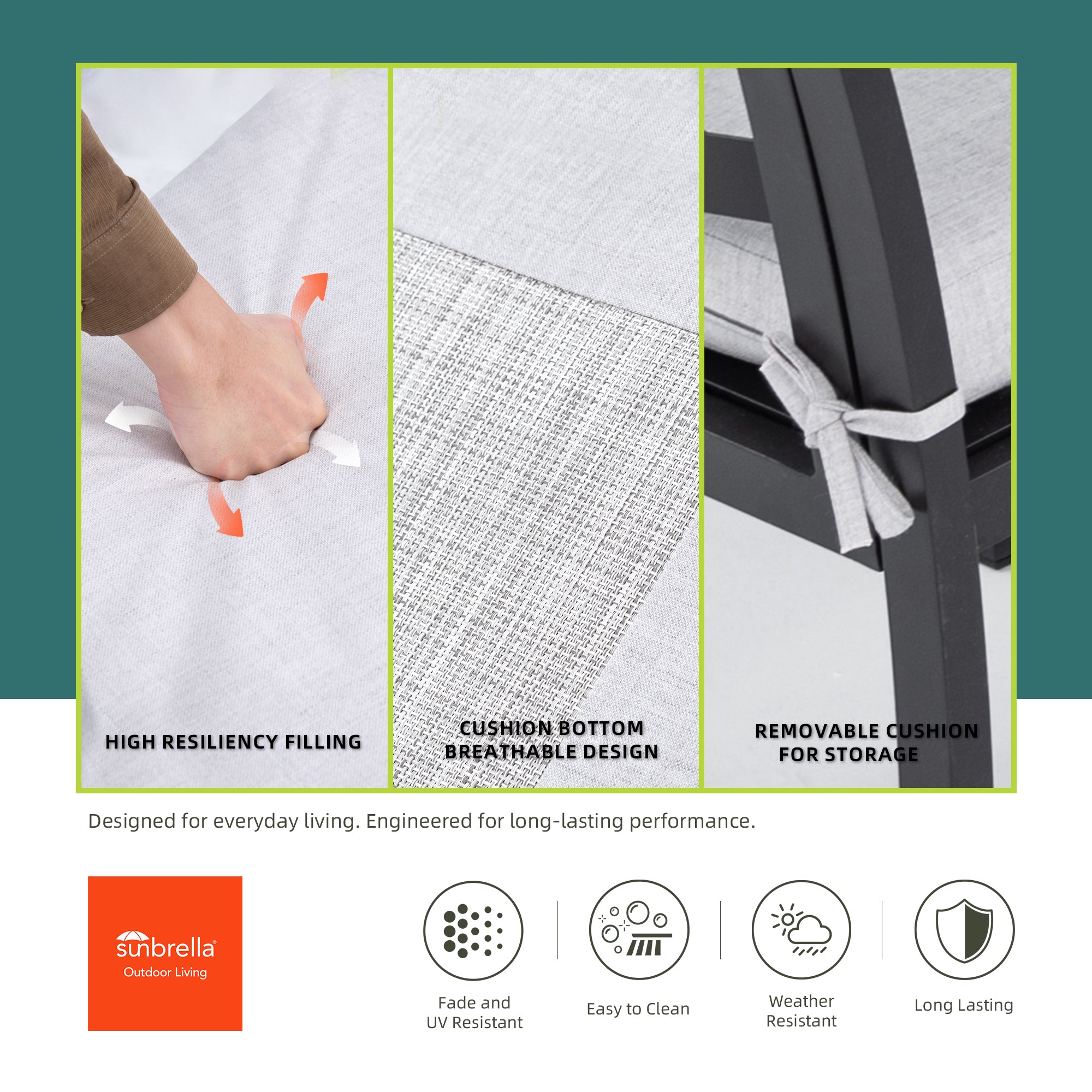- The cushion is made of high-quality Sunbrella fabric in Cast Silver color. Sunbrella, a renowned American outdoor furniture fabric brand, is known for its superior durability, fade resistance, and stain resistance over time. The cushion has straps for easy removal & storage, is filled with high-density foam for exceptional resilience & shape retention. Also it comes with a removable zippered cover for effortless maintenance.The cushion ensures both comfort & convenience for outdoor relaxation.