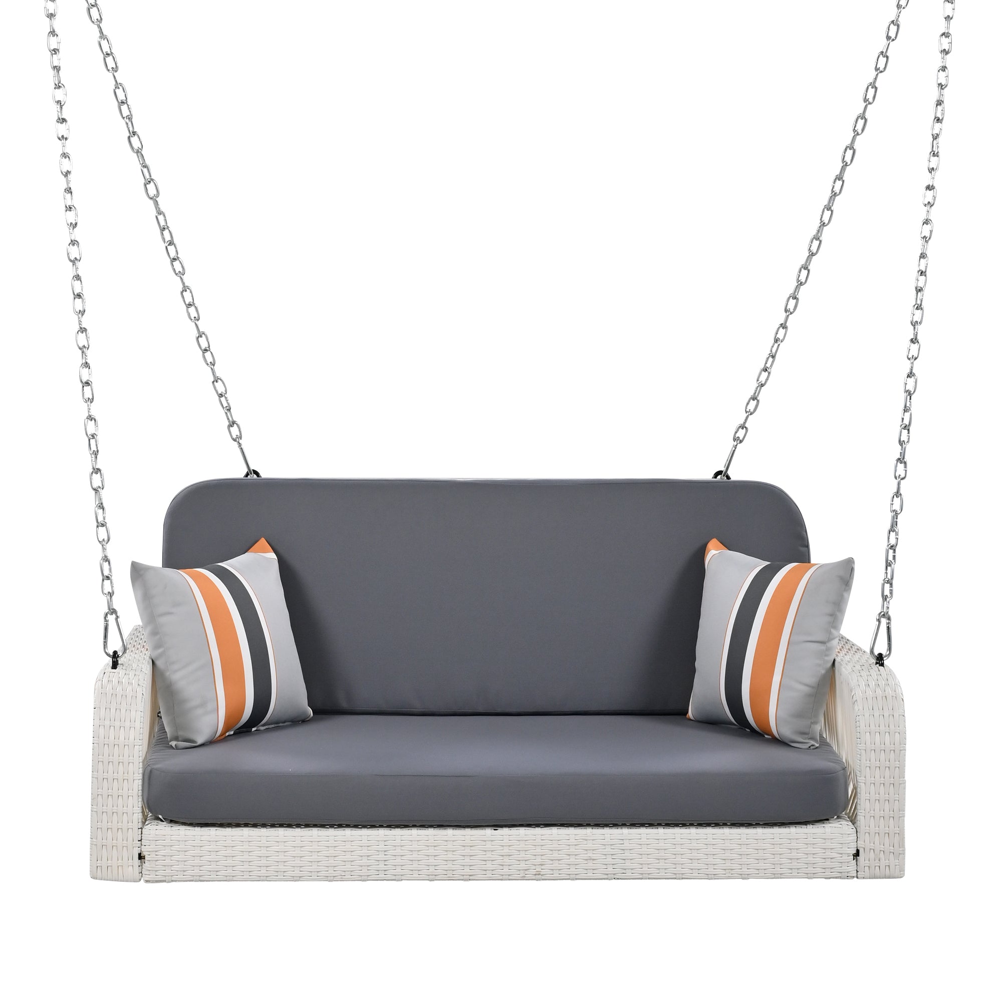 PE Wicker Porch Swing, 2-Seater Hanging Bench With Chains, Patio Furniture Swing For Backyard Garden Poolside, White And Gray WF320681AAK-djyc