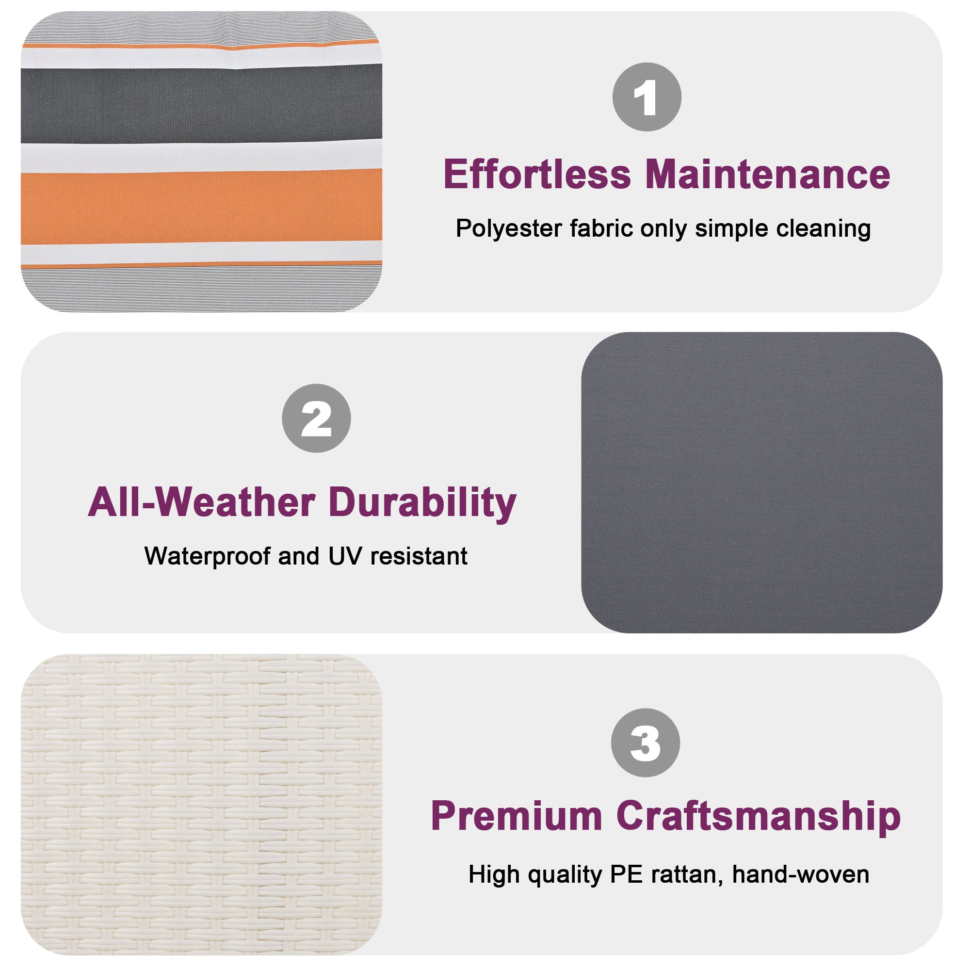- All Weather Design: Enveloped in hand-woven PE rattan, this swing is equipped to withstand the elements with ease. The breathable polyester covers are water repellent, guaranteeing that the swing will last for years.