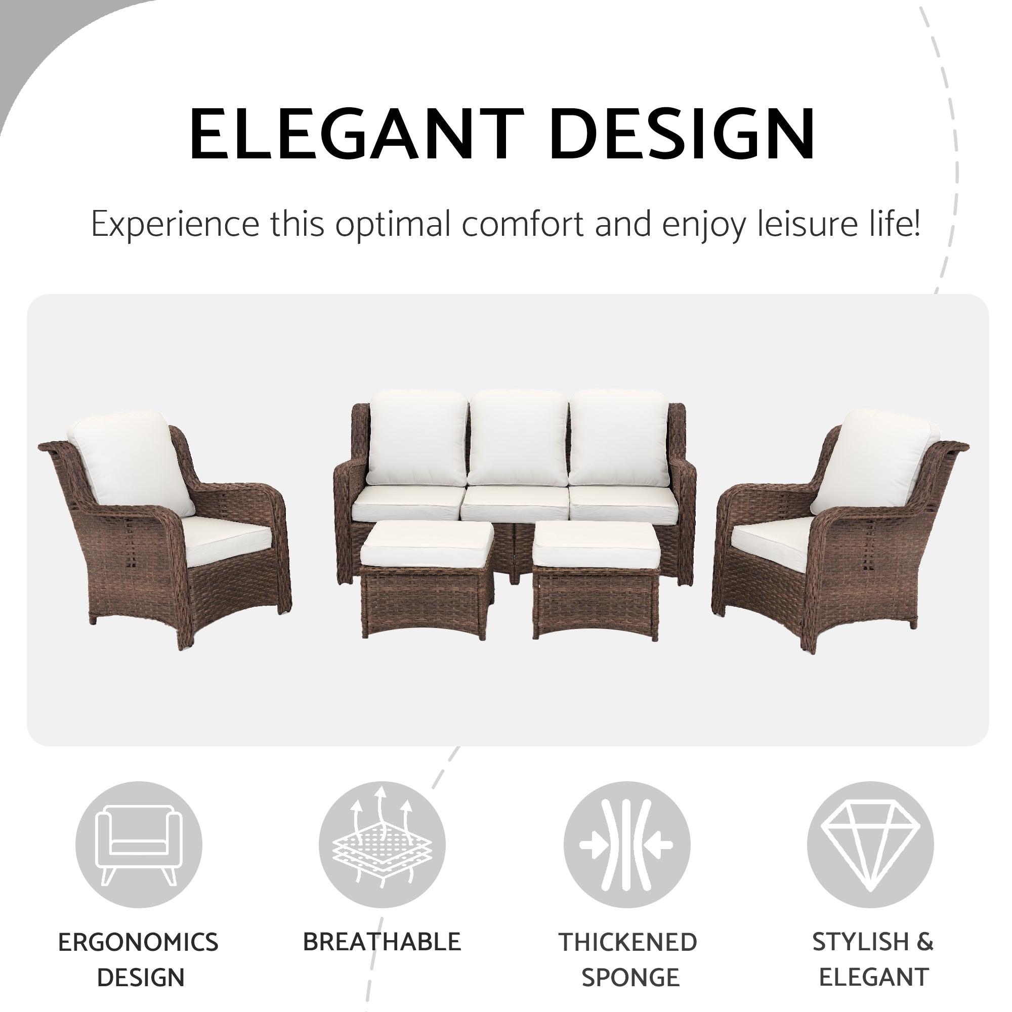 Patio Furniture Set Rattan Outdoor Sectional Conversation Sets 3-Seat Outdoor Couch,2 Single Chair and 2 Ottoman for Lawn, Balcony, Garden, Backyard (Bron-Off White, Set of 5) W1710S00256-djyc