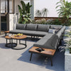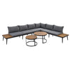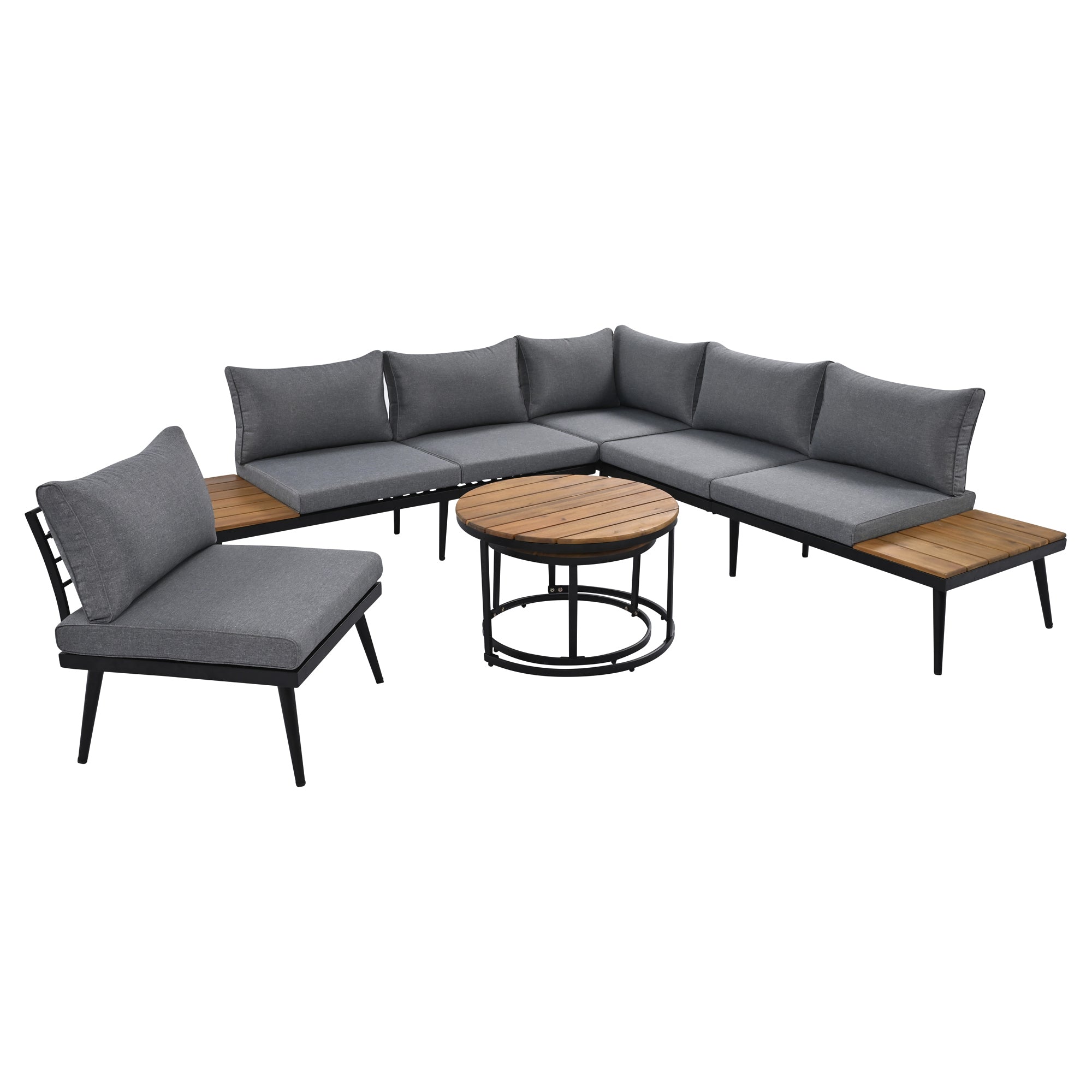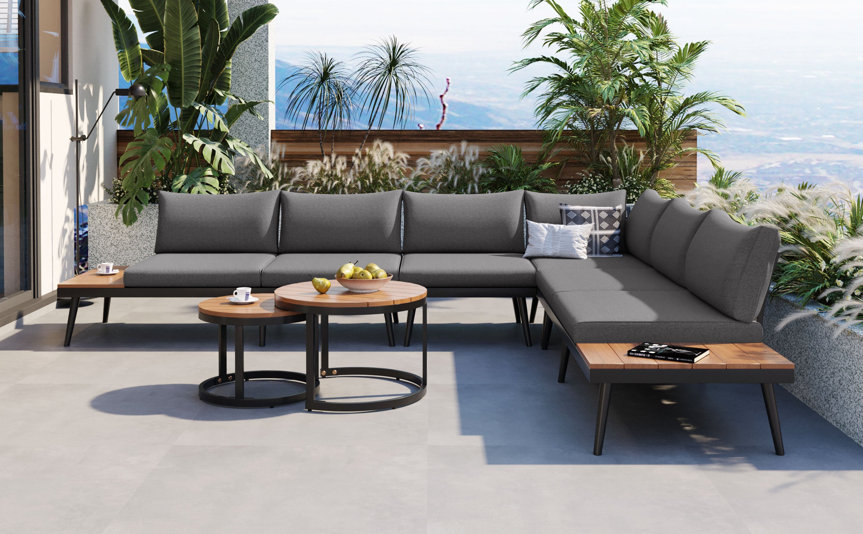 - Charming Modern Style: Soft sofa set and a sophisticated wooden coffee table add a functional and stylish element to your patio. The color of acacia wood is paired with gray or beige upholstery. The striped wooden table top also brings a natural and rustic feel. This modern patio sectional sofa set creates a strong summer atmosphere. It will become a great decoration that suits your outdoor style.