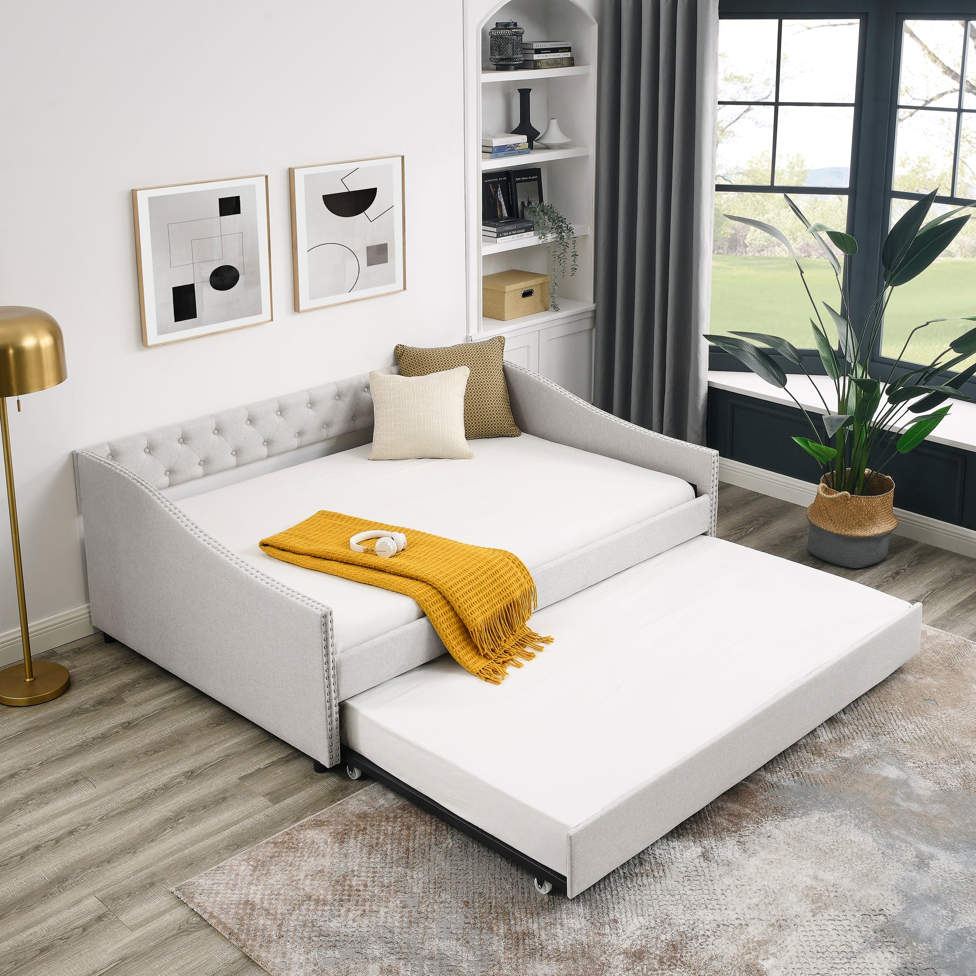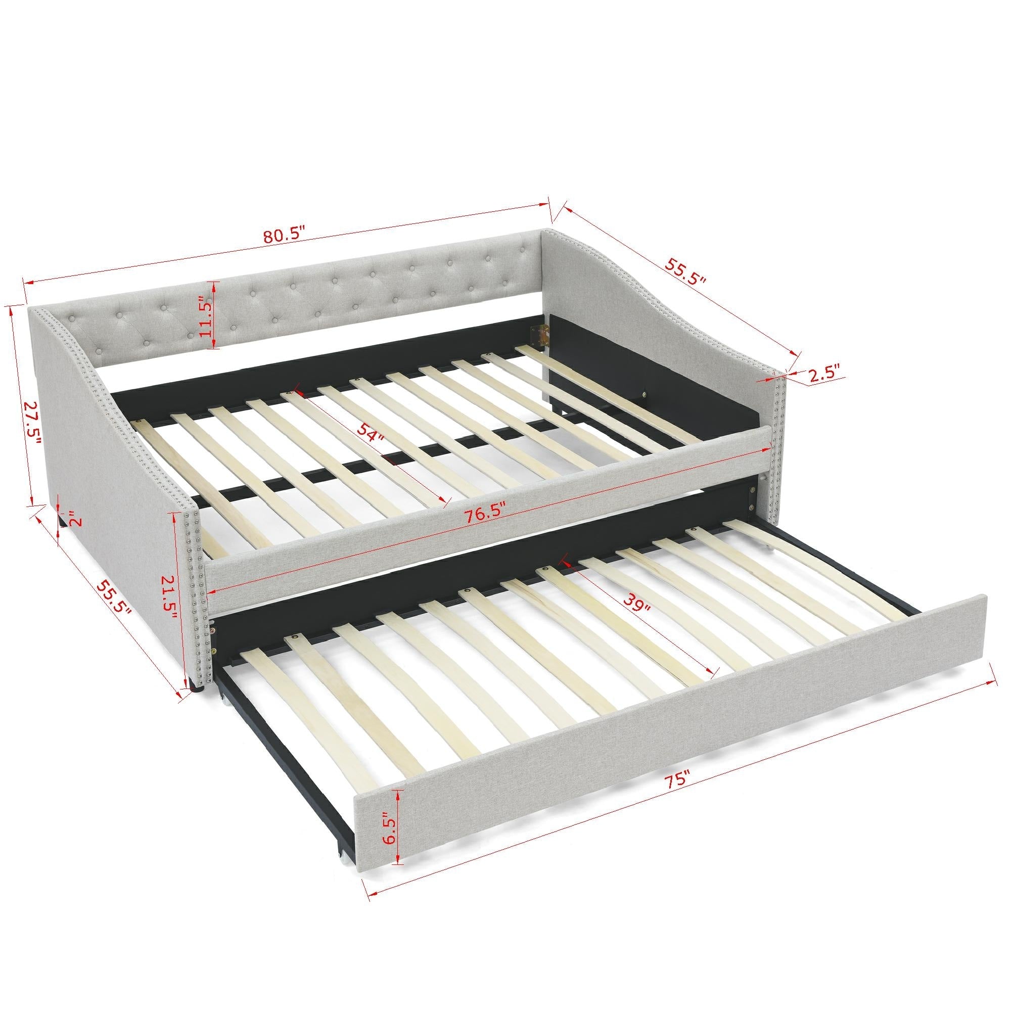 Full Size Daybed with Twin Size Trundle Upholstered Tufted Sofa Bed, with Button on Back and Copper Nail on Waved Shape Arms,Beige (80.5'x55.5'x27.5') W1413S00008-djyc