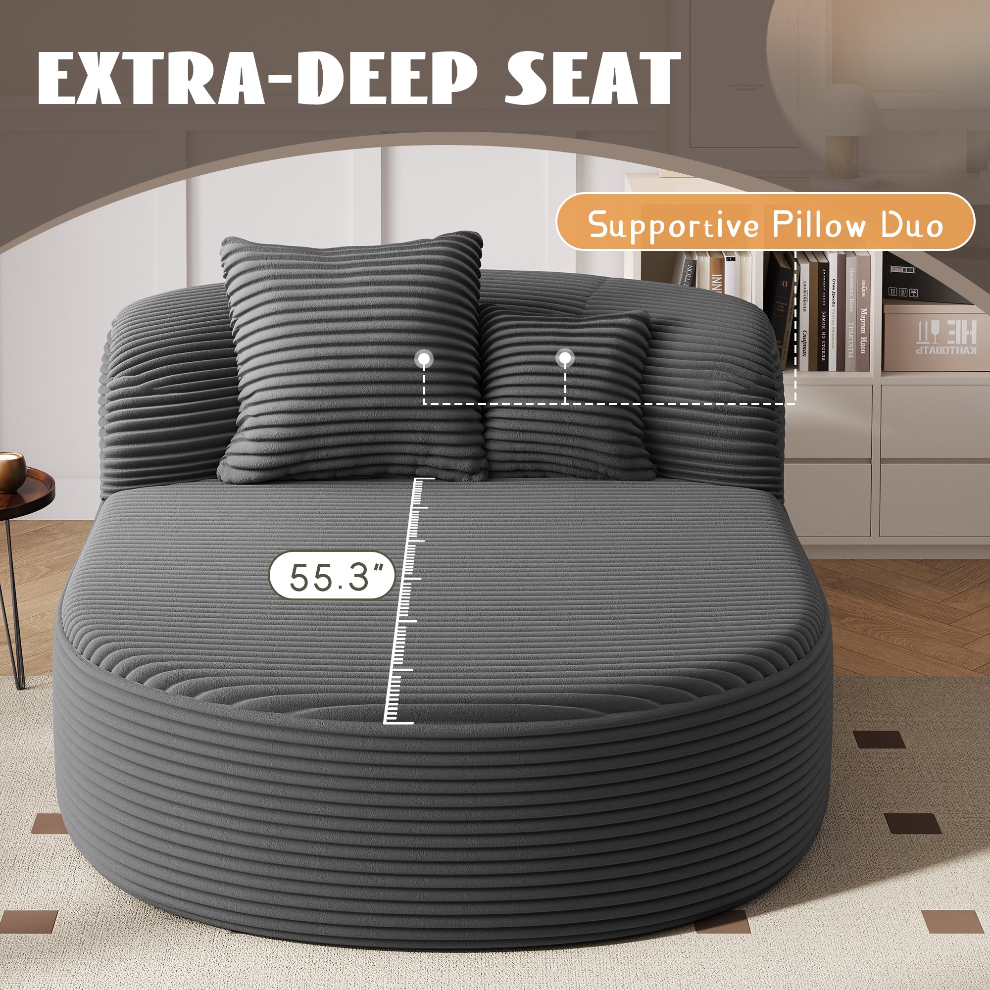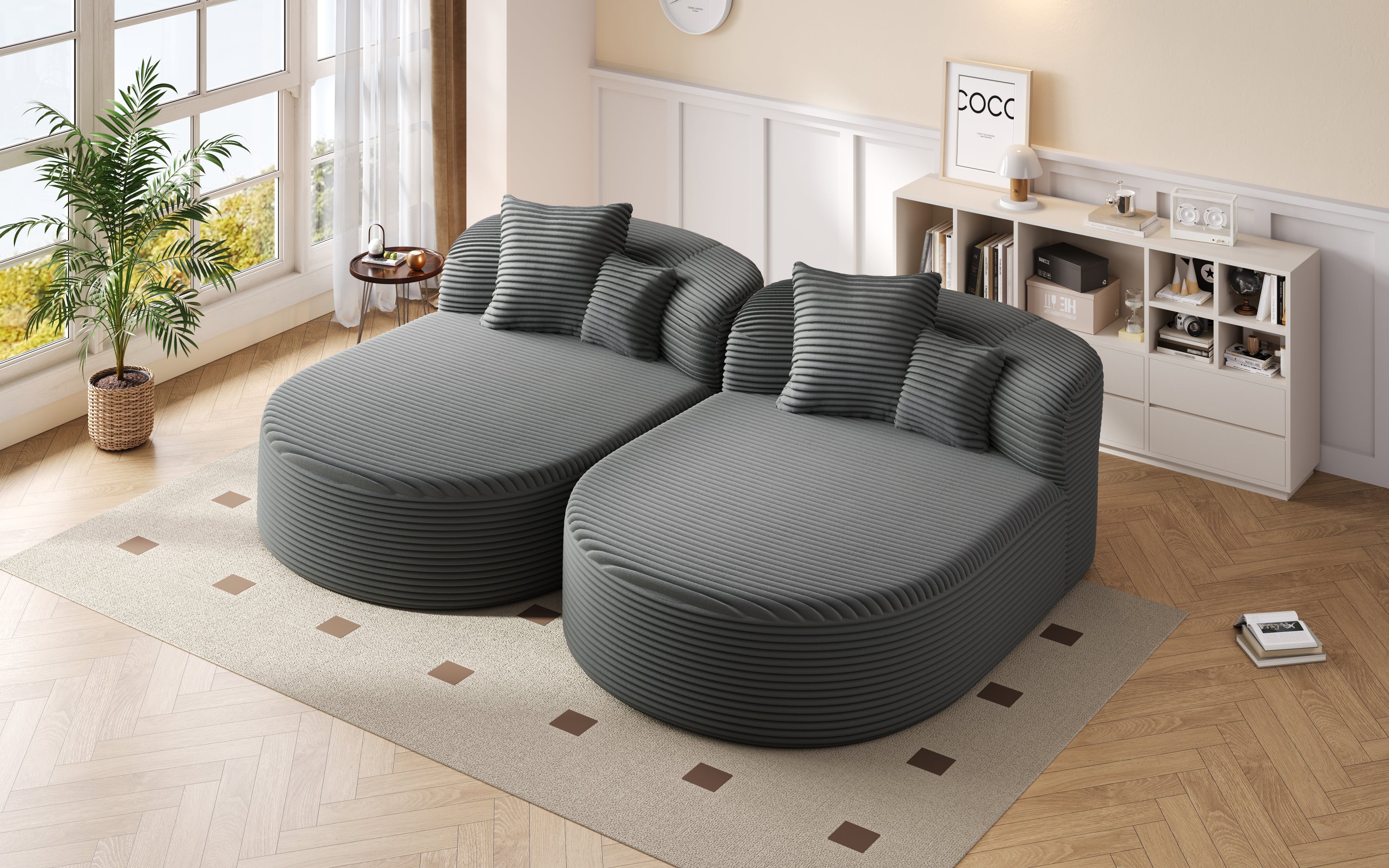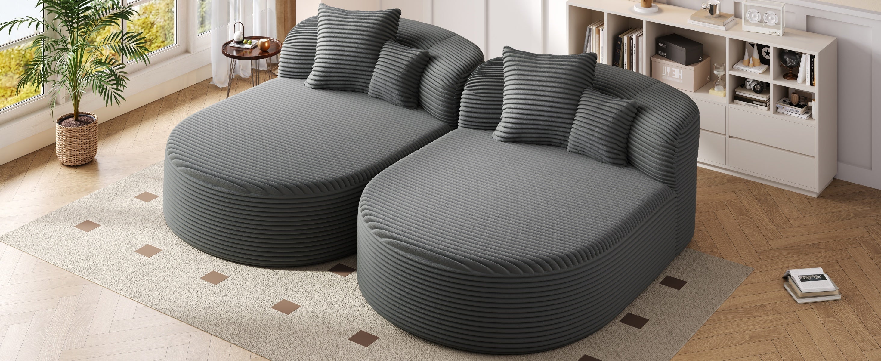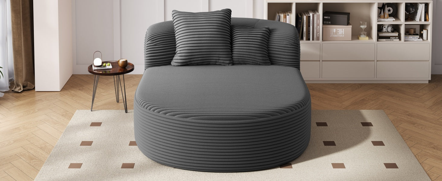 - Elegant Rounded Contour with Soft Corduroy Texture - The overall silhouette features a graceful curved arc that softens the look and adds a sculptural statement to your living space. Upholstered in ultra-soft corduroy fabric, the surface provides a warm, ribbed texture that’s both visually stylish and inviting to the touch, perfectly blending comfort and modern aesthetics.