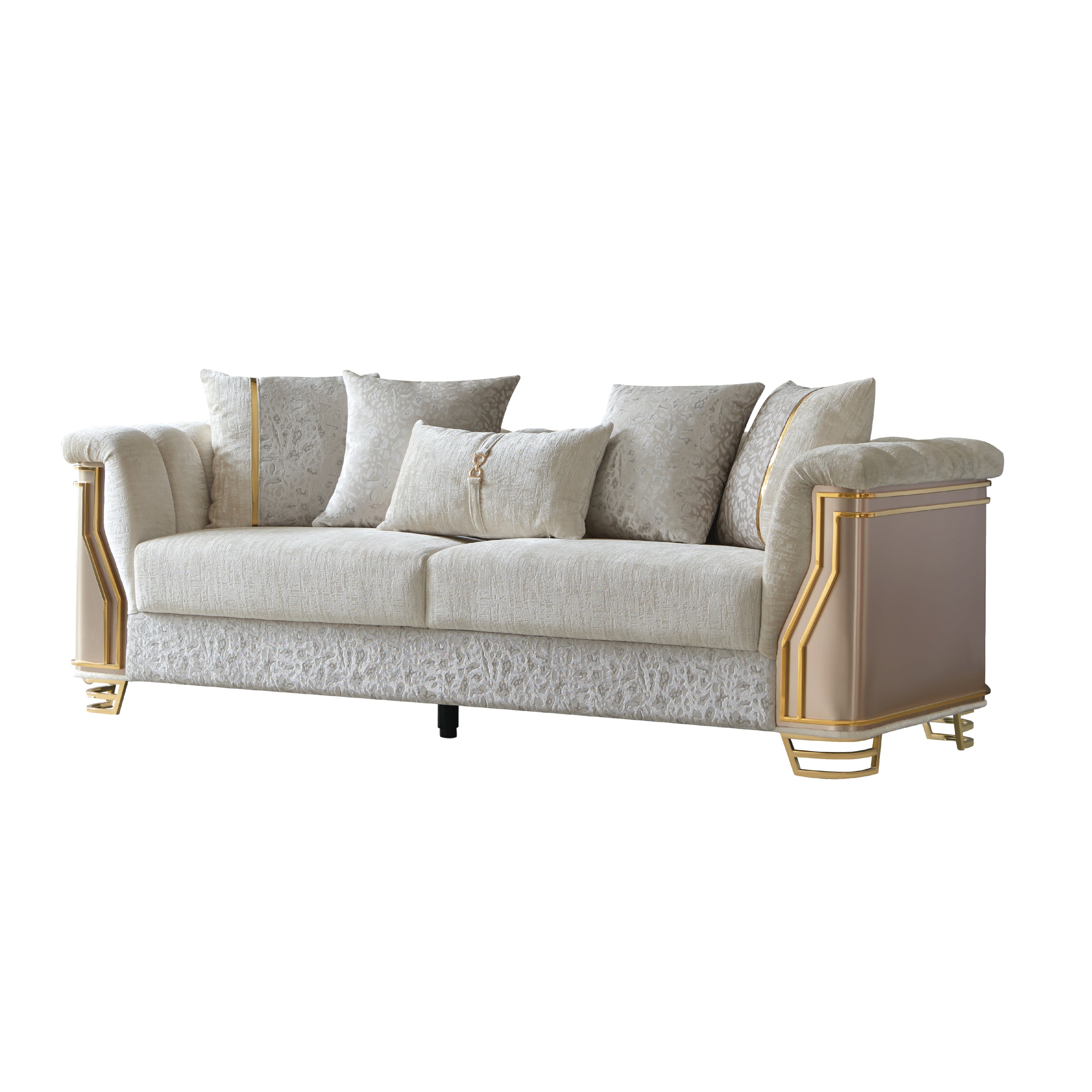 Chateau Two-Tone Wood Upholstery Sofa with Modern Flawless Design, Stainless Steel Gold Accents, and Cream Finish-B009P417488
