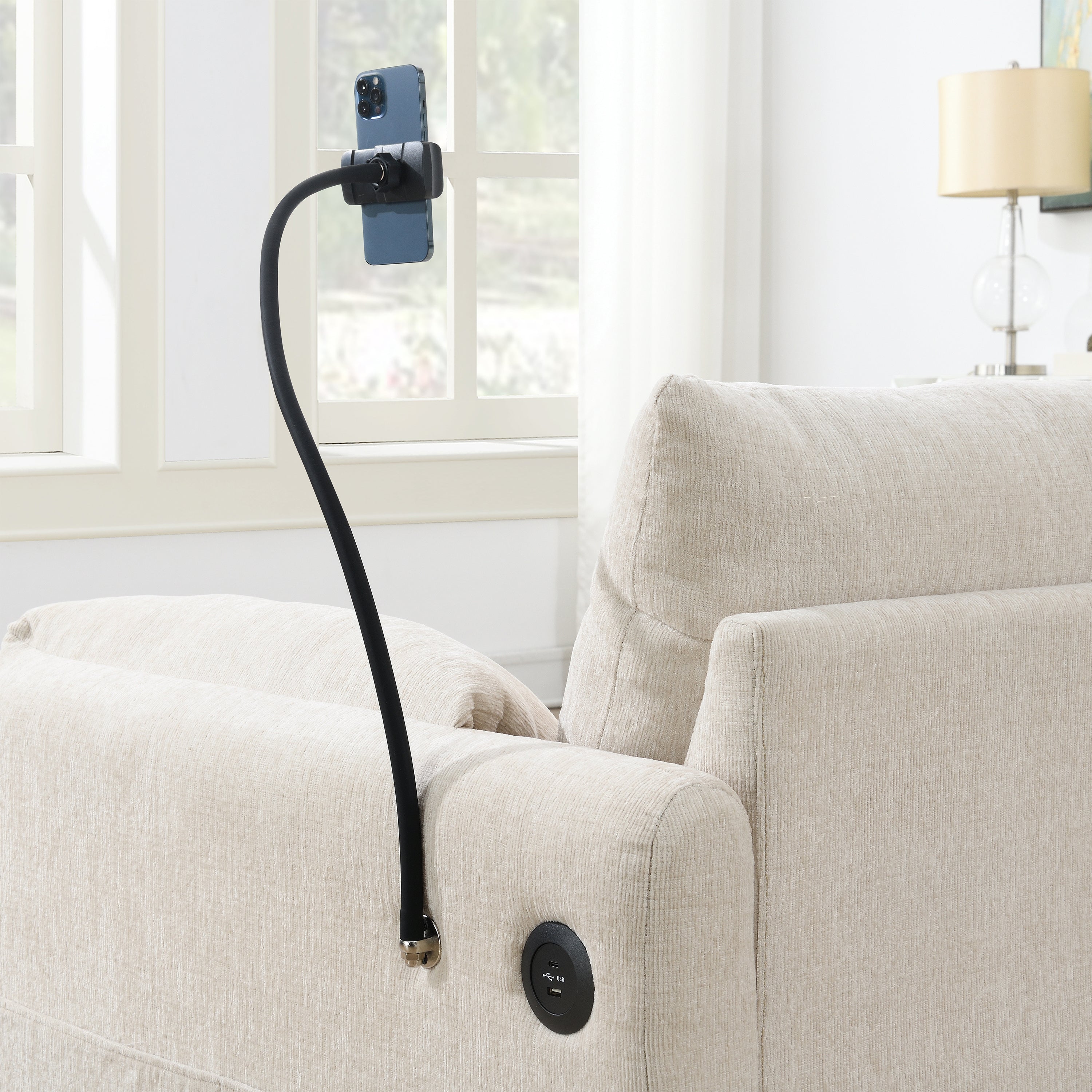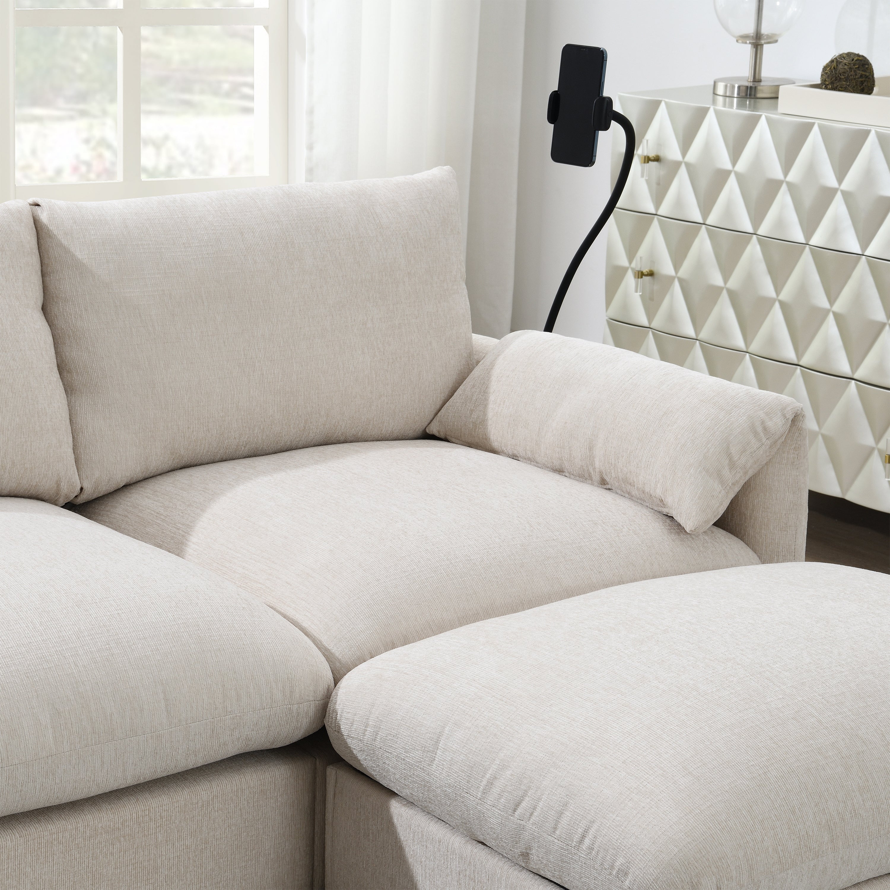 - Adjustable Phone Holder: Designed with convenience in mind, this sofa includes an adjustable phone holder. Whether you’re watching videos, making video calls, or just keeping your phone within easy reach, this flexible holder allows you to position your phone at the ideal angle for comfort and hands-free use.
