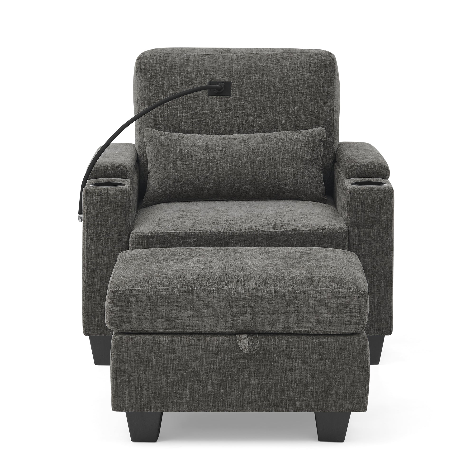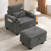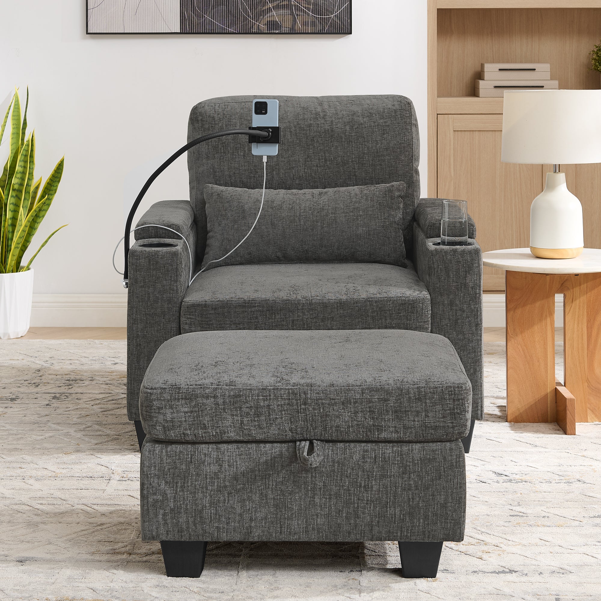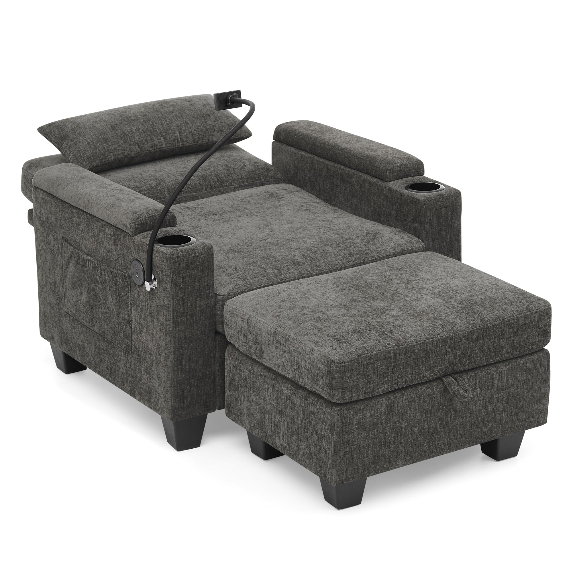 Single sofa recliner with manually adjustable backrest, USB charging port on the armrest side, phone stand included, hidden armrest storage, and a matching storage ottoman-Gray-W487P423648