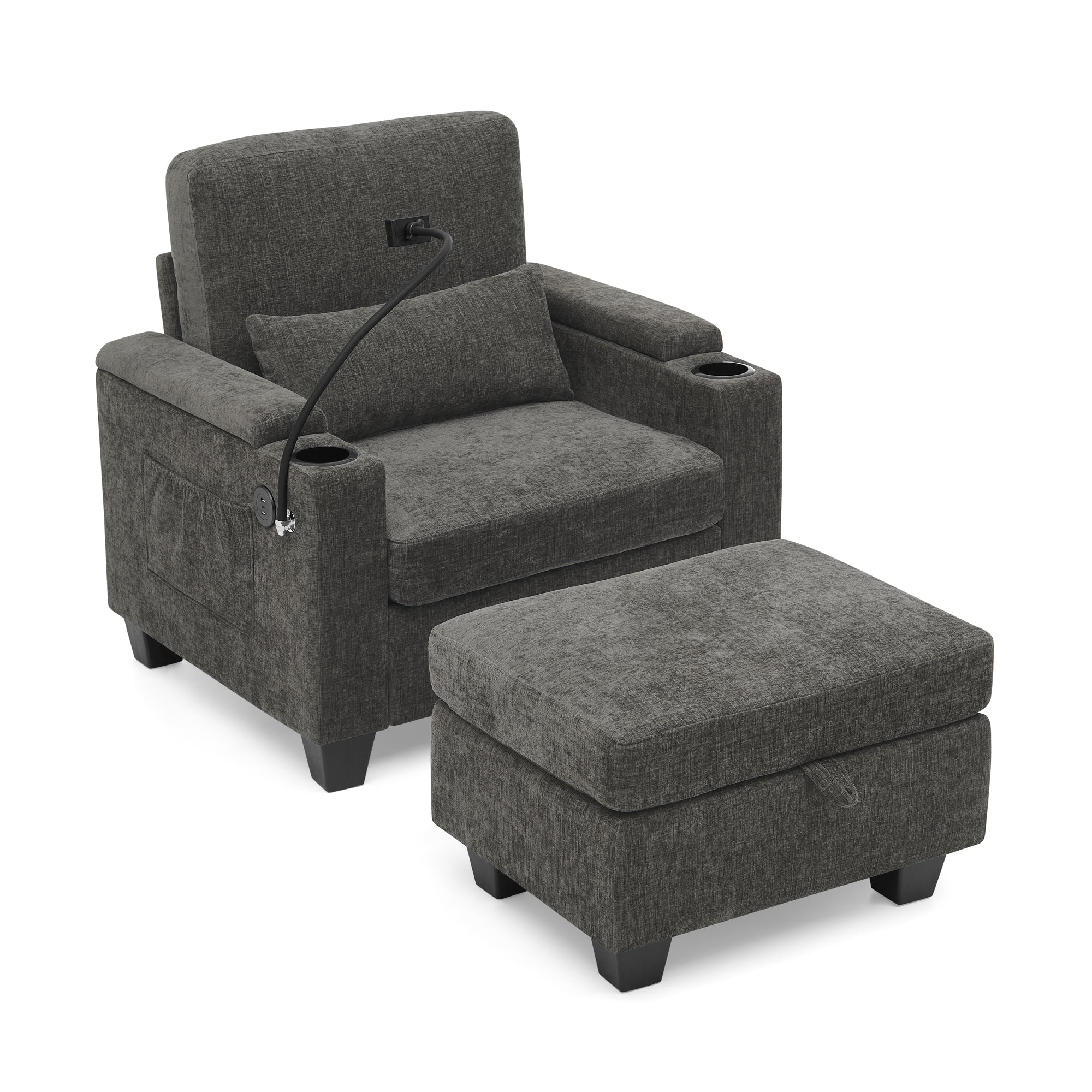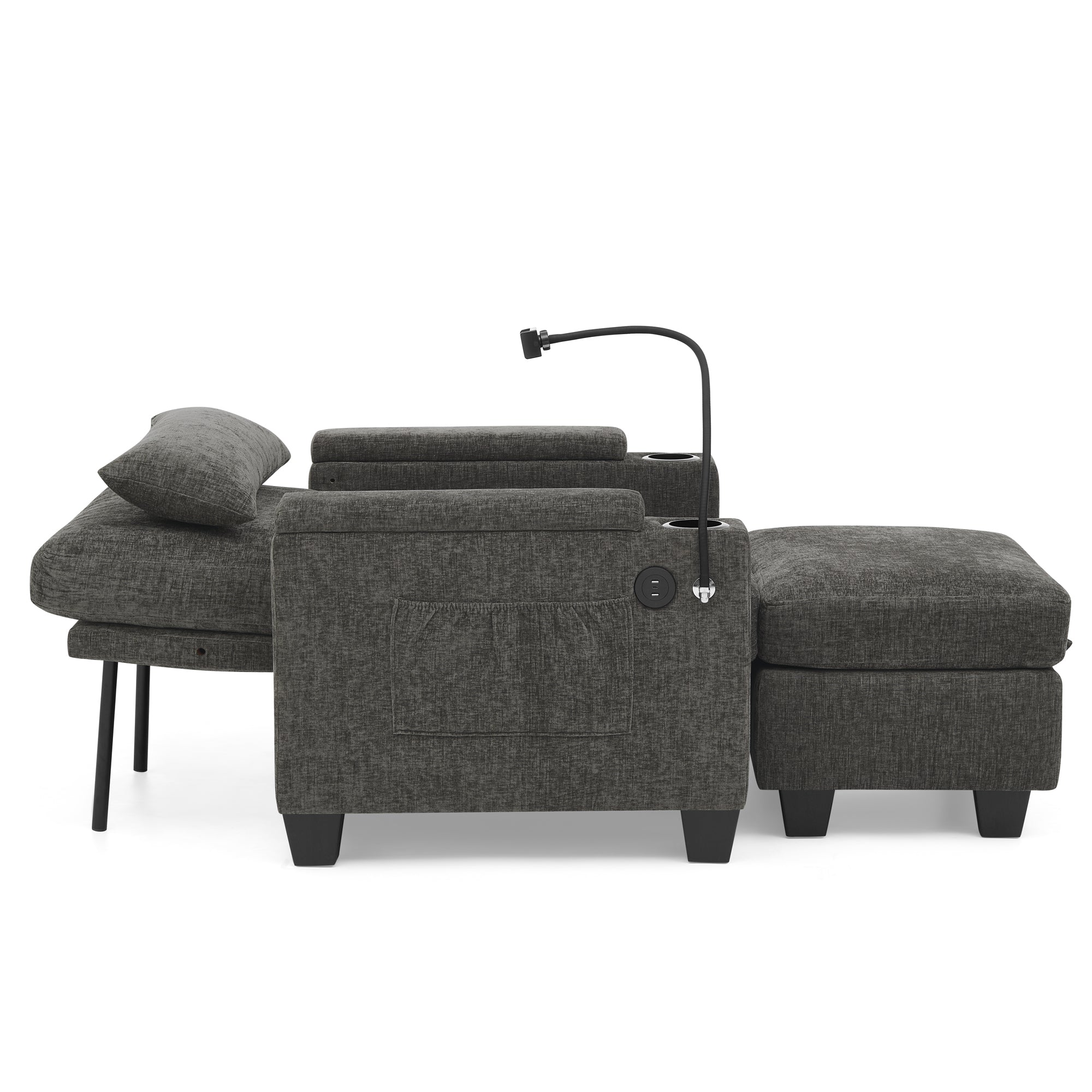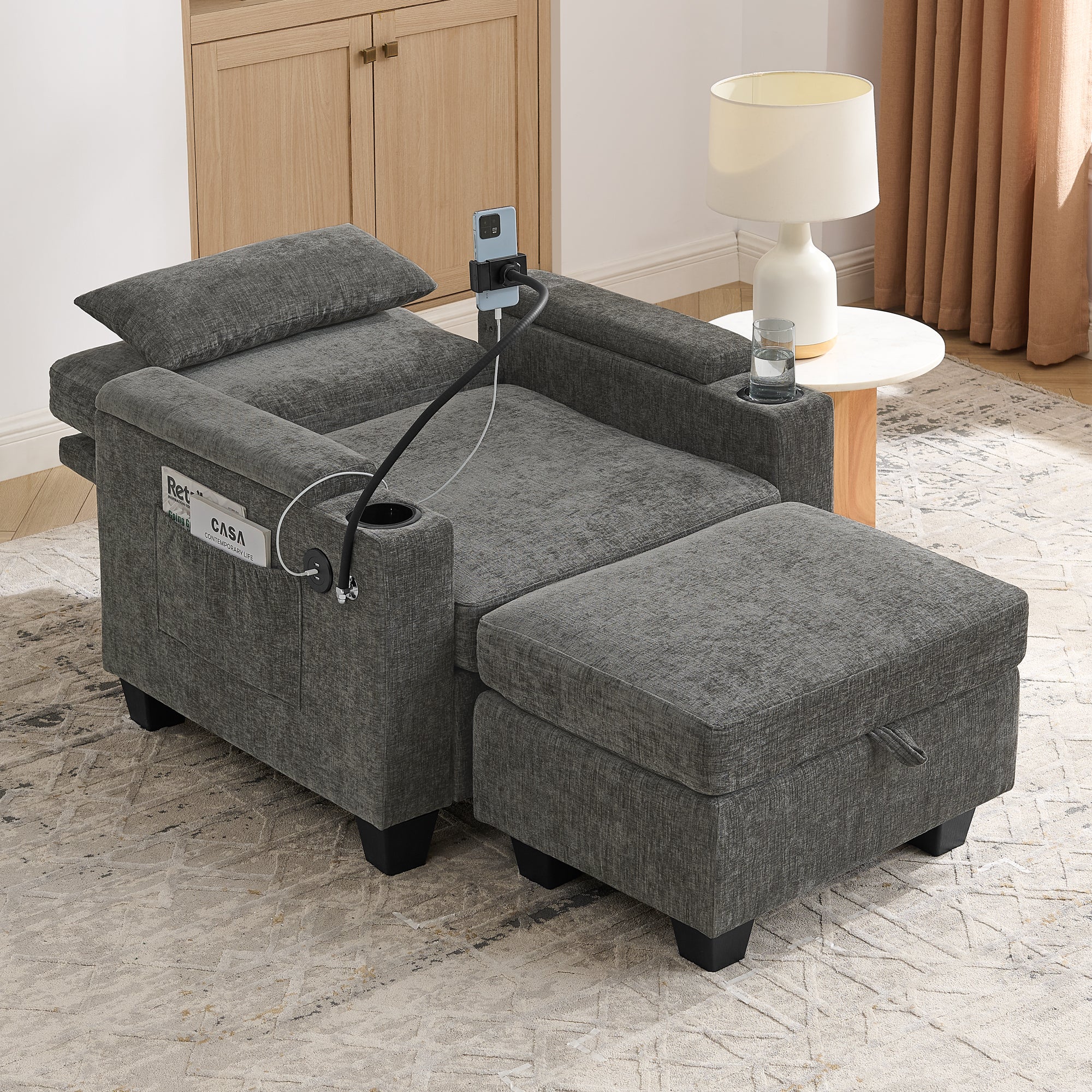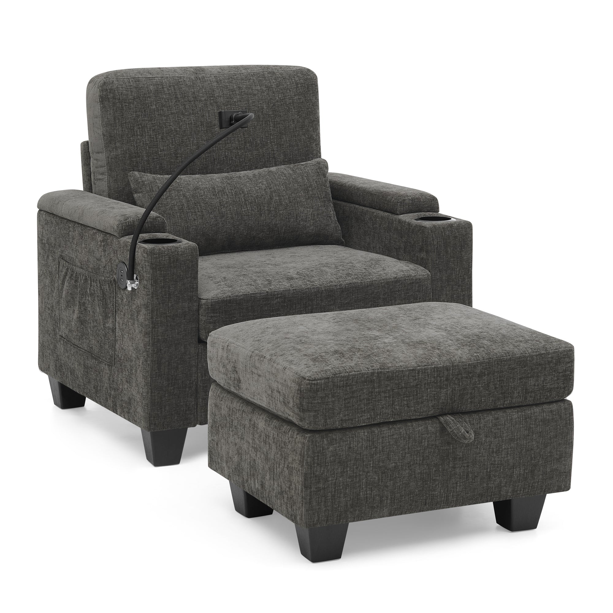 Single sofa recliner with manually adjustable backrest, USB charging port on the armrest side, phone stand included, hidden armrest storage, and a matching storage ottoman-Gray-W487P423648