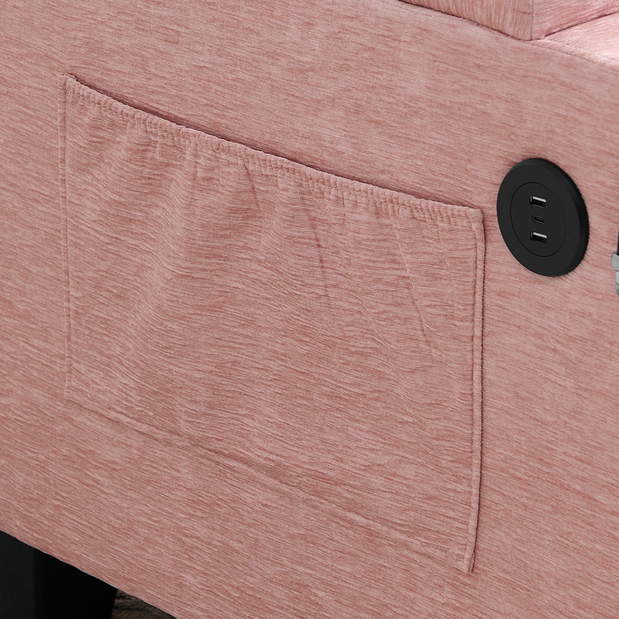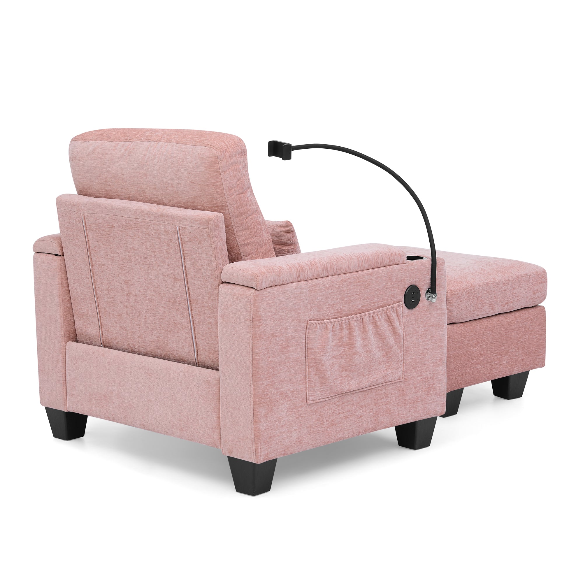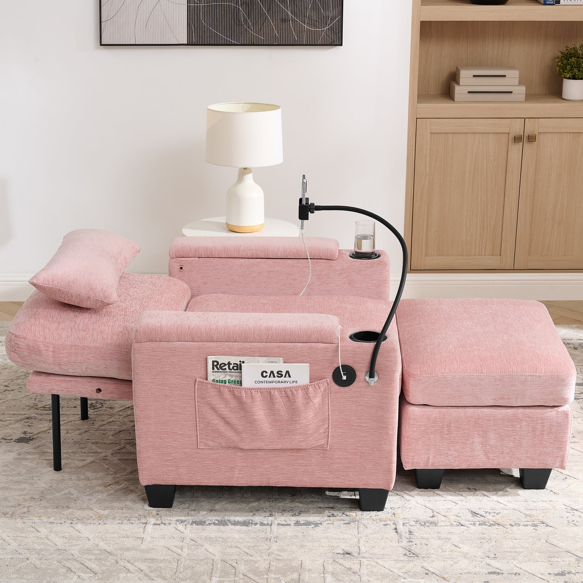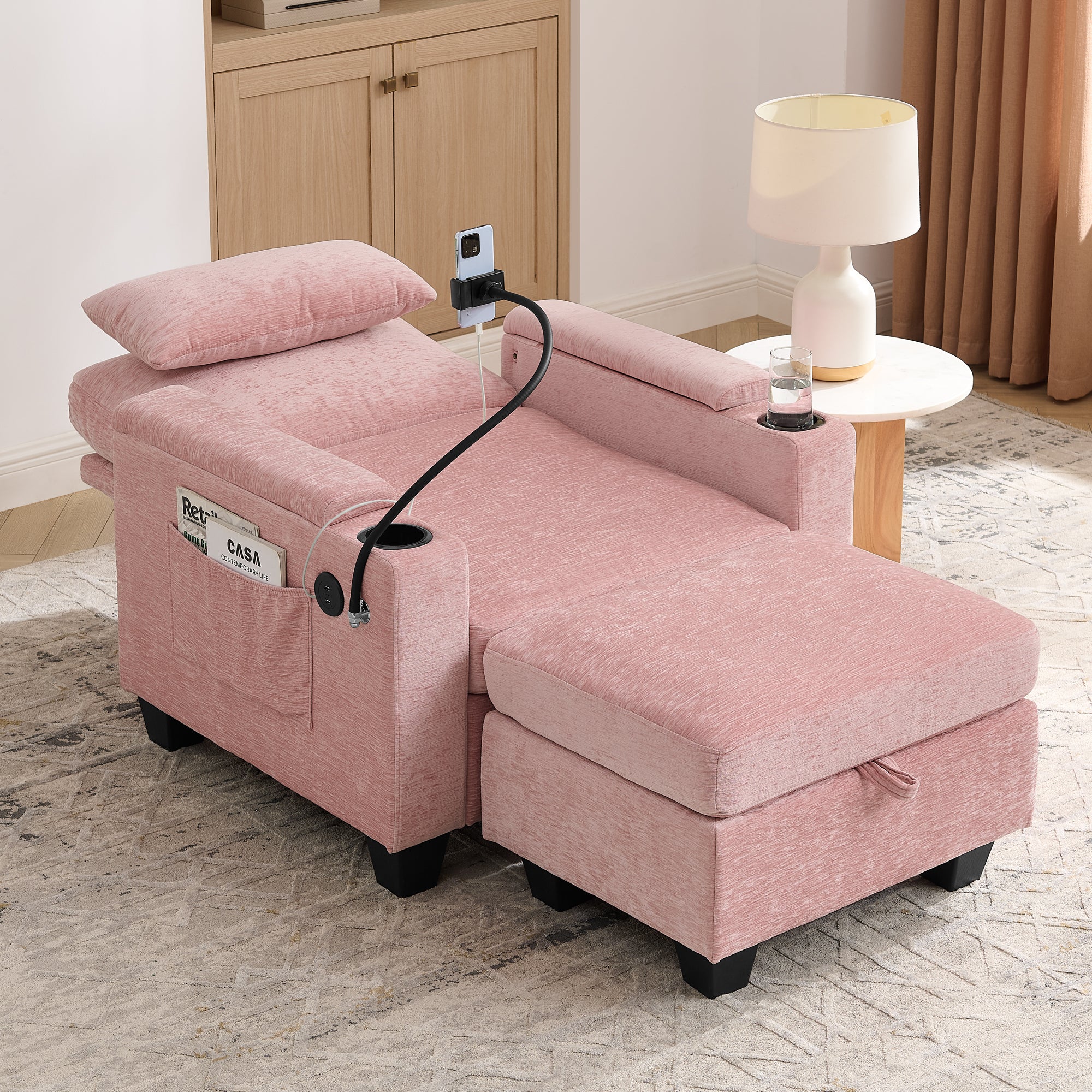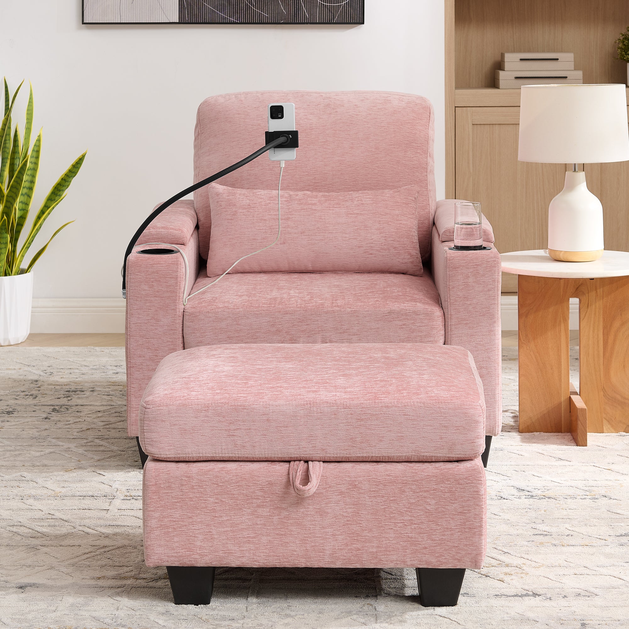 Single sofa recliner with manually adjustable backrest, USB charging port on the armrest side, phone stand included, hidden armrest??W487P423652 storage, and a matching storage ottoman-Pink