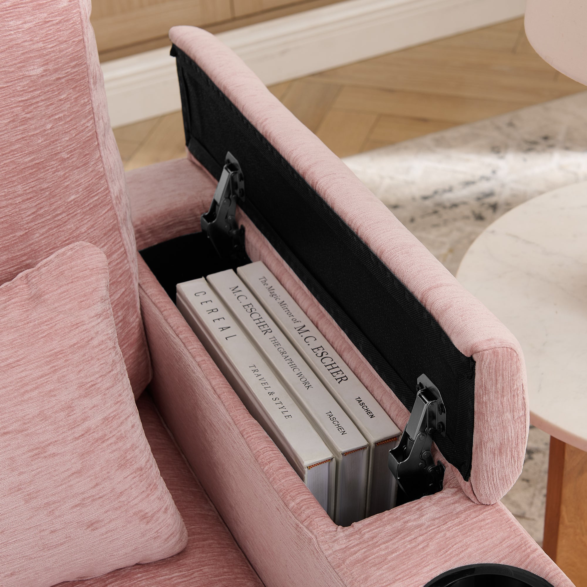- Dual Hidden Storage Spaces: The right armrest has a hidden compartment (easily opened with a light push/pull) for small valuables like glasses, keys or charging cables, blending aesthetics with practicality. The matching ottoman not only relieves leg pressure but also features a lift-top storage area, perfect for blankets, pillows and seasonal items to maximize space utilization.