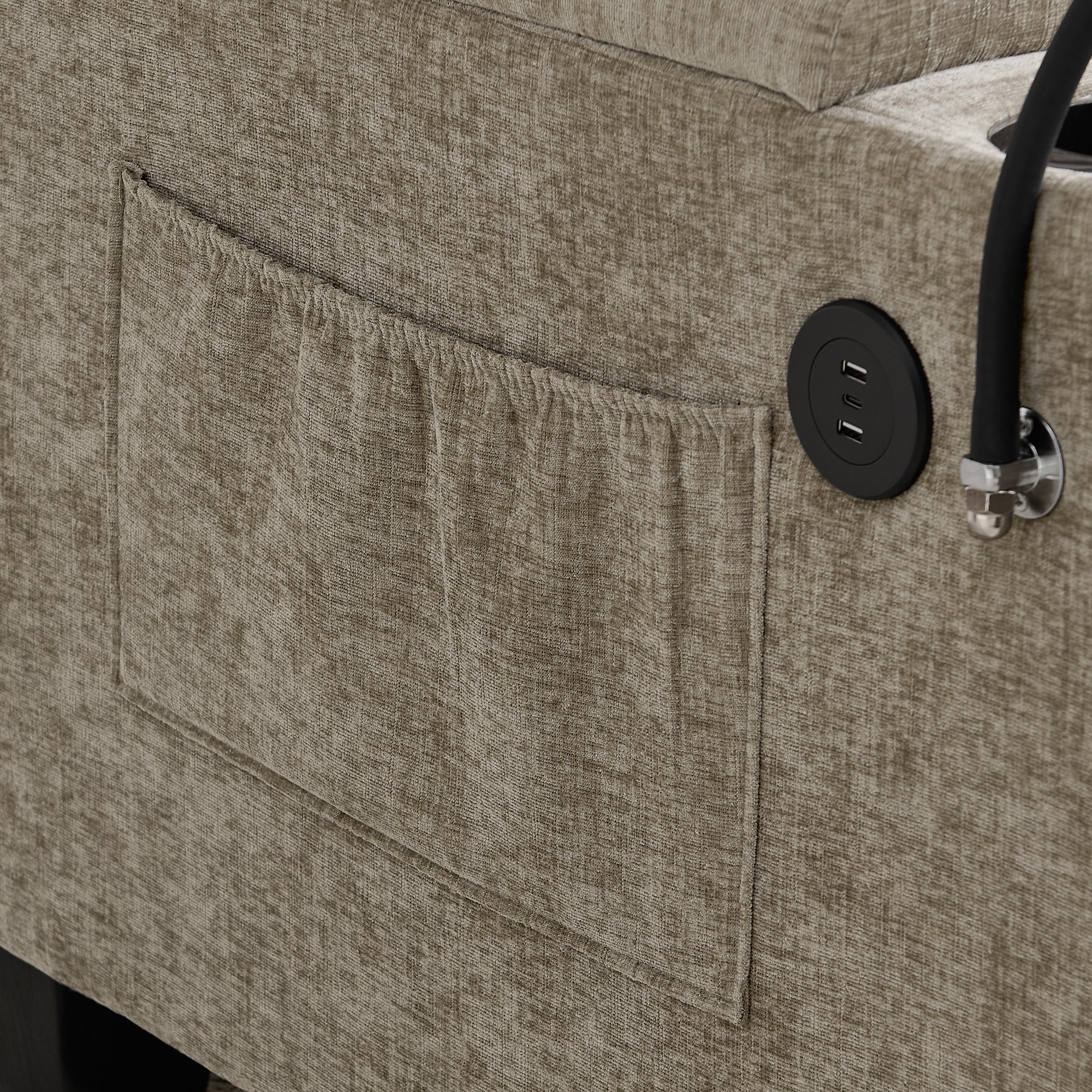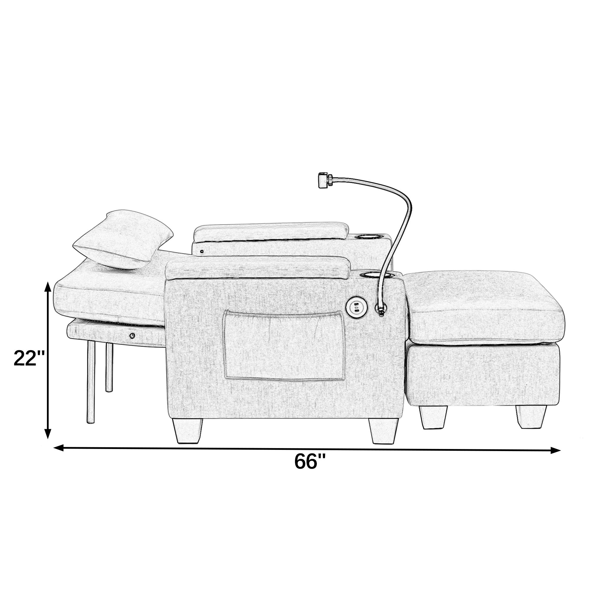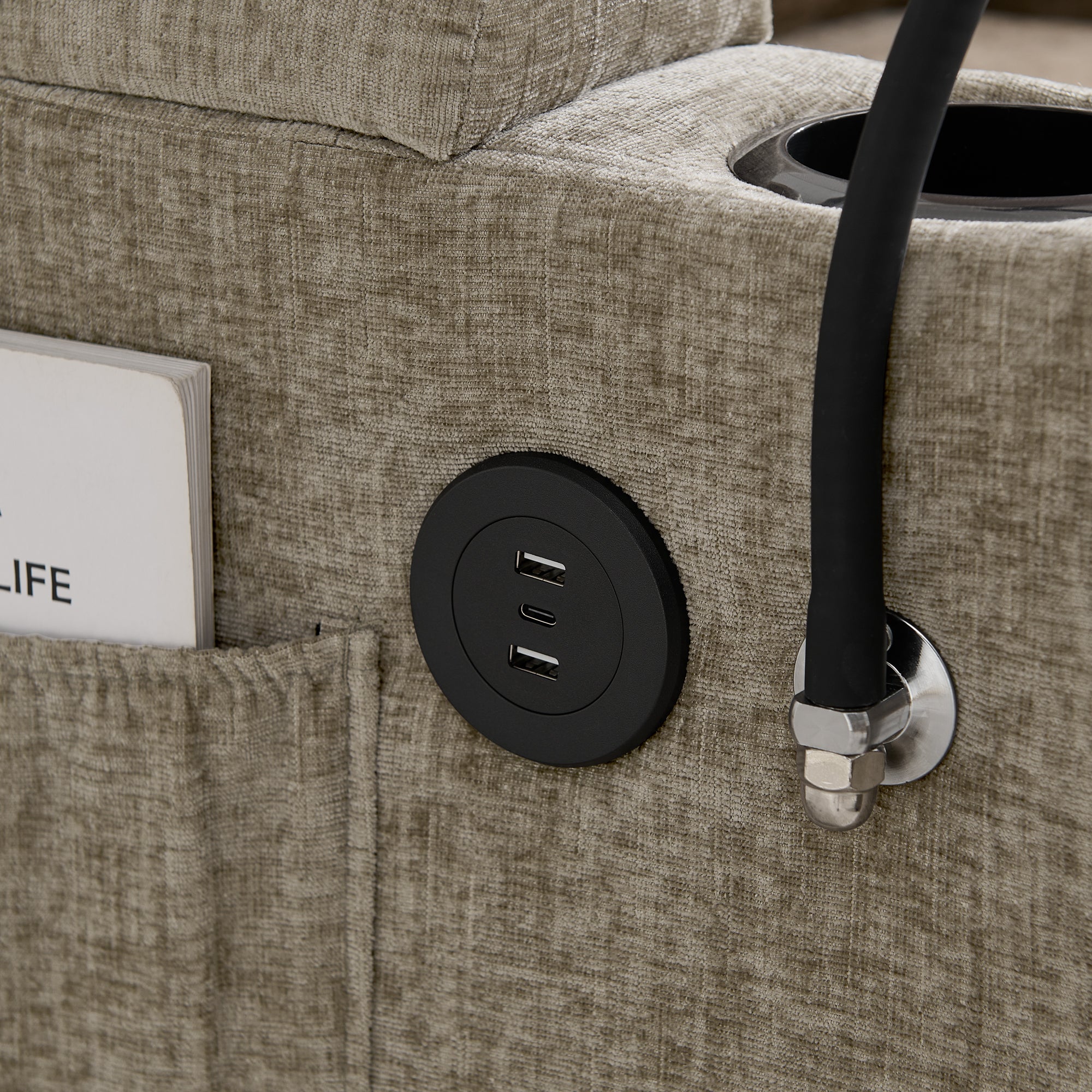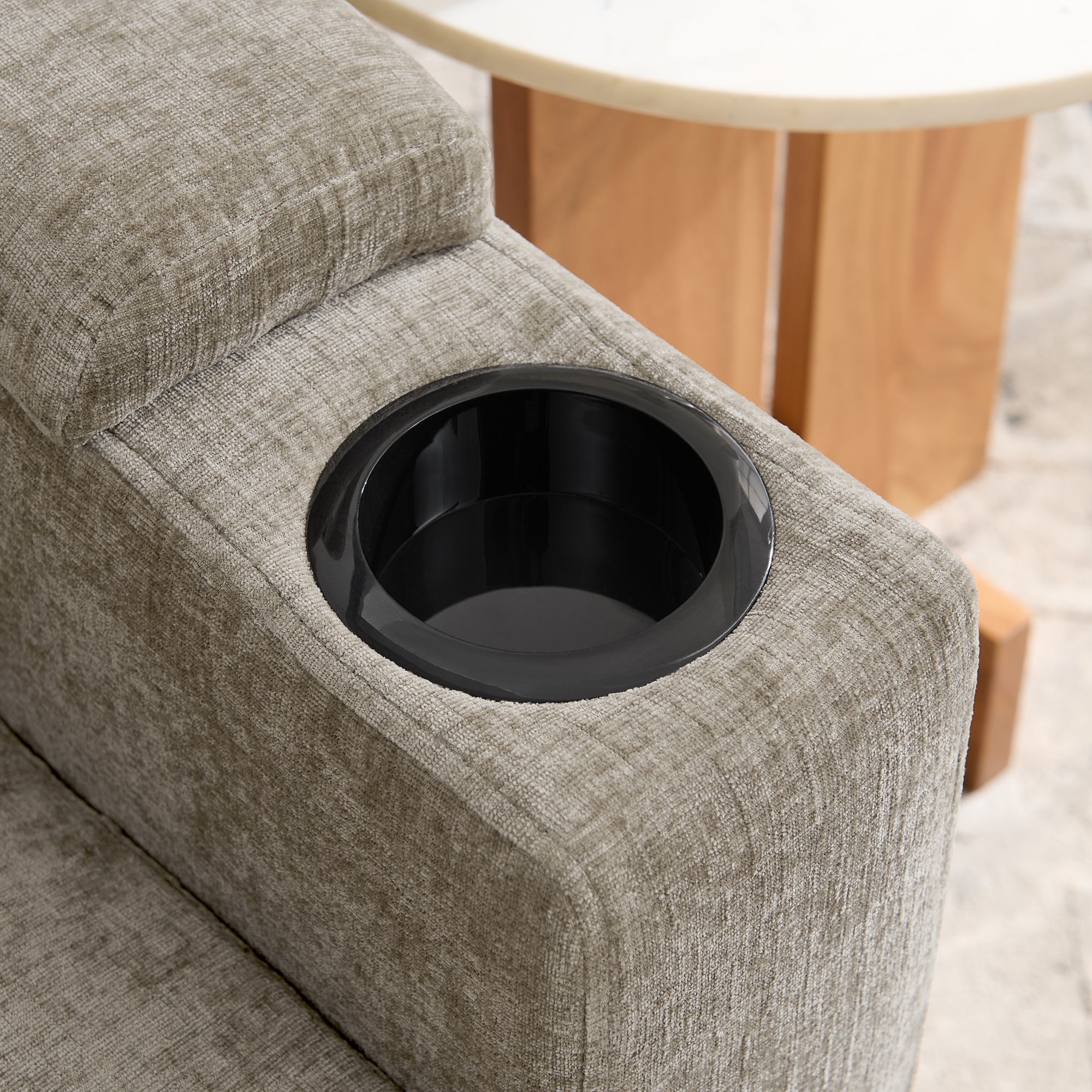 - Dual Side Cup Holders & USB Charging Port: Built-in cup holders are installed on both sides of the sofa armrests, designed for daily drinks like water cups, cola cans and coffee cups, with moderate depth and stable support to prevent tipping. Additionally, a USB data cable interface is integrated into the side of the armrest, offering convenient charging for mobile phones, tablets or earbuds?eliminating the hassle of searching for a power socket and ensuring uninterrupted relaxation.