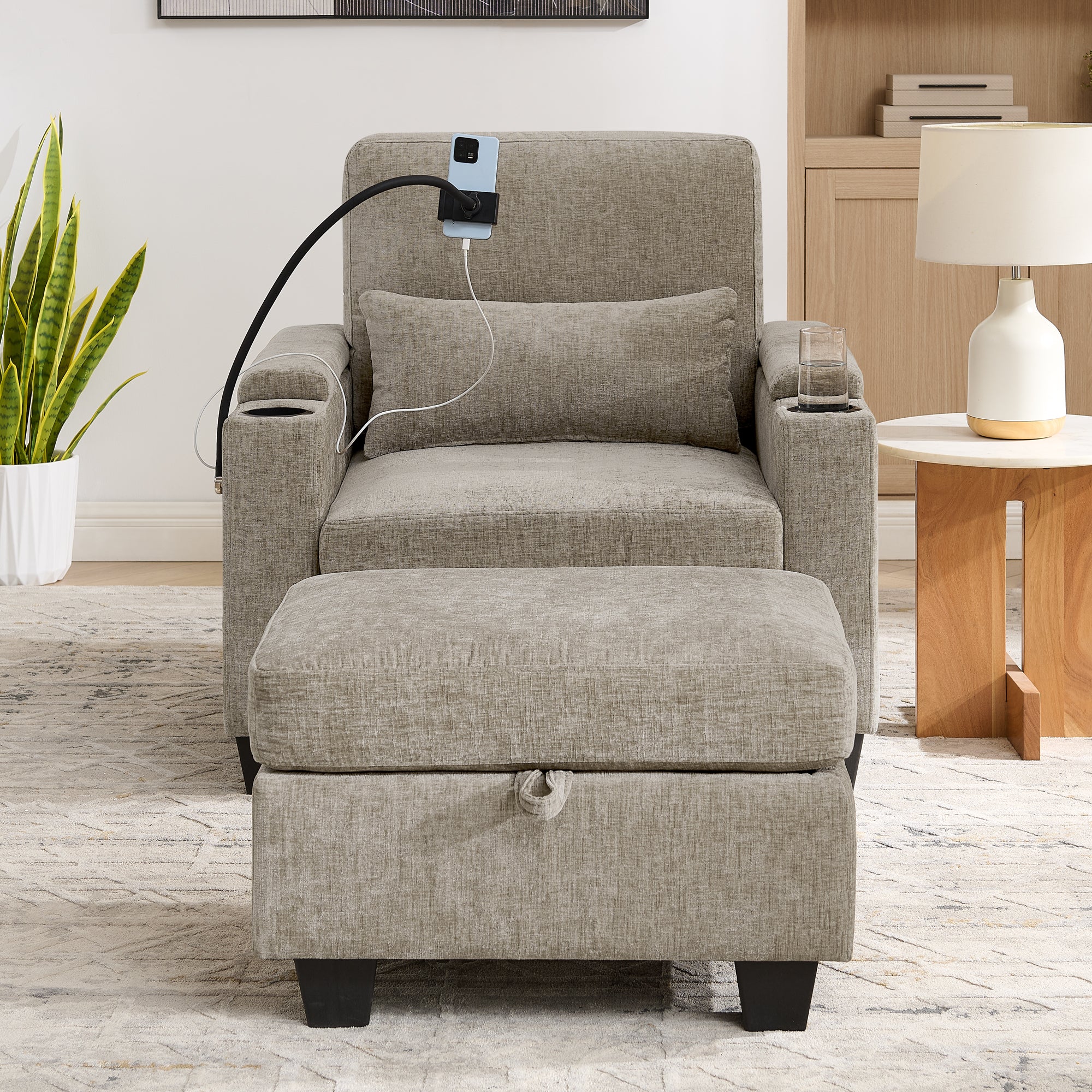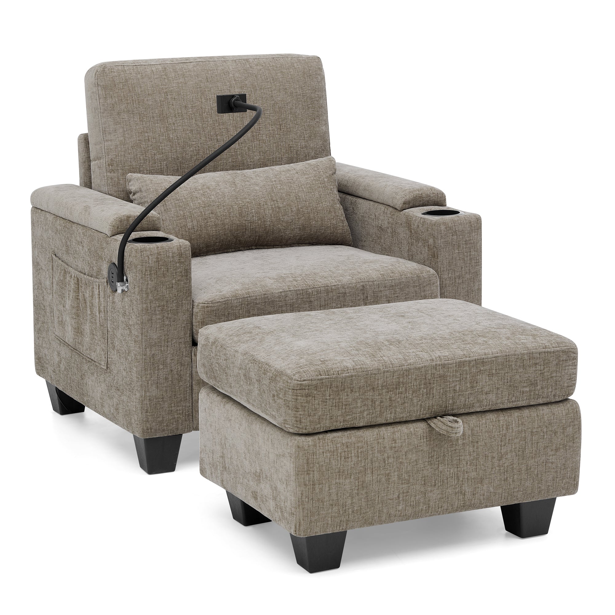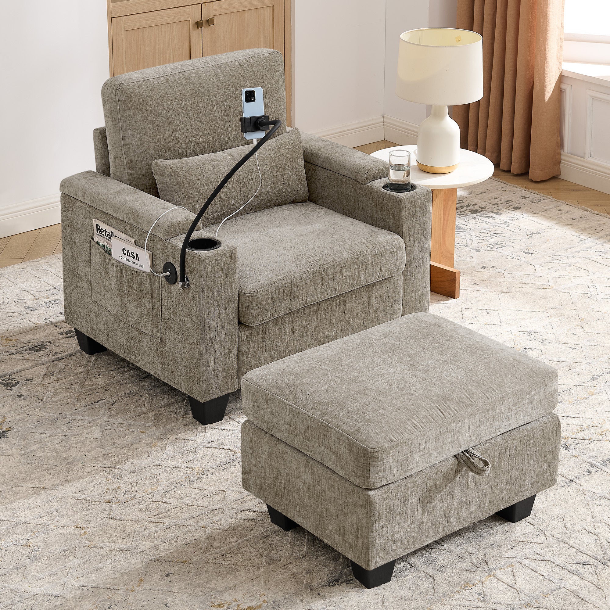 - Dual Hidden Storage Spaces: The right armrest has a hidden compartment (easily opened with a light push/pull) for small valuables like glasses, keys or charging cables, blending aesthetics with practicality. The matching ottoman not only relieves leg pressure but also features a lift-top storage area, perfect for blankets, pillows and seasonal items to maximize space utilization.