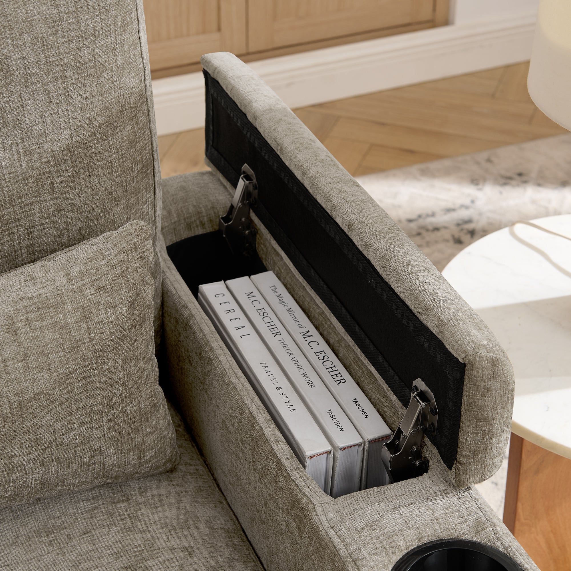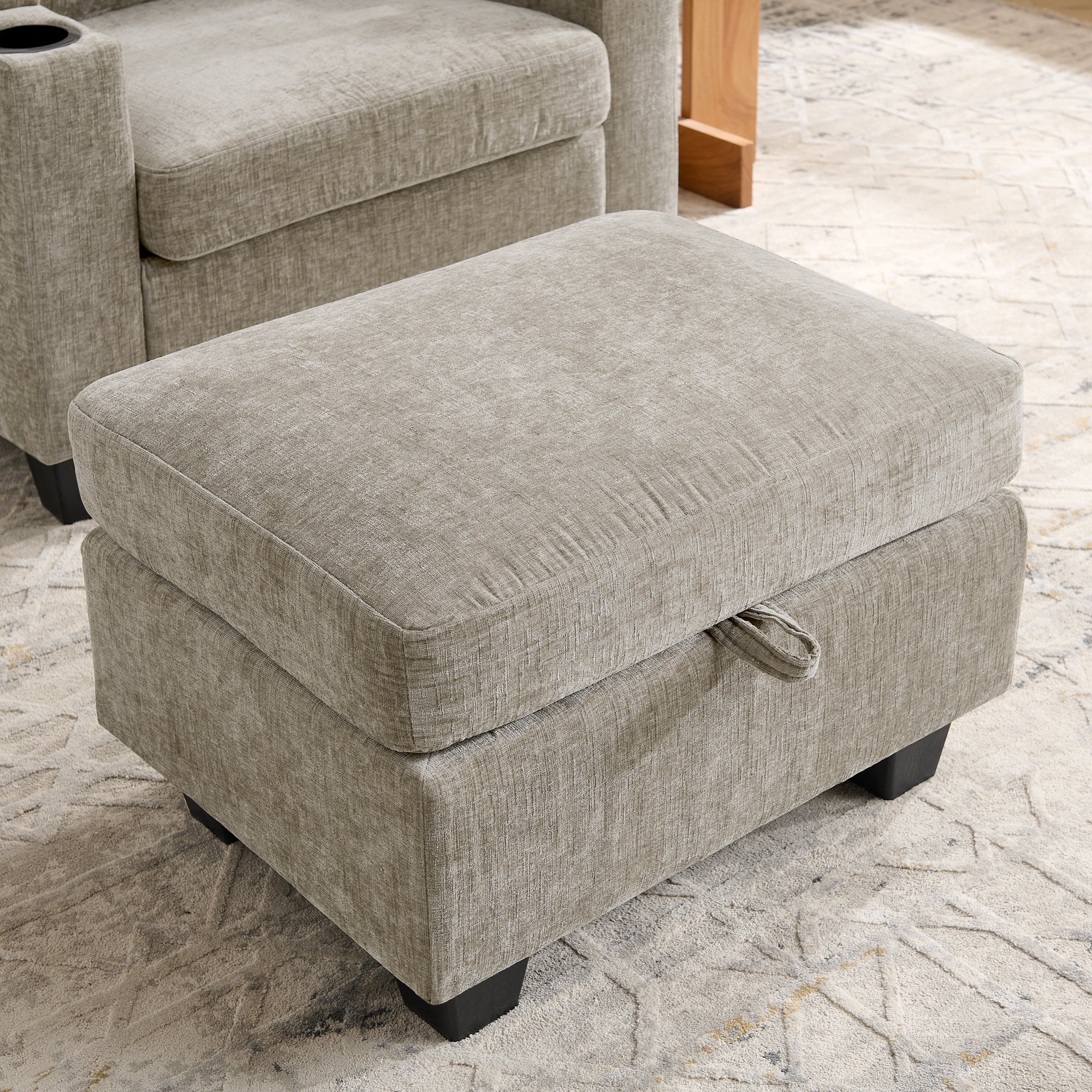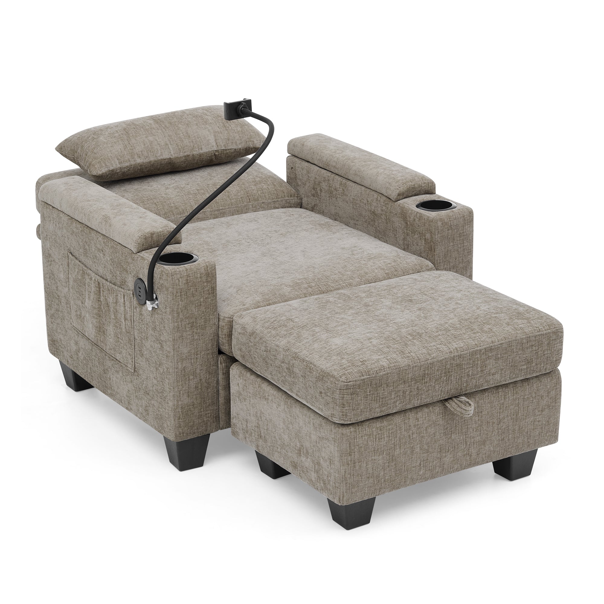 - Dual Hidden Storage Spaces: The right armrest has a hidden compartment (easily opened with a light push/pull) for small valuables like glasses, keys or charging cables, blending aesthetics with practicality. The matching ottoman not only relieves leg pressure but also features a lift-top storage area, perfect for blankets, pillows and seasonal items to maximize space utilization.
