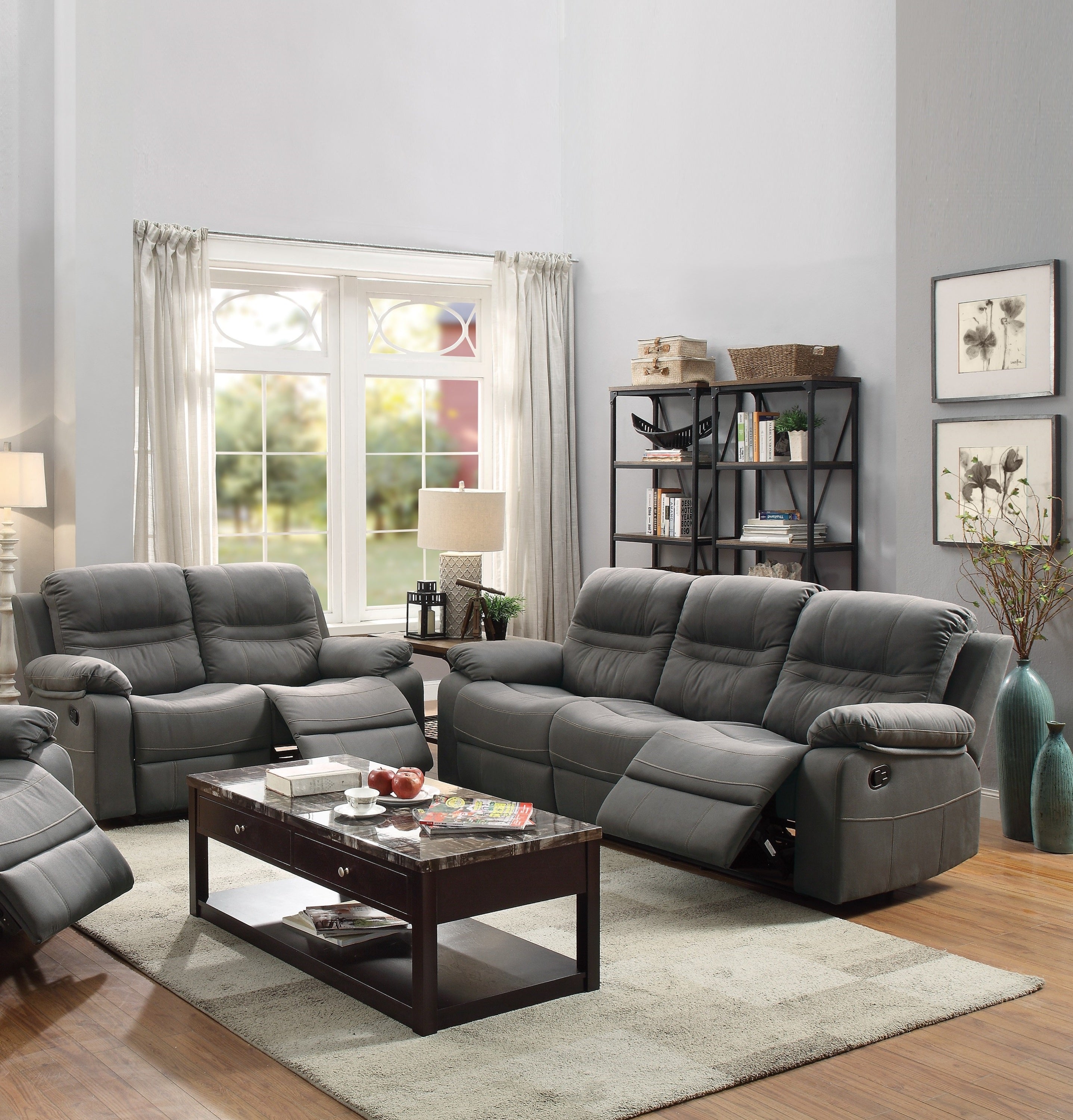 Step into the comfort you deserve with this sofa set that feature functional plush and breathable leatherette upholstered furnishings. Each piece includes special pillow top armrest with accent blending a bit of contemporary style with traditional design. Engage your senses with reclining units for added comfort and relaxation. Available in dark brown or slate blue.