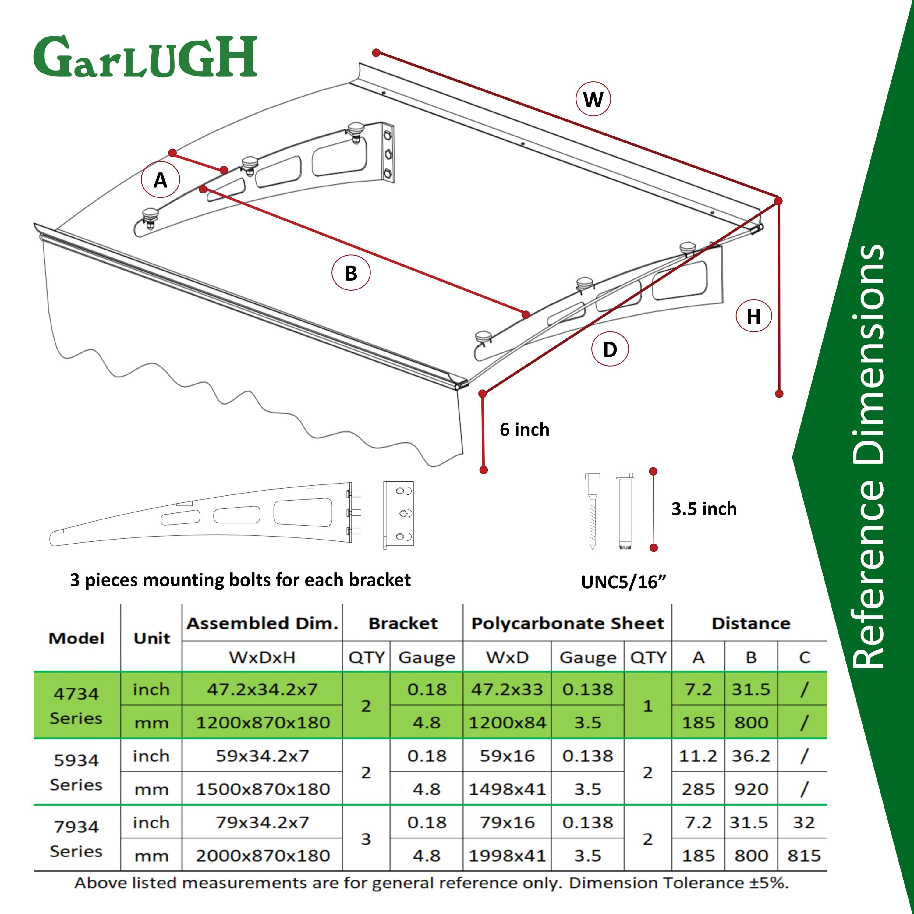 - 【PREMIUM QUALITY SOLID POLYCARBONATE ROOF】 GarLUGH DA4734W Series door window awning canopy uses 0.137'/3.5mm thick virtually solid polycarbonate panel with UPF80+ Ultraviolet ray protection. The awning is tested independently INTERTEK proving to be capable of affording the loading over 350lbs.