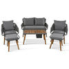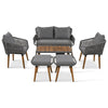 | Summary | This 6-piece set will give your outdoor space a fresh look that combines modern patio design with classic coastal farmhouse style. It includes one loveseat, two armchairs, a rectangular acacia wood coffee table, and two ottoman stools - all made from solid metal and acacia wood feet that are resistant to weather and water damage. The seating features open silhouettes with inviting arms and backs woven from rope for an added touch of natural charm. Plus, the machine-washable covers make clean-up after gatherings super easy! |