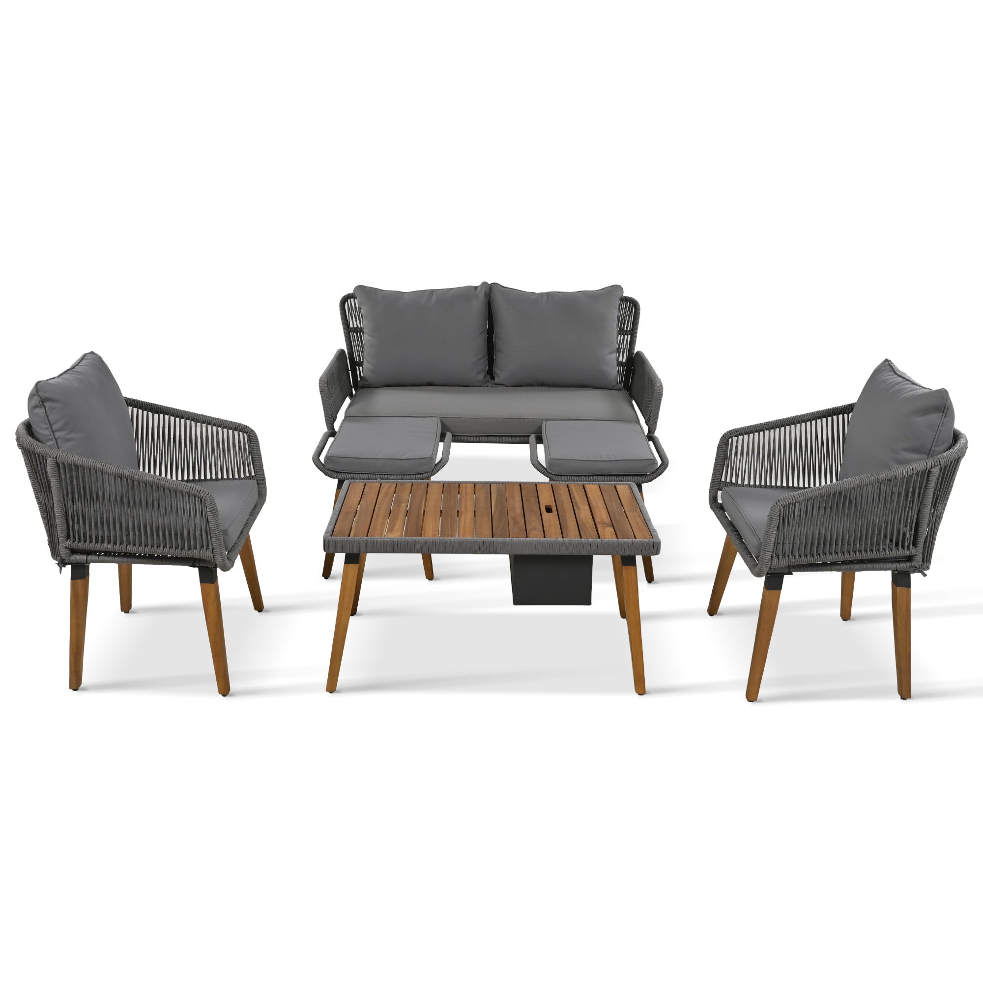 K&K 6-Piece Rope Patio Furniture Set, Outdoor Furniture with Acacia Wood Cool Bar Table with Ice Bucket , Deep Seat Patio Conversation Set with Two Stools for Backyard Porch Balcony (Grey) SK000005AAE-djyc