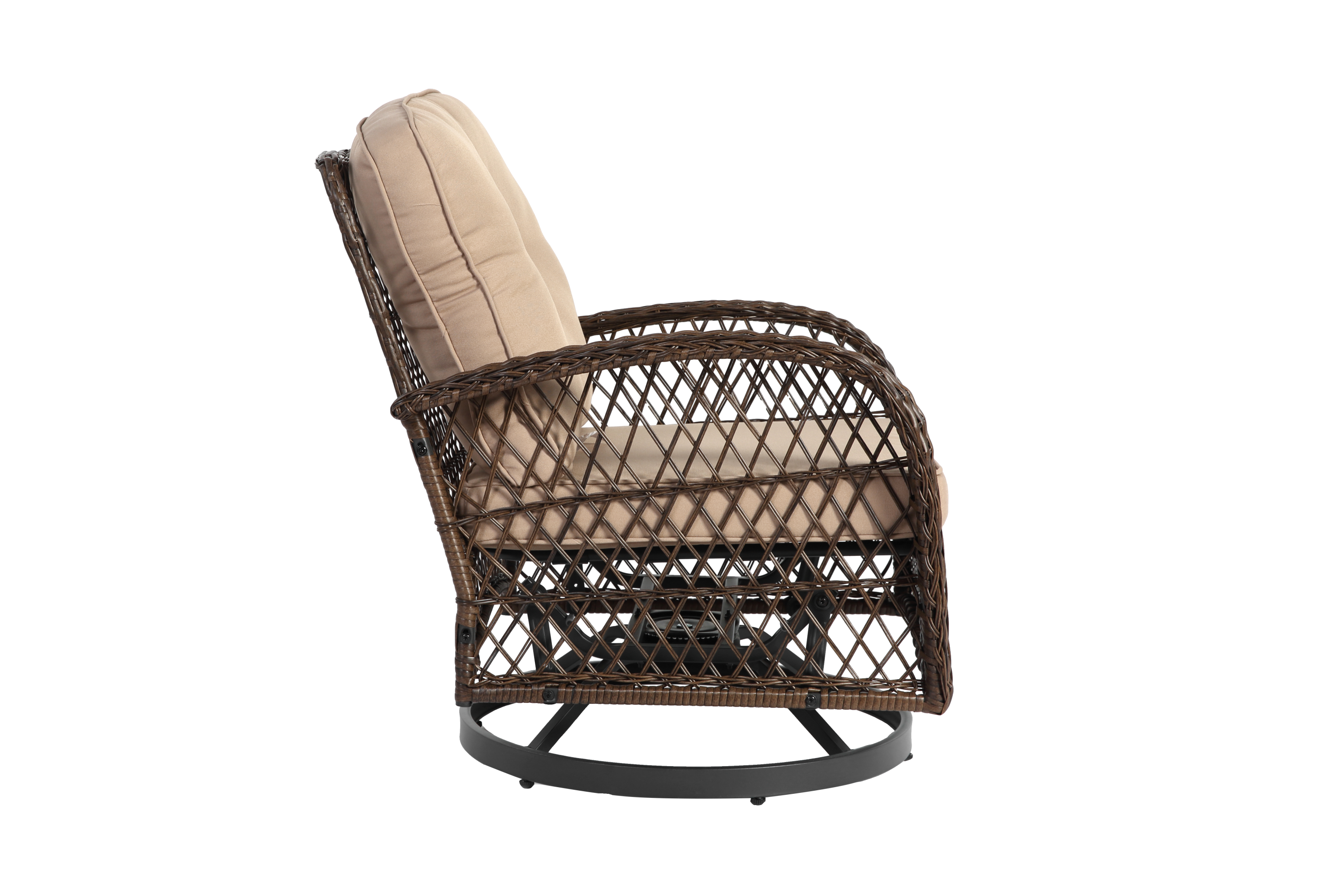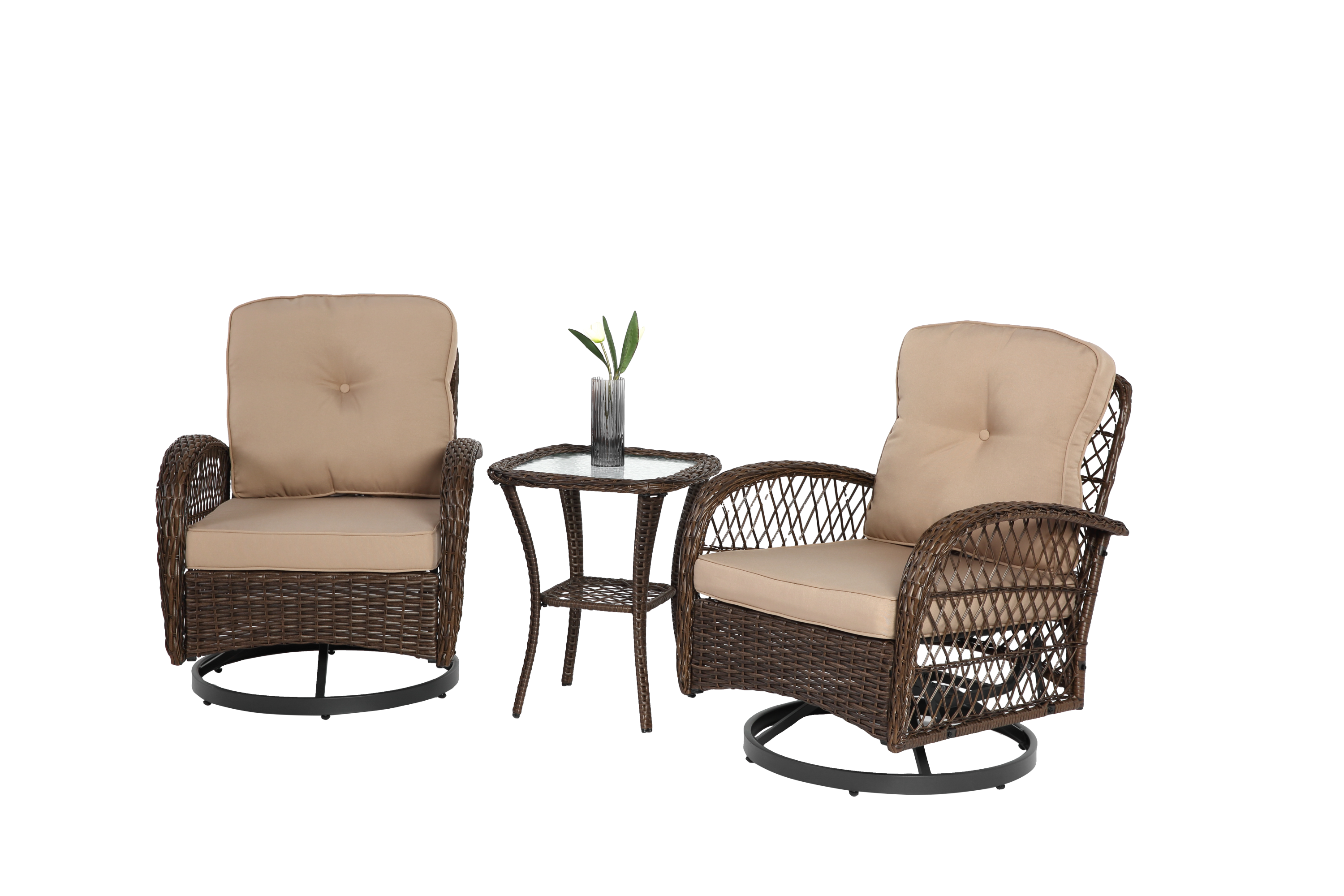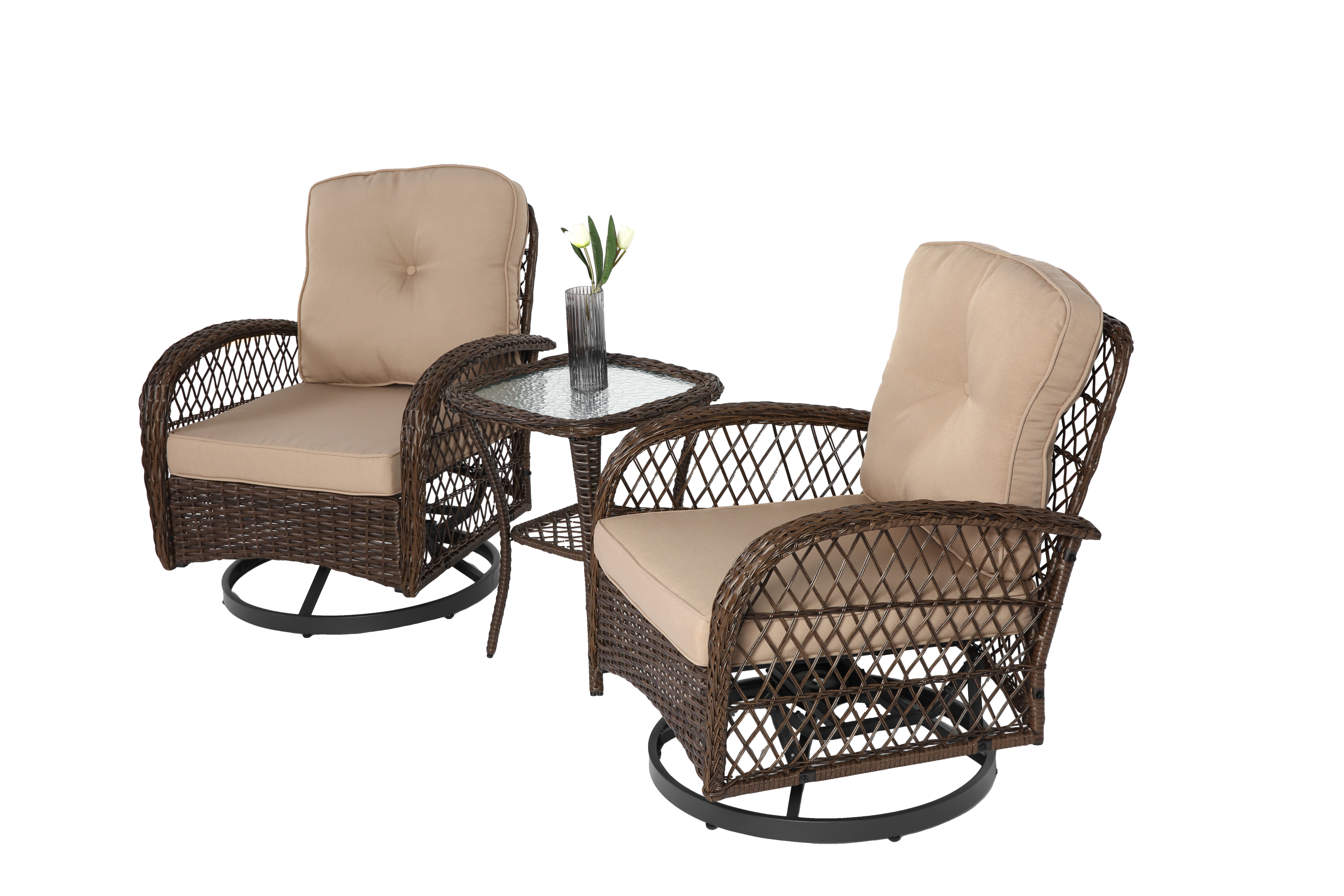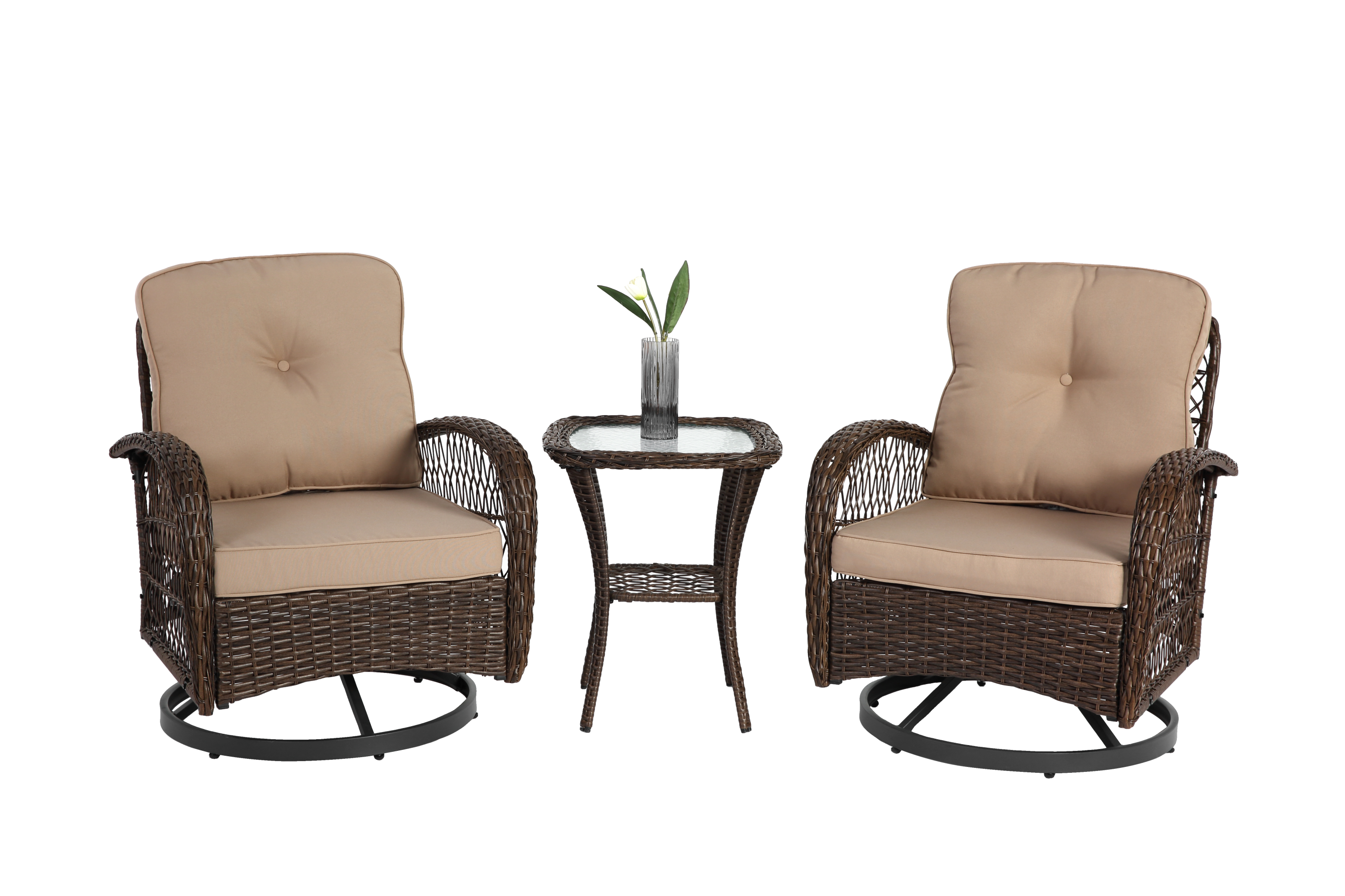 3 Pieces Outdoor Swivel Rocker Patio Chairs, 360 Degree Rocking Patio Conversation Set with Thickened Cushions and Glass Coffee Table for Backyard, Khaki W640P263673-djyc