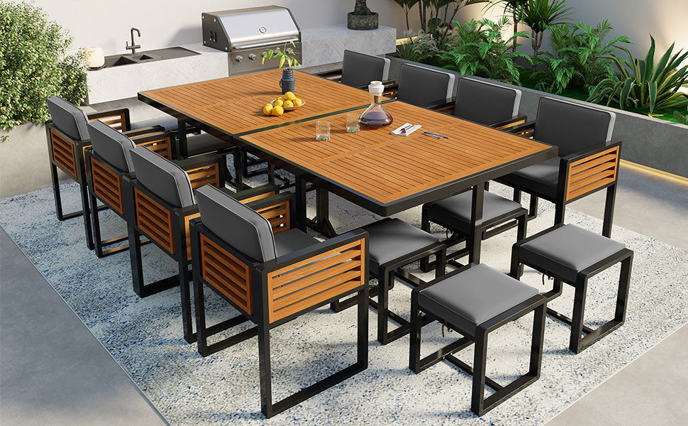 - Spacious Set: Includes 2 acacia wood dining tables, 8 single chairs, and 8 ottomans Provides plenty of dining space for family and guests. Suitable for a variety of outdoor settings, it adds a chic and elegant dining atmosphere to your patio, garden, or backyard.