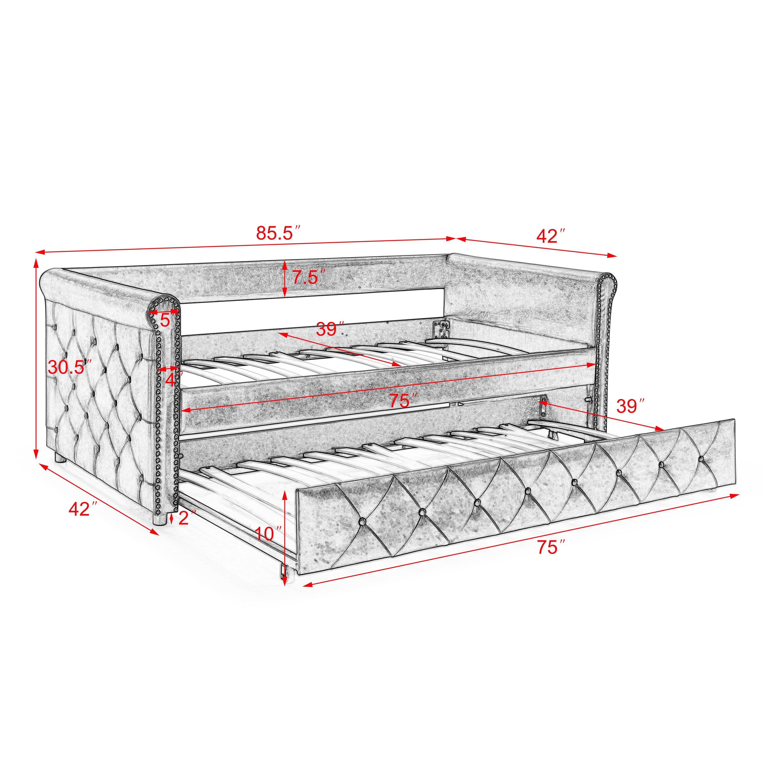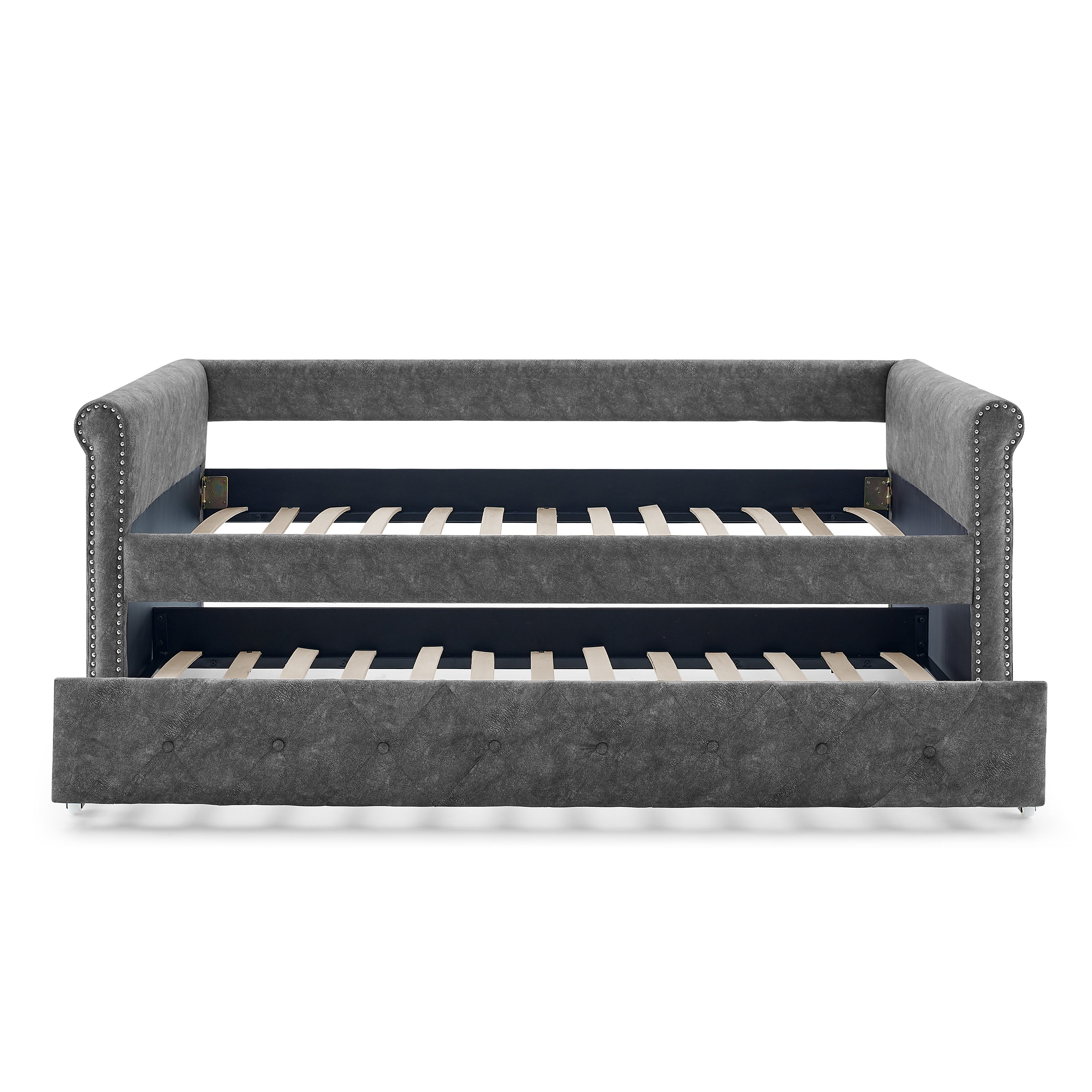 Daybed with Trundle Upholstered Tufted Sofa Bed,with Button and Copper Nail on Arms,both Twin Size,Grey(85.5"x42"x30.5") W487S00138-djyc