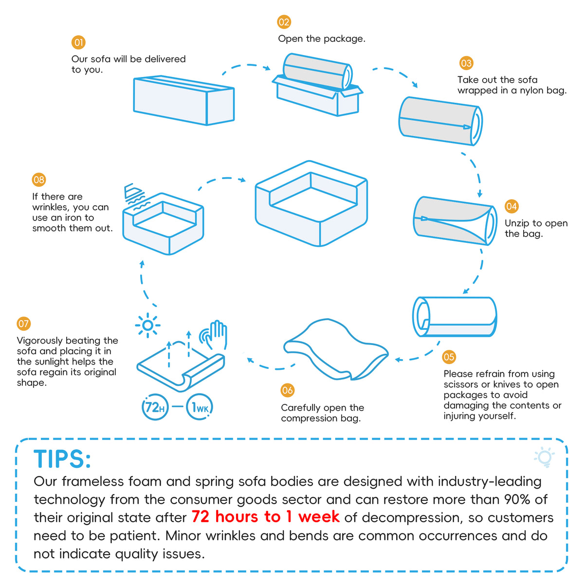 - No assembly required: This sofa can free of your stereotyped nightmare of furniture assembly. Please take all packages out and pat every part to make it rebound better and fluffy, so that it can restore to picture-like status.