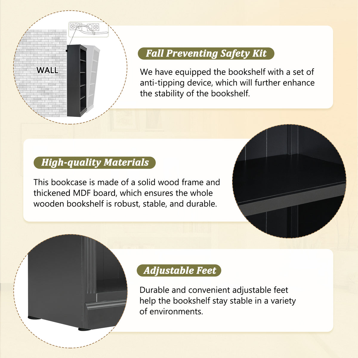 - The bookcase is made with an anti-dump kit, making it safer for children or pets.Please remember to install it on the wall for better stability and less unexpected injuries.