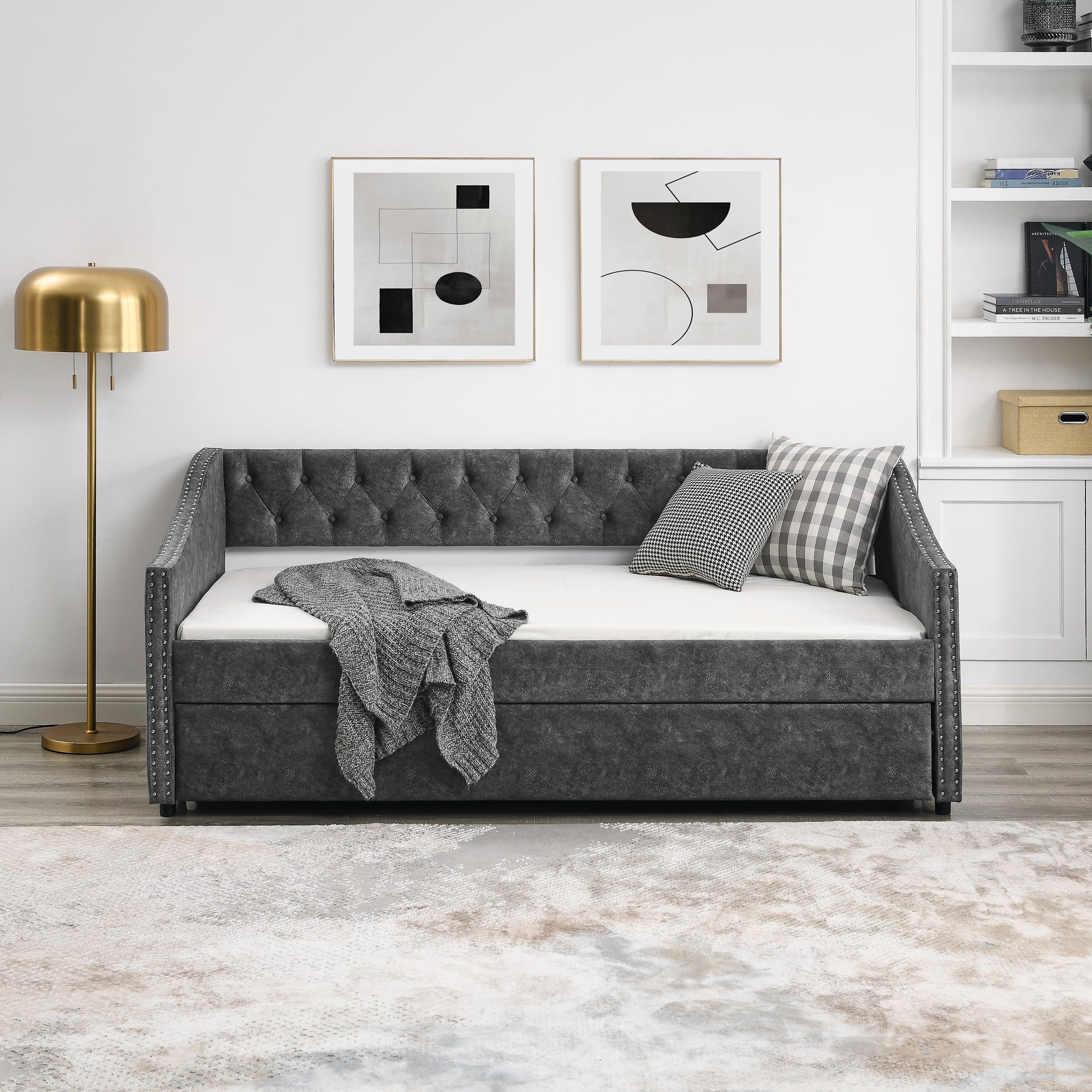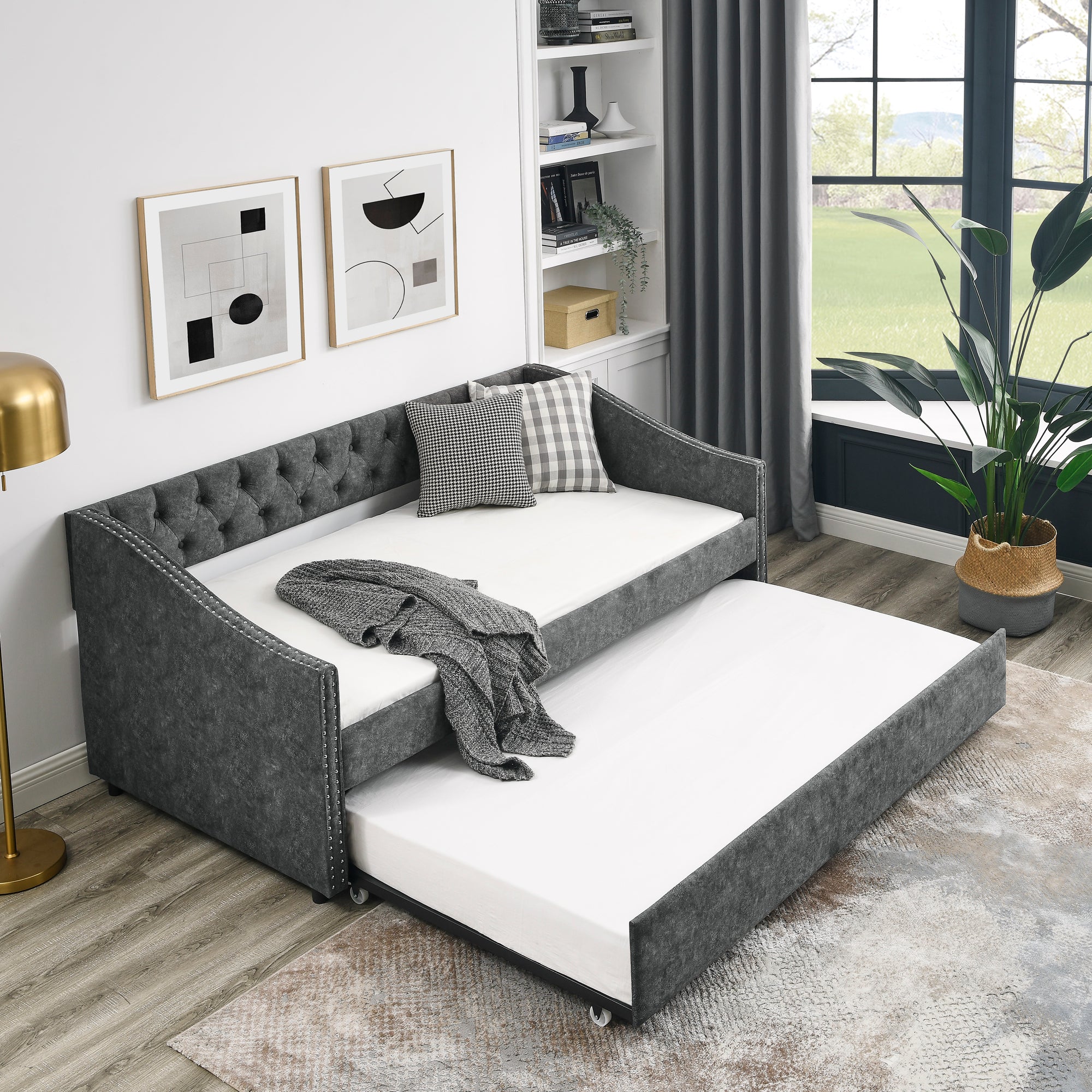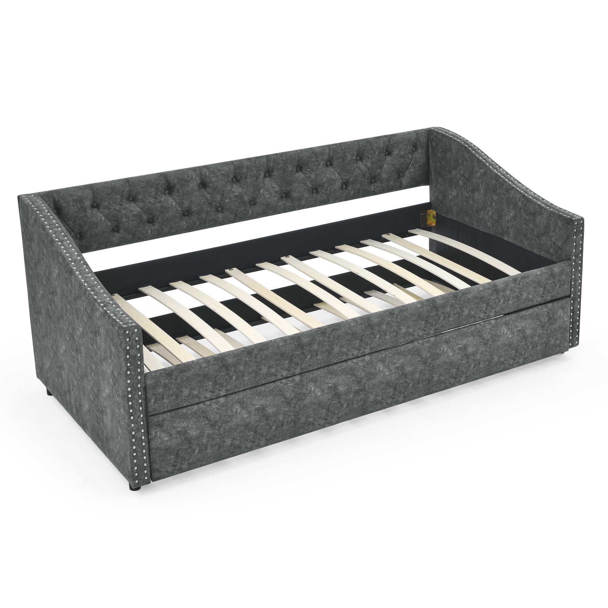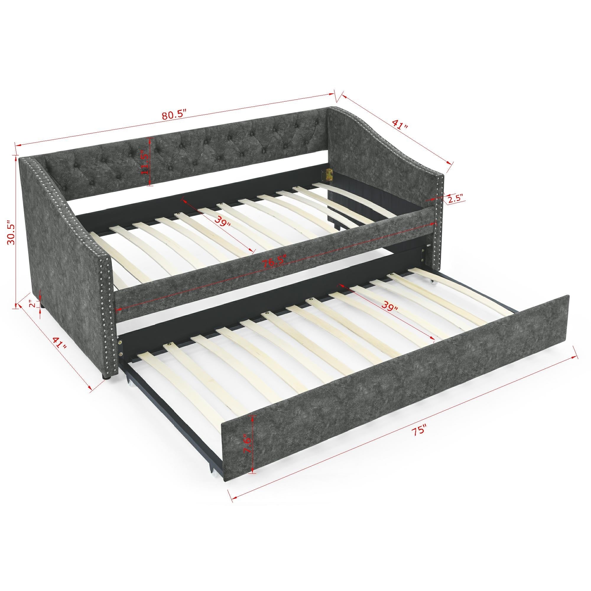 Twin Size Daybed with Twin Size Trundle Upholstered Tufted Sofa Bed, with Button on Back and Copper Nail on Waved Shape Arms, Grey (80.5'x41'x30.5') W1413S00005-djyc