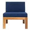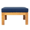 - [5 Pieces Corner Design Patio Set] This sectional seating group comes with two corner sofas,one armless sofa, one ottoman, one tea table, 4 cushions and 3 back pillows. Featuring wooden X-back frames and classical blue cushions, this set brings a graceful look to any outdoor space. Enjoy your summer time with a cool drink with this spacious patio seating group!