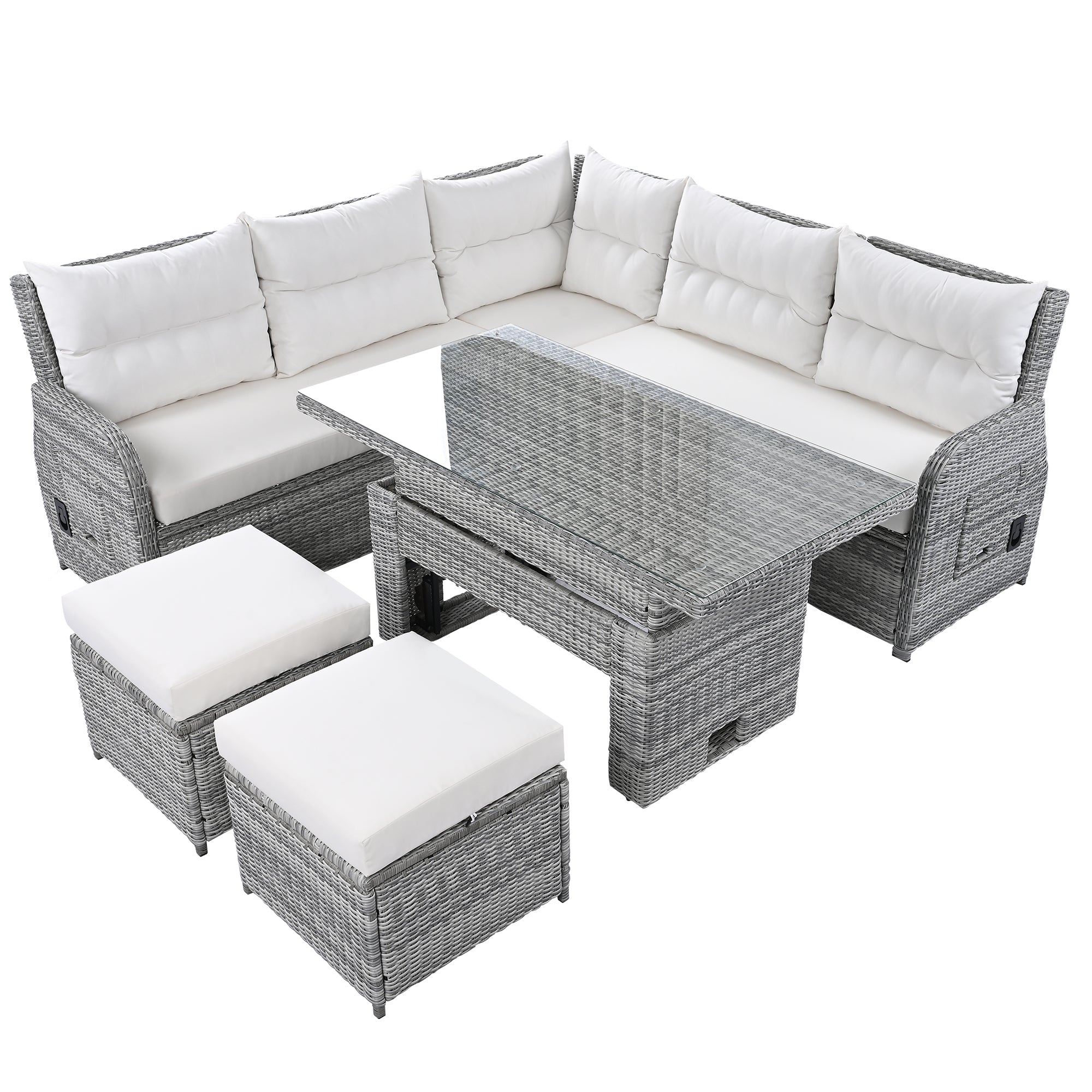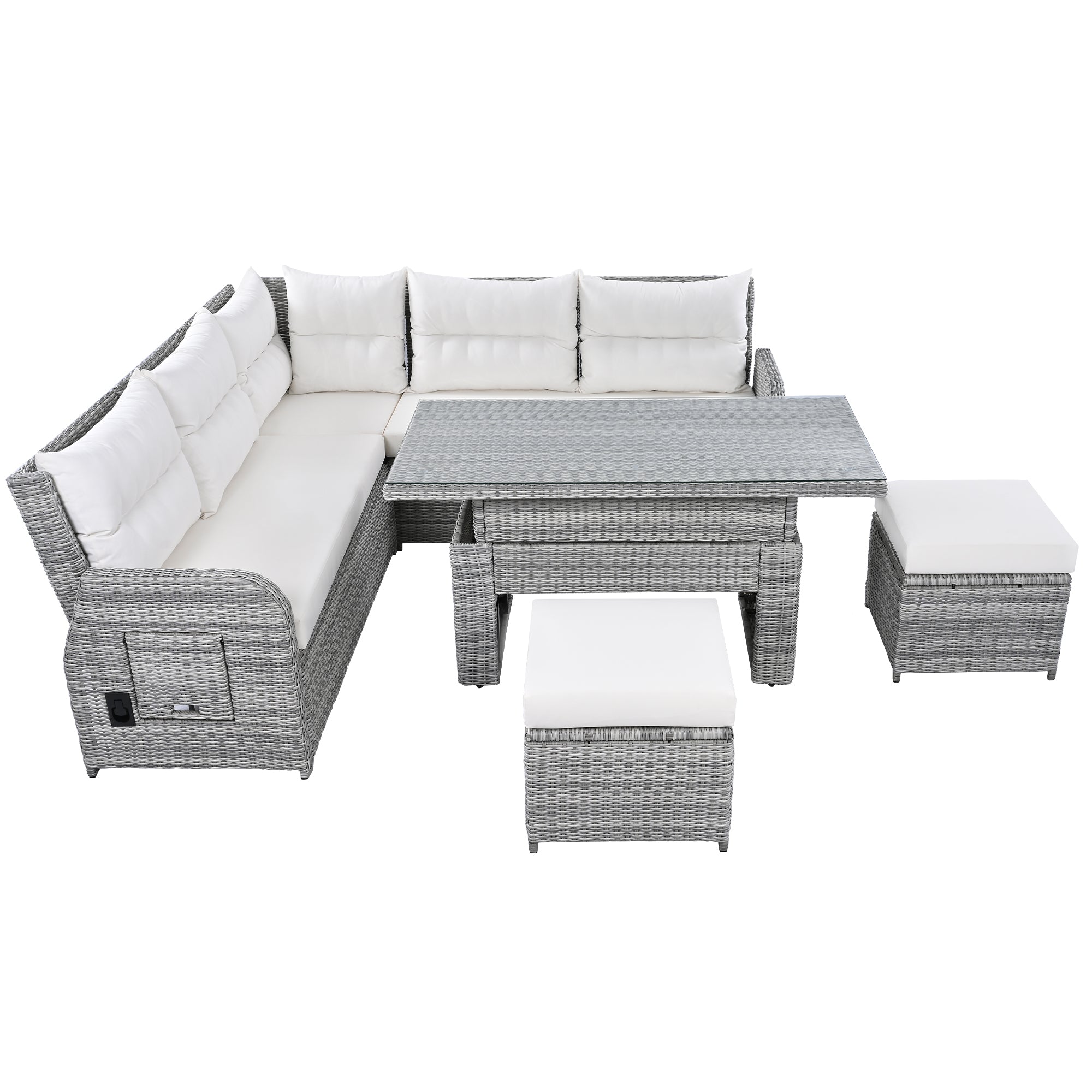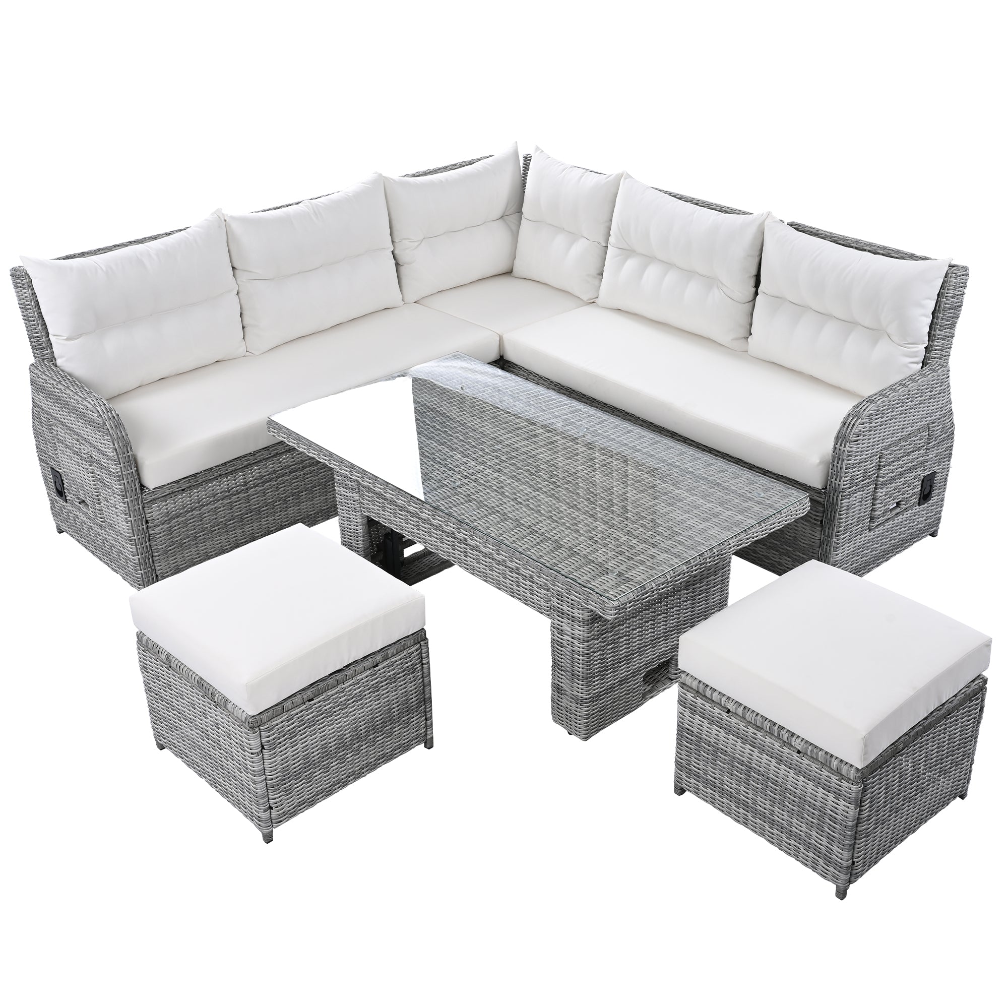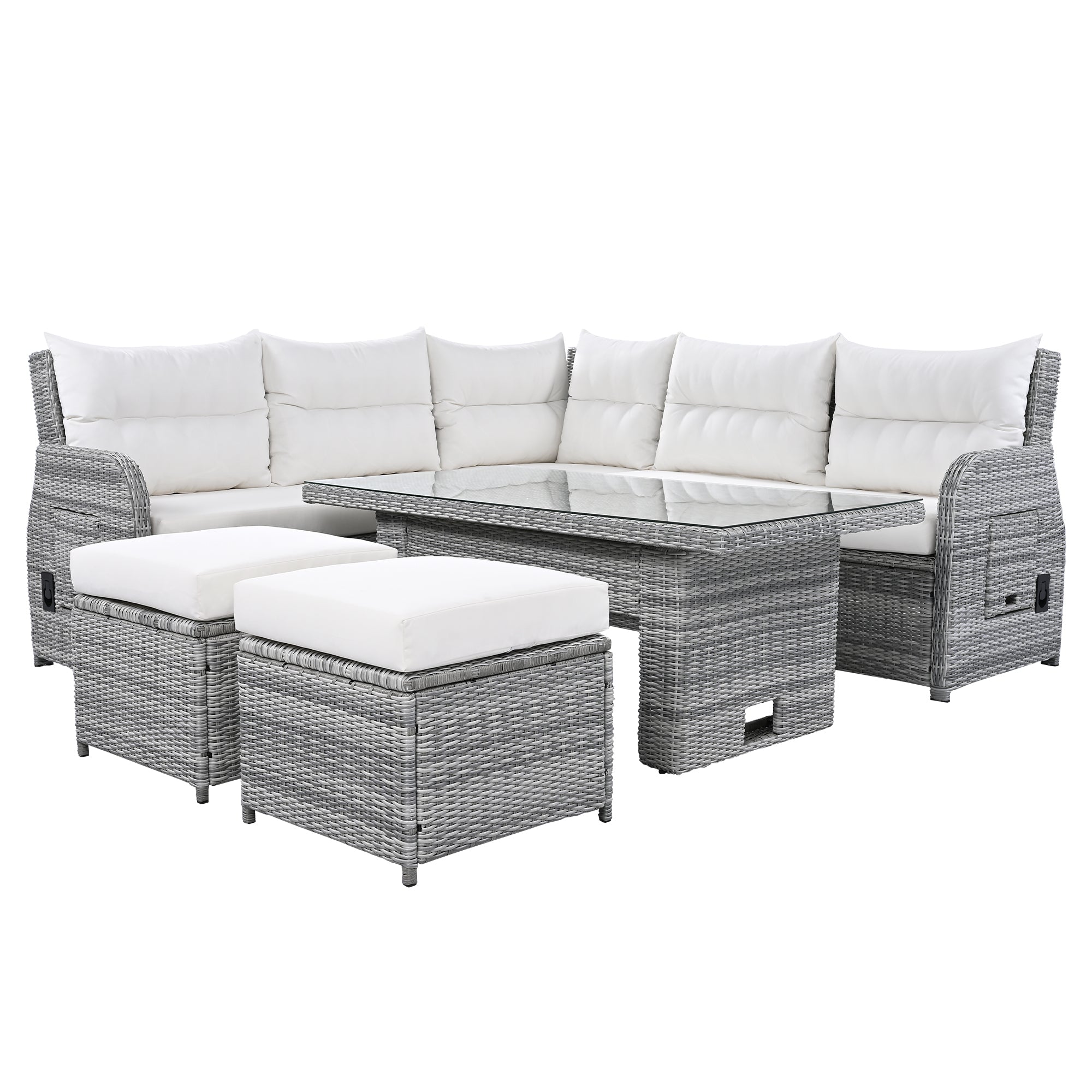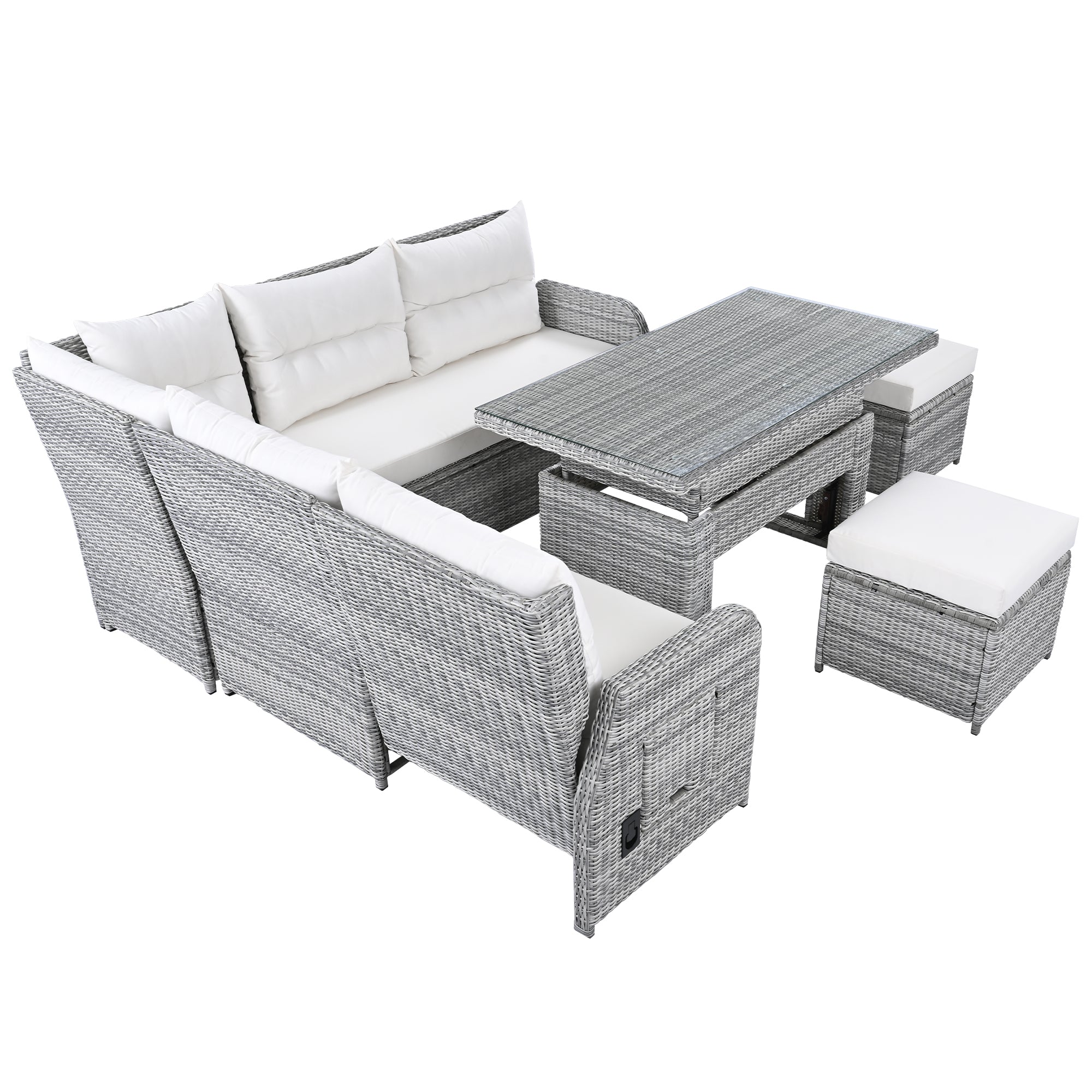 Outdoor Furniture Set Patio Rattan Furniture Set with an Adjustable Table, Recliners with Extendable Side Tables, and Two Ottomans For Patio, Lawn, Backyard, Pool, Beige N719Z000120A-djyc