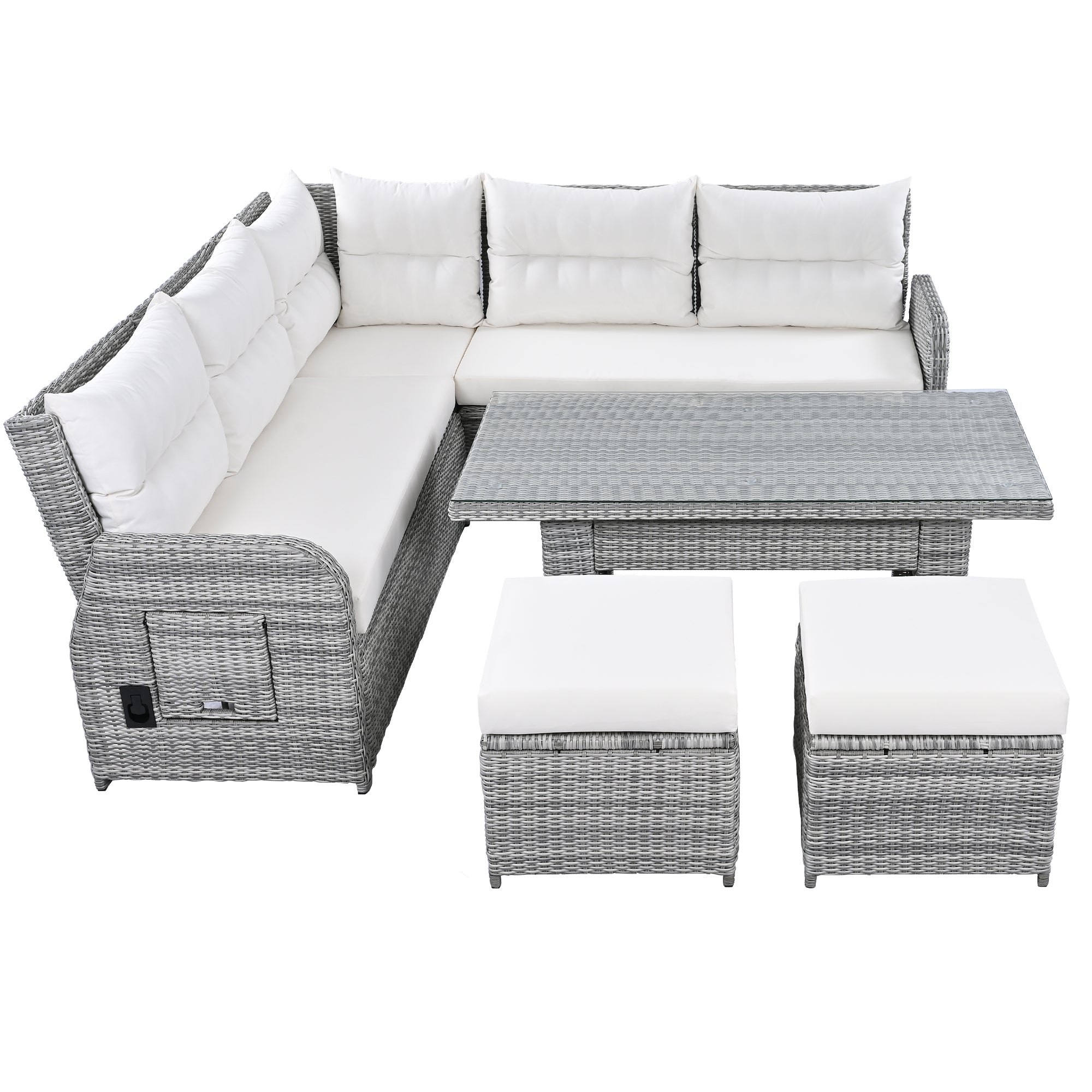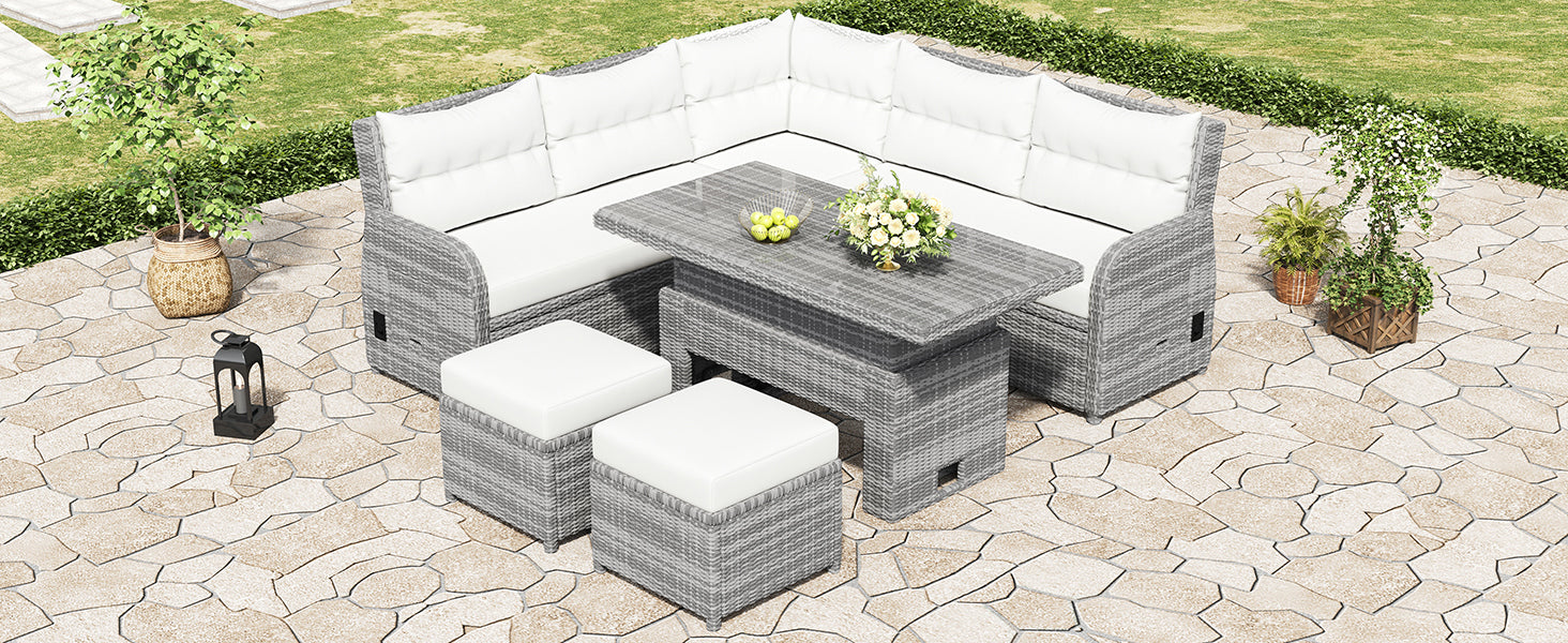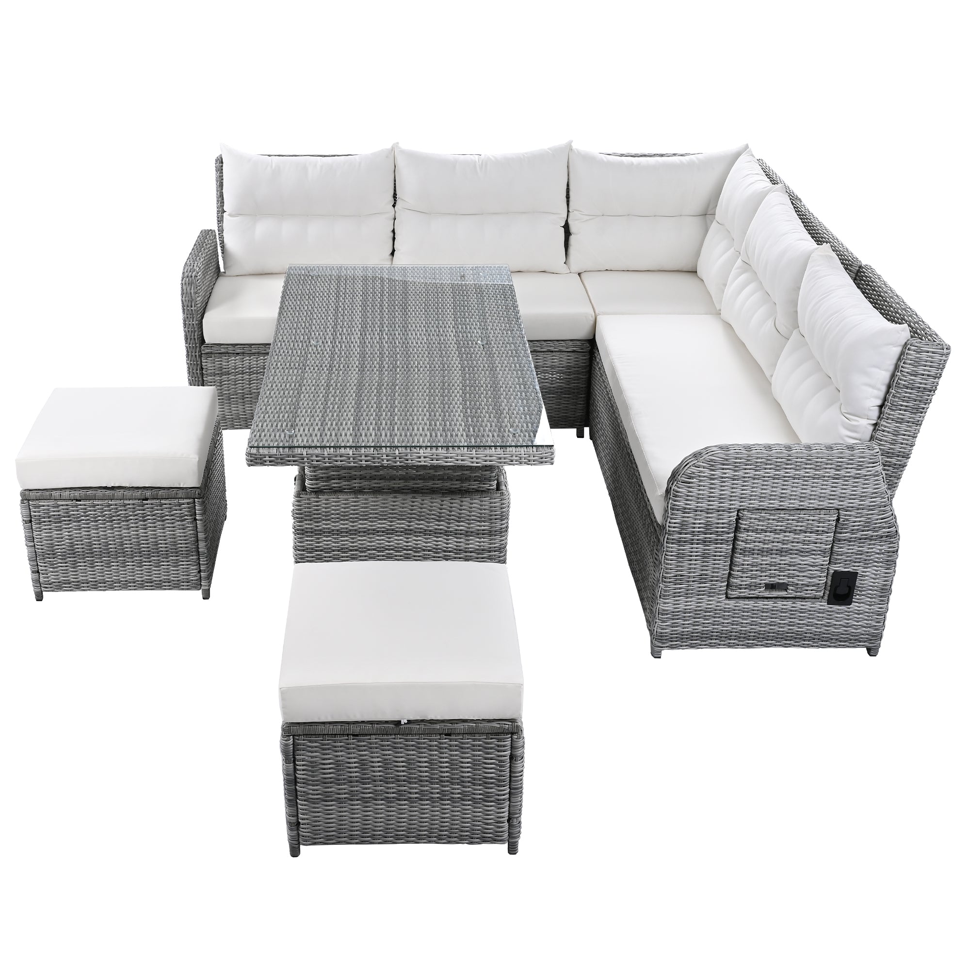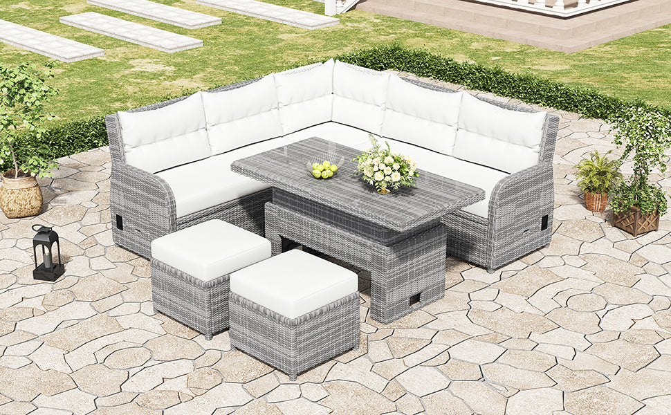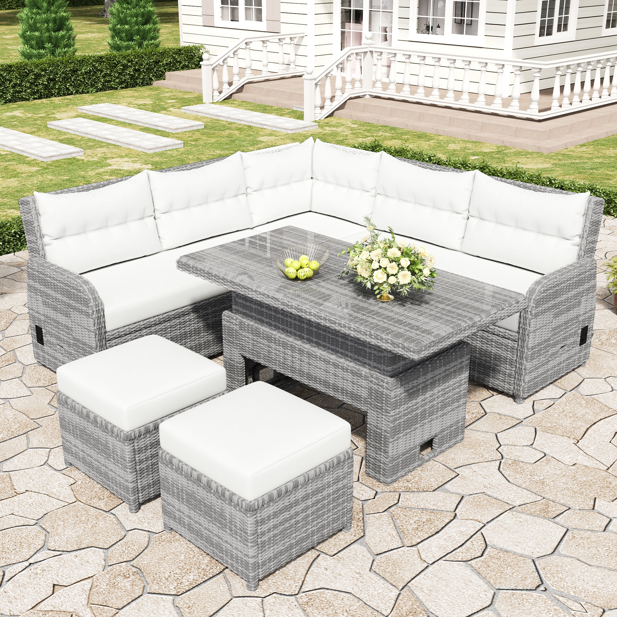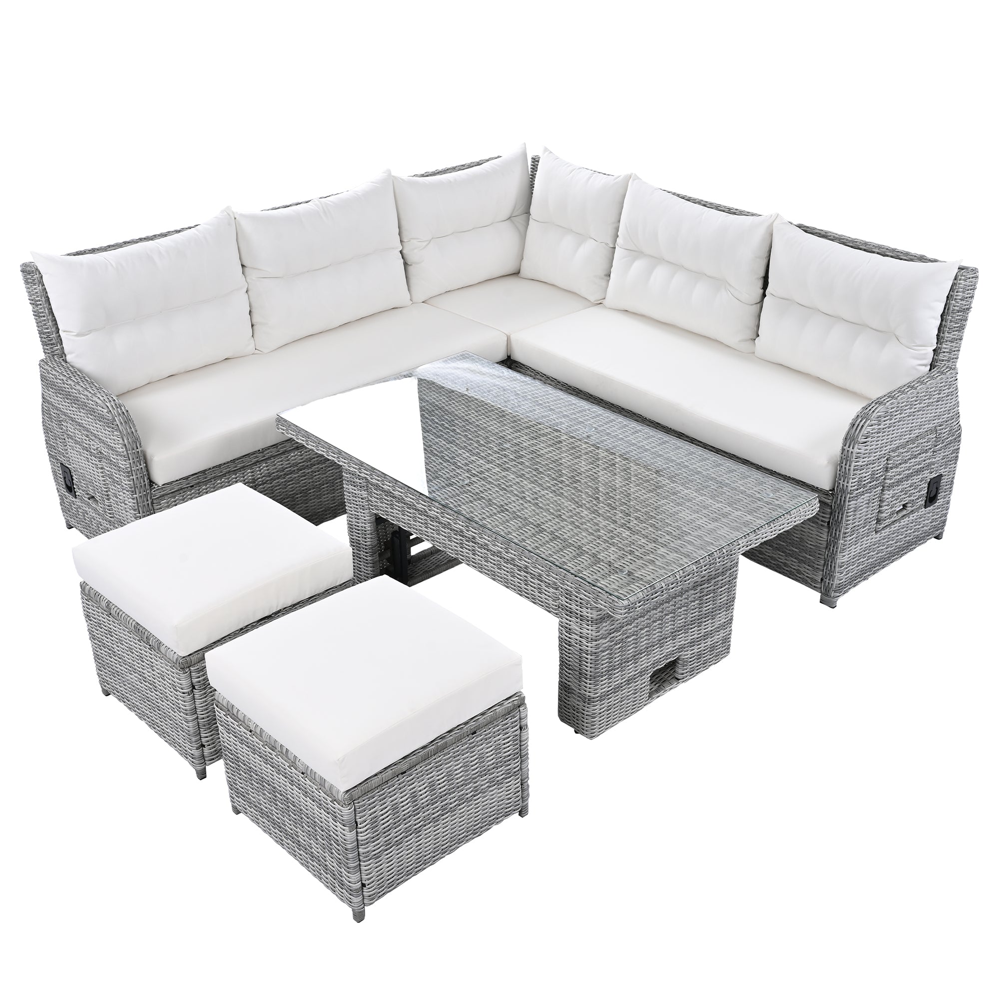 Outdoor Furniture Set Patio Rattan Furniture Set with an Adjustable Table, Recliners with Extendable Side Tables, and Two Ottomans For Patio, Lawn, Backyard, Pool, Beige N719Z000120A-djyc