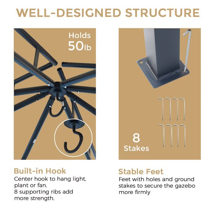 - 【Premium Galvanized Steel Construction】: Our gazebo boasts a sturdy and lightweight design with its Galvanized Steel column and Galvanized Steel beam, ensuring durability while remaining rust-proof. The roof is double top vented for optimum airflow and comfort during periods of strong wind. The middle of roof has two hooks that can be hung with electric lights or fans
