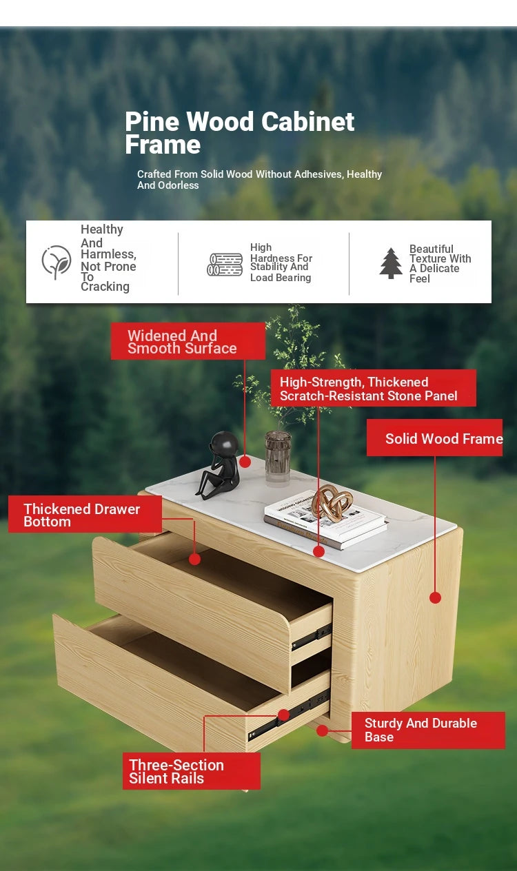 | A Better Home Starts with BICROOM | **Sleek and Modern Design**: Elevate your bedroom aesthetics with this stylish nightstand crafted from premium pine and sintered stone. Its clean lines and minimalist facade create a serene atmosphere that complements any modern decor. **Durable and Long-lasting**: Built with high-quality materials including sturdy metal and waterproof PU leather, this nightstand ensures durability while providing a sleek surface that is easy to maintain, making it an ideal addition to your bedroom furniture. **Ample Storage Space**: Featuring two spacious drawers, this nightstand offers ample storage for your bedside essentials. Keep your books, glasses, and other necessities organized and within easy reach, ensuring a clutter-free space. **Versatile Functionality**: This nightstand isn’t just a bedside companion. Its sophisticated design allows it to seamlessly fit into living rooms, entryways, or study spaces, making it a versatile piece that adapts to your lifestyle. **Easy Assembly**: Designed for convenience, the nightstand comes with clear instructions for effortless assembly. Spend less time putting furniture together and more time enjoying your beautifully styled space. **Eco-Friendly Choice**: Made from sustainably sourced pine, this eco-conscious nightstand reflects a commitment to both style and the environment. Make a chic yet responsible choice for your home decor with this beautiful piece. |