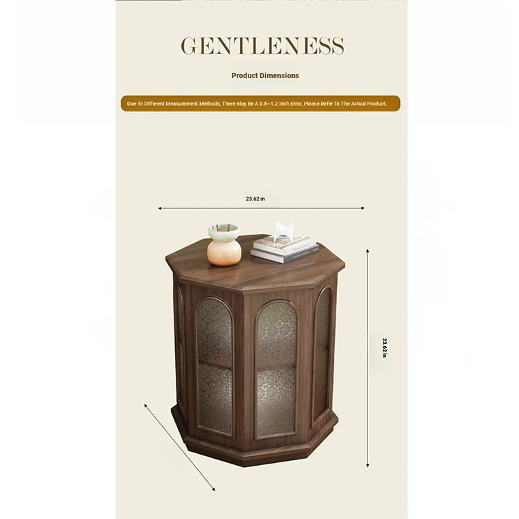 | A Better Home Starts with BICROOM | **Elegance Meets Functionality**: This stunning side table, crafted from premium black walnut wood and enhanced with elegant glass panels, effortlessly complements your living space while providing a stylish surface for drinks, books, or decorative items. **Durable Design**: Built with solid wood and a multi-layer board, this side table promises durability and stability, ensuring it stands the test of time in your home. A must-have for those who appreciate quality craftsmanship. **Versatile Aesthetic**: With its octagonal shape and refined glass inlays, this side table adds a contemporary touch to any decor style, from modern minimalist to classic chic. It's the perfect accent piece for your living room or bedroom. **Space-Saving Storage**: Featuring an open shelf design, this side table provides practical storage space without taking up much room, making it ideal for small apartments or cozy nooks. Organize your essentials while keeping them within easy reach. **Easy Maintenance**: The smooth surfaces of black walnut wood and glass make this side table easy to clean and maintain, ensuring it remains a beautiful focal point in your home with minimal effort. **Sophisticated Home Accents**: Elevate your interior decor with this sophisticated side table, where luxury meets practicality. Perfect for showcasing your favorite items or enjoying a cup of coffee while you unwind. |