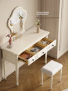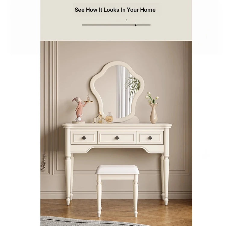 | A Better Home Starts with BICROOM | **Elegant Cherry Wood Makeup Table**: Transform your beauty routine with this stunning makeup table crafted from rich cherry wood. Its luxurious finish and classic design beautifully enhance any bedroom or dressing area, making it a sophisticated centerpiece for your space. **Functional and Stylish Design**: This makeup table features a spacious tabletop and three convenient drawers, perfect for storing all your beauty essentials. The combination of cherry wood, pine, and metal accentuates durability while providing a timeless aesthetic. **Reflect Your Style**: Featuring a beautifully framed glass mirror, this vanity allows you to enjoy a clear view while applying makeup or styling your hair. The thoughtful design, including elegantly turned legs, adds a touch of sophistication to your daily grooming routine. **Versatile Décor Piece**: Whether your decor style is modern or classic, this versatile makeup table fits seamlessly into any interior theme. Its neutral colors and refined materials make it a perfect addition to both contemporary and traditional settings. **Built for Comfort and Convenience**: The accompanying cushioned stool ensures comfort while you get ready. Its compact design makes this makeup table ideal for smaller spaces, providing a practical yet stylish solution for your beauty needs. **A Solid Investment in Quality**: Made from high-quality materials like cherry wood, pine, metal, and glass, this makeup table not only elevates your room’s decor but also promises longevity and reliability, making it a great investment for years to come. **Easy Maintenance and Assembly**: Enjoy hassle-free setup with included instructions, and rest assured that the rich materials used require minimal maintenance, giving you more time to enjoy your beauty routine. |