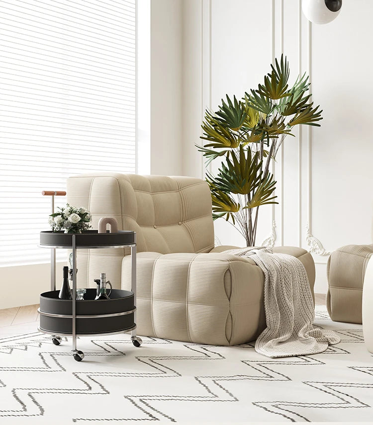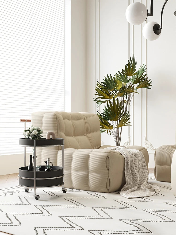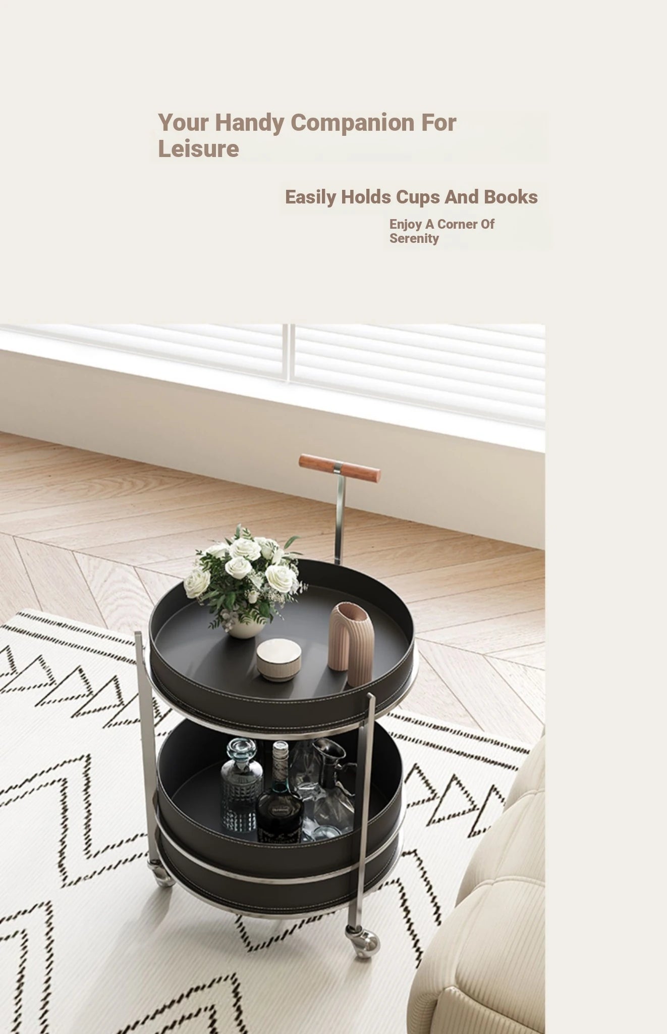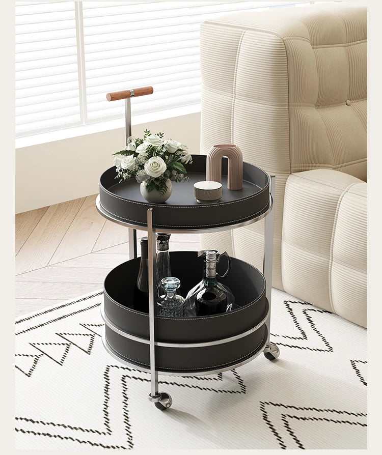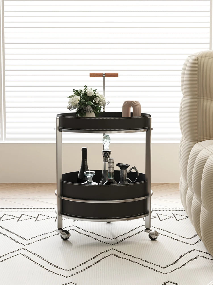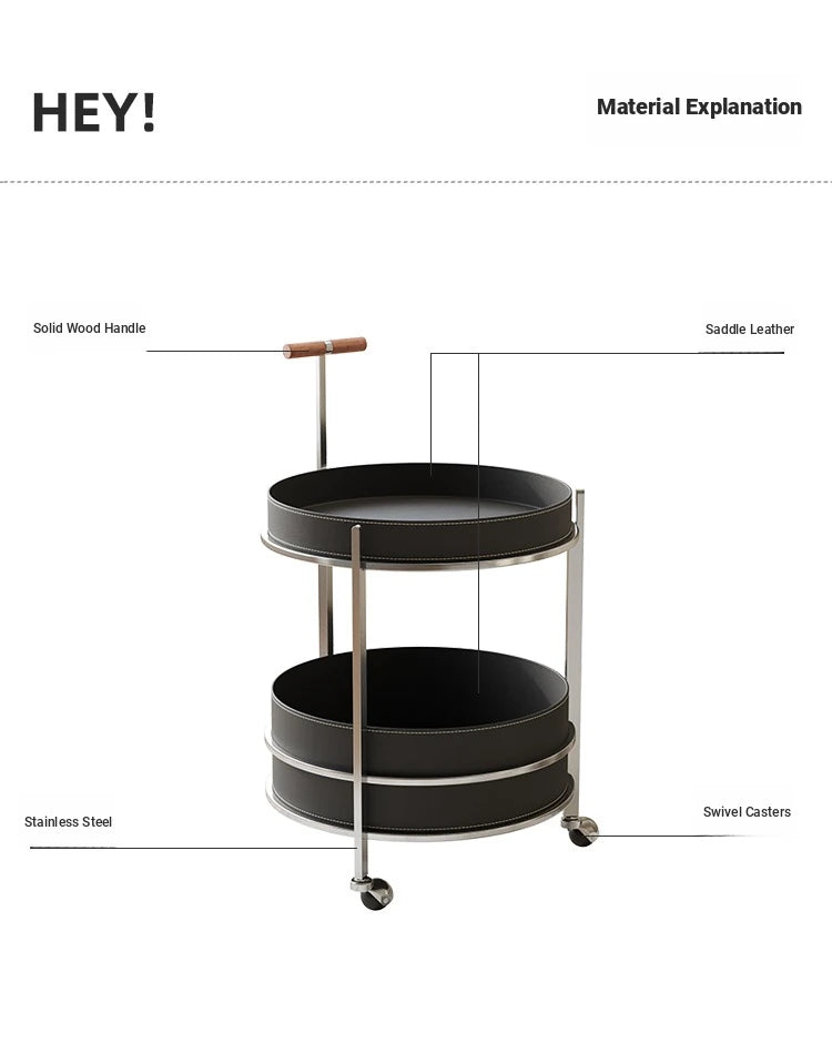 | A Better Home Starts with BICROOM | **Stylish and Functional Design**: Elevate your living space with this elegant cart, featuring a sleek combination of solid wood, stainless steel, and synthetic leather, offering both style and practicality. **Versatile Use**: Perfect for entertaining, this cart can serve drinks, showcase decorative items, or hold kitchen essentials, making it a must-have addition to any home. **Smooth Mobility**: Equipped with durable wheels, this cart moves effortlessly from room to room, ensuring convenience whether you’re hosting a dinner party or just enjoying a quiet evening. **Durable and Easy to Clean**: Crafted from high-quality materials, this cart is designed to withstand everyday use. The smooth surfaces make cleaning a breeze, so you can maintain its stunning appearance with minimal effort. **Chic Modern Touch**: Its contemporary aesthetic, combined with the natural warmth of solid wood and the sleekness of stainless steel, complements any décor, from modern to traditional. **Space-Saving Storage**: With multiple levels for storage, this cart maximizes your space while keeping your belongings organized and easily accessible, making it ideal for small apartments or cozy homes. **Unique Statement Piece**: Featuring a striking design that draws the eye, this cart is not just functional; it’s also a statement piece that adds a touch of sophistication to your interior décor. |