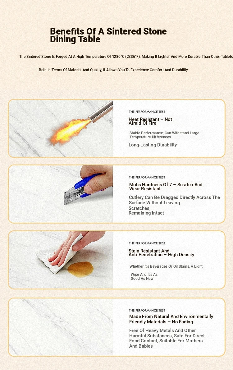**Easy Maintenance**: The sintered stone surface is resistant to stains and scratches, making clean-up a breeze. Spend less time worrying about maintenance and more time enjoying gatherings with family and friends.
