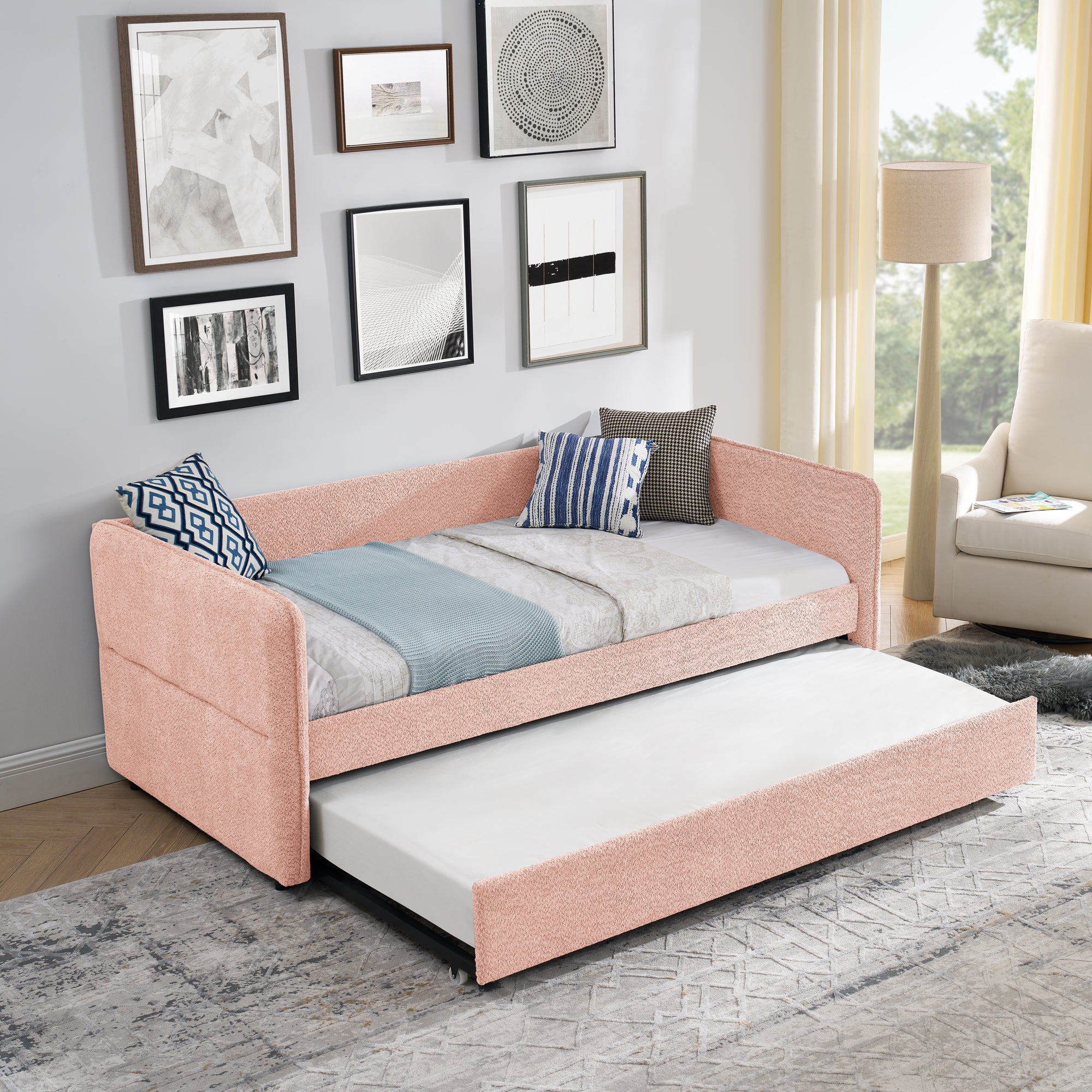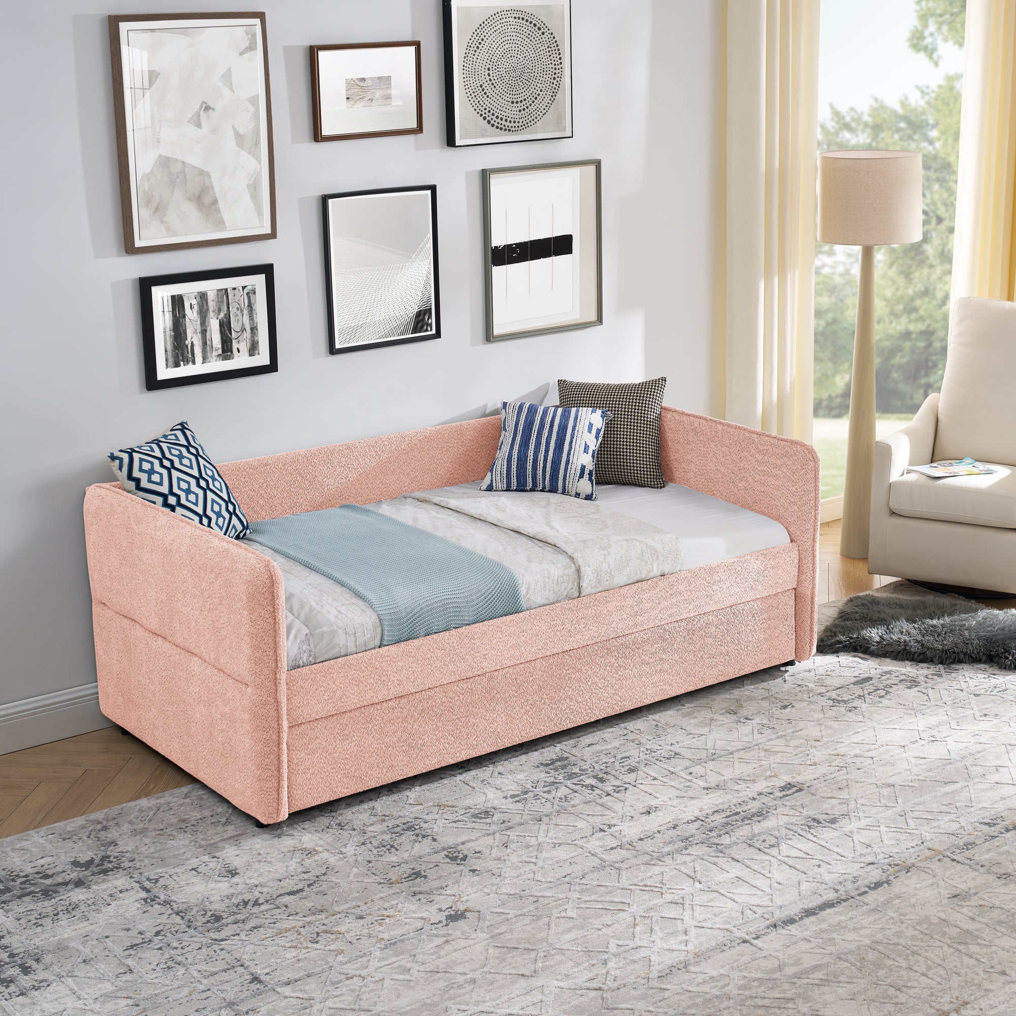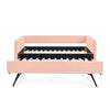 - [Comfortable Experience] Foam padded sides and back that provide optimal back support and comfort.This twin-size daybed provides you with a great seating experience that ergonomically supports your back and arms. Meanwhile gorgeous soft fabric ensures you can keep cool for extended periods.