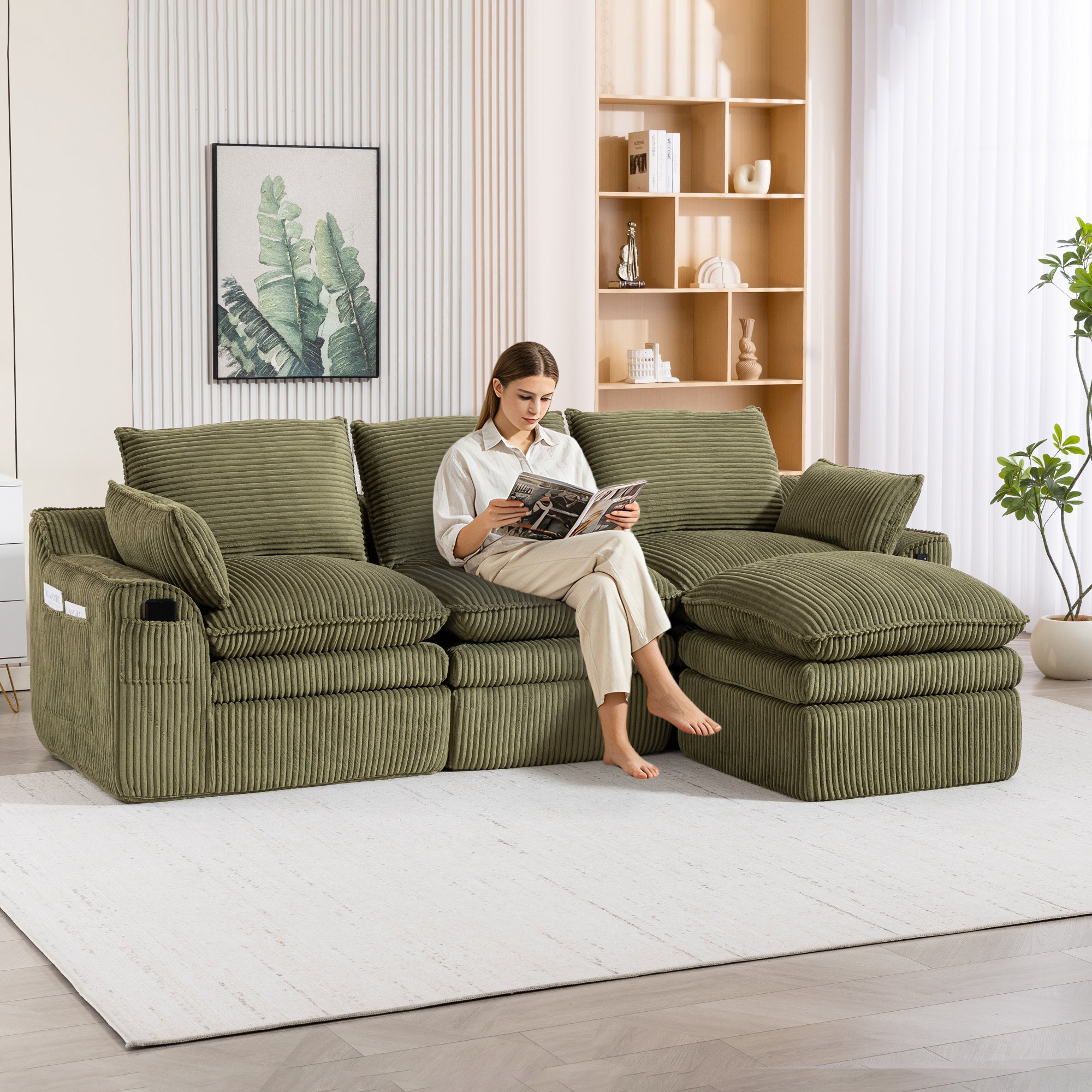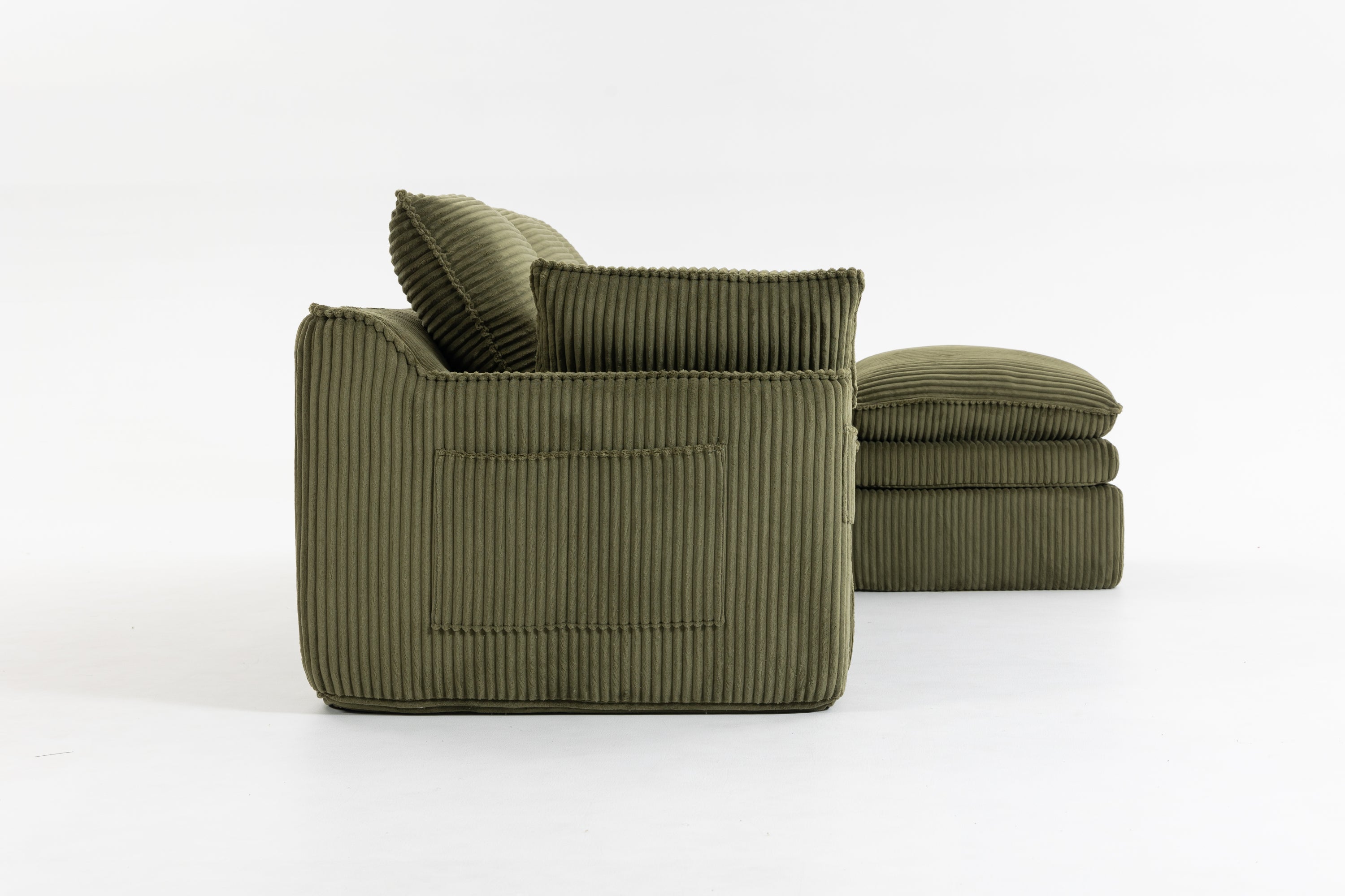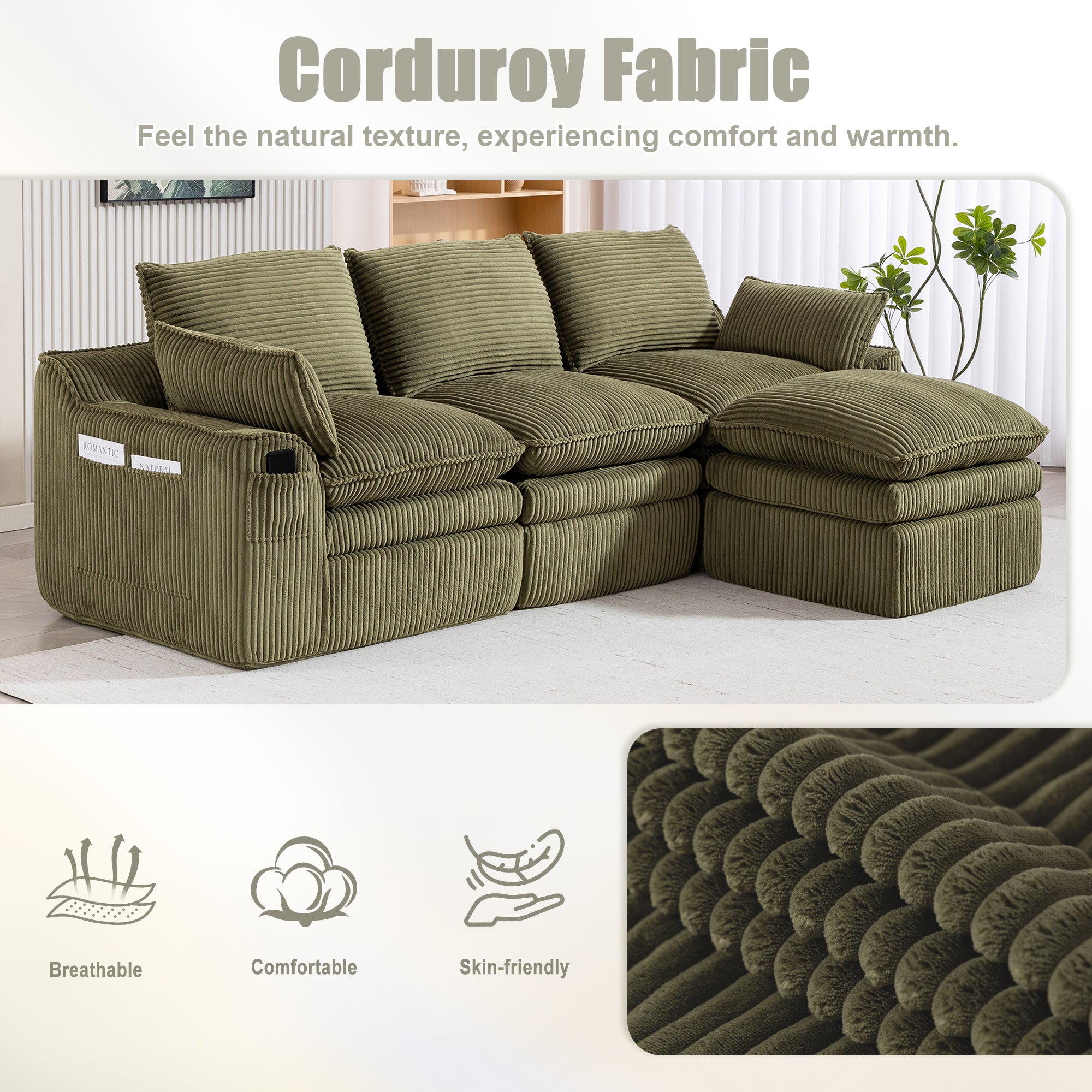 L Shaped Compressed Modular Sectional Sofa Modern Corduroy Upholstered Boneless Couches with Movable Footstool,With Three Pillows and Two Lumbar Pillows,Detachable Cloud Seat Cushions-W395S00139