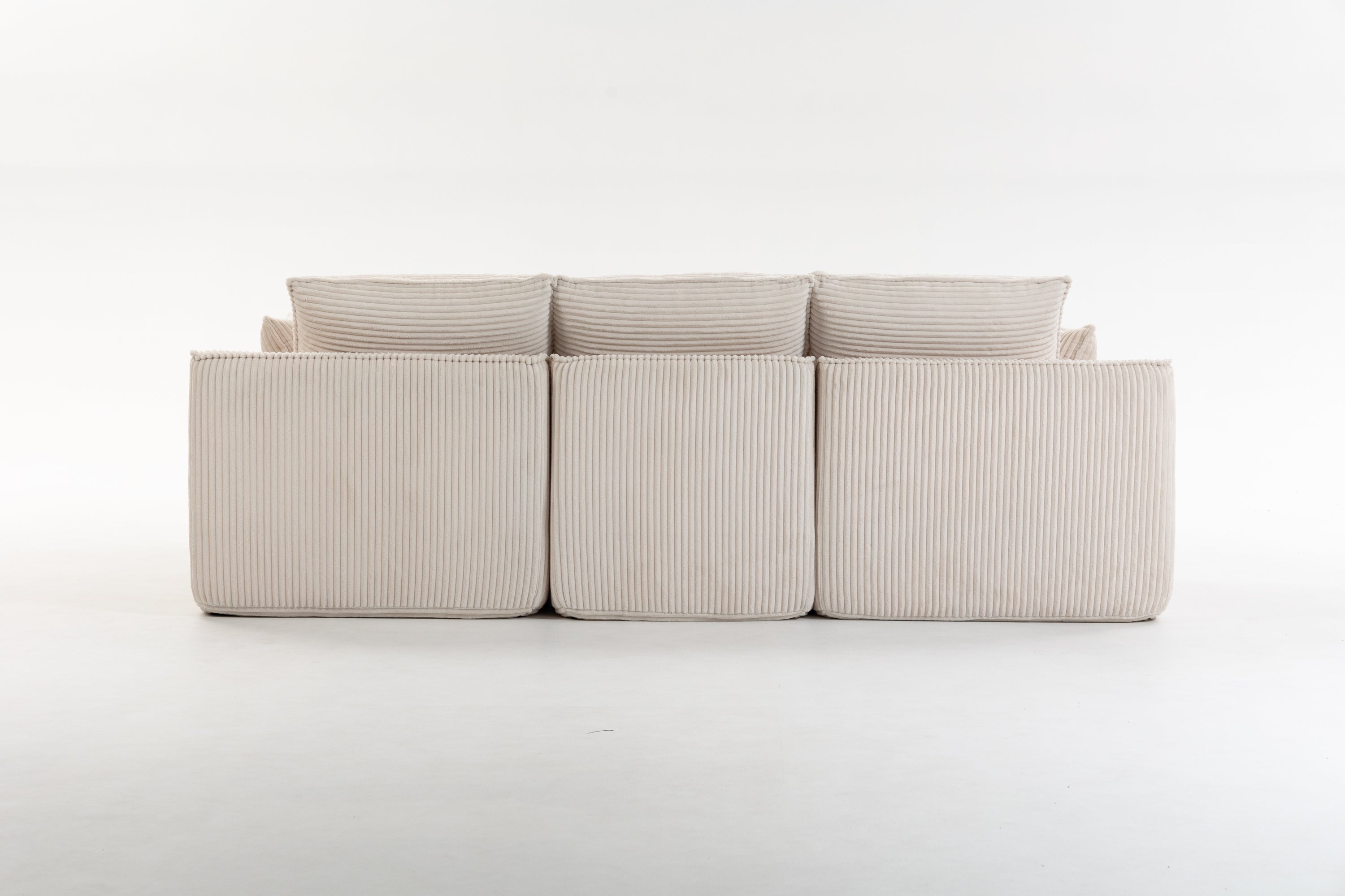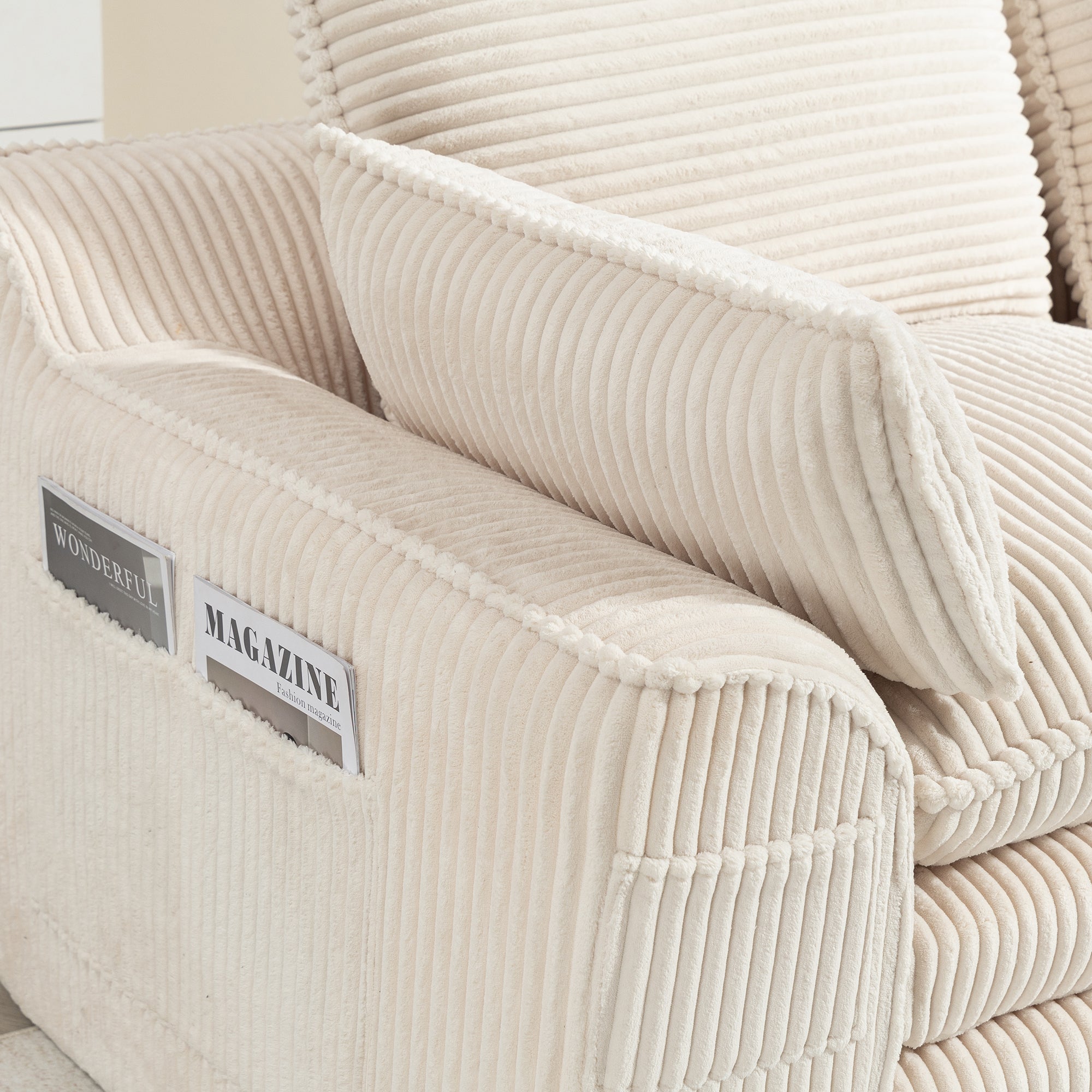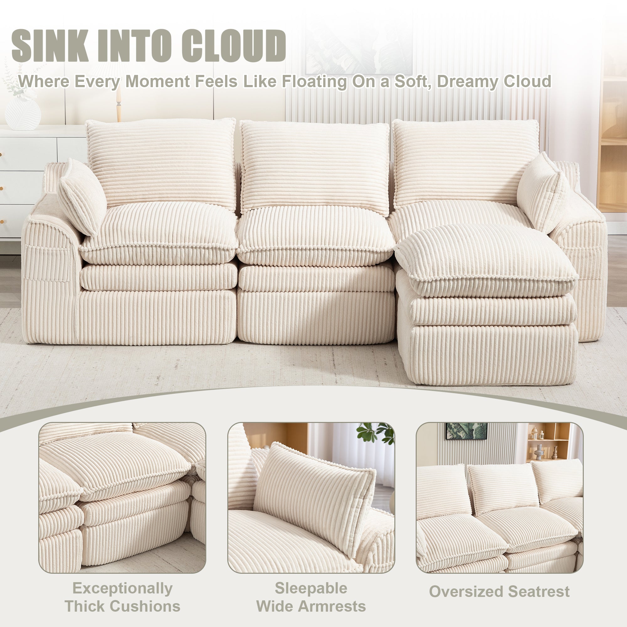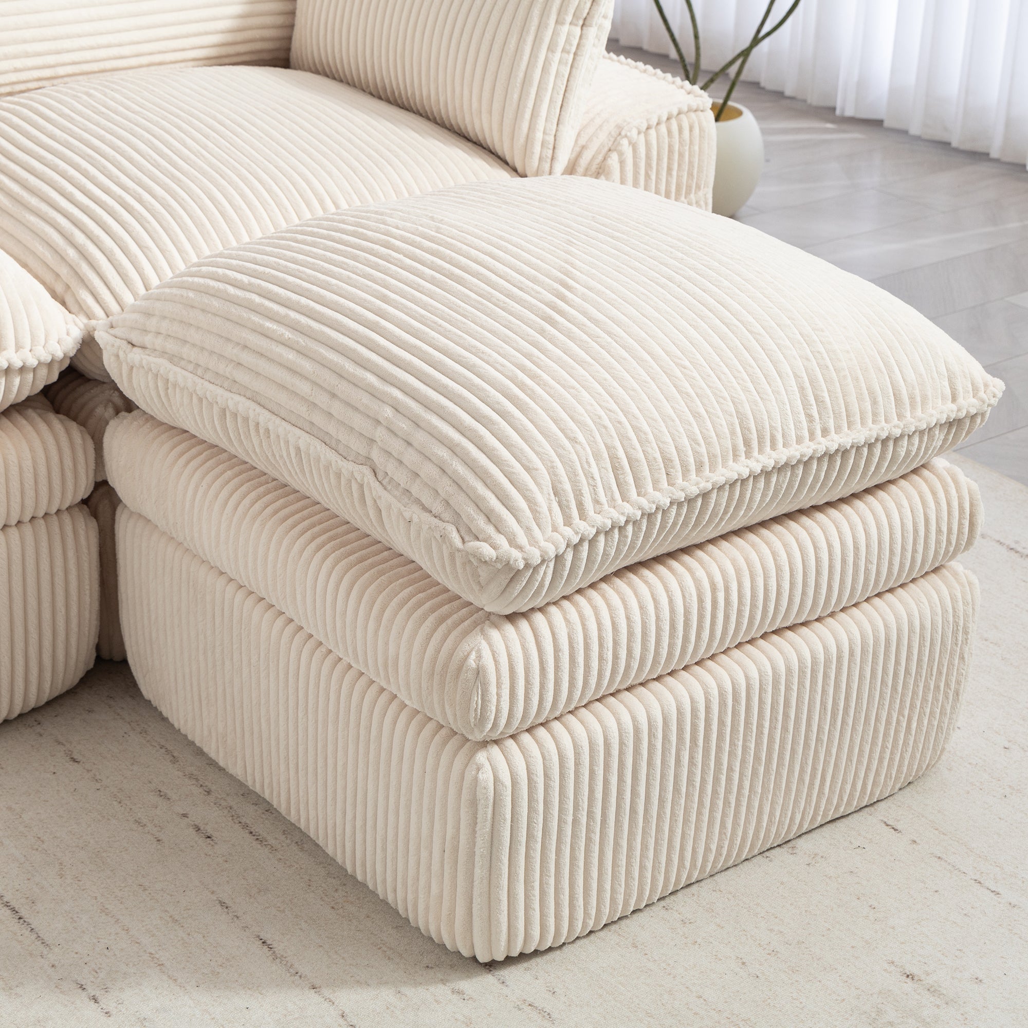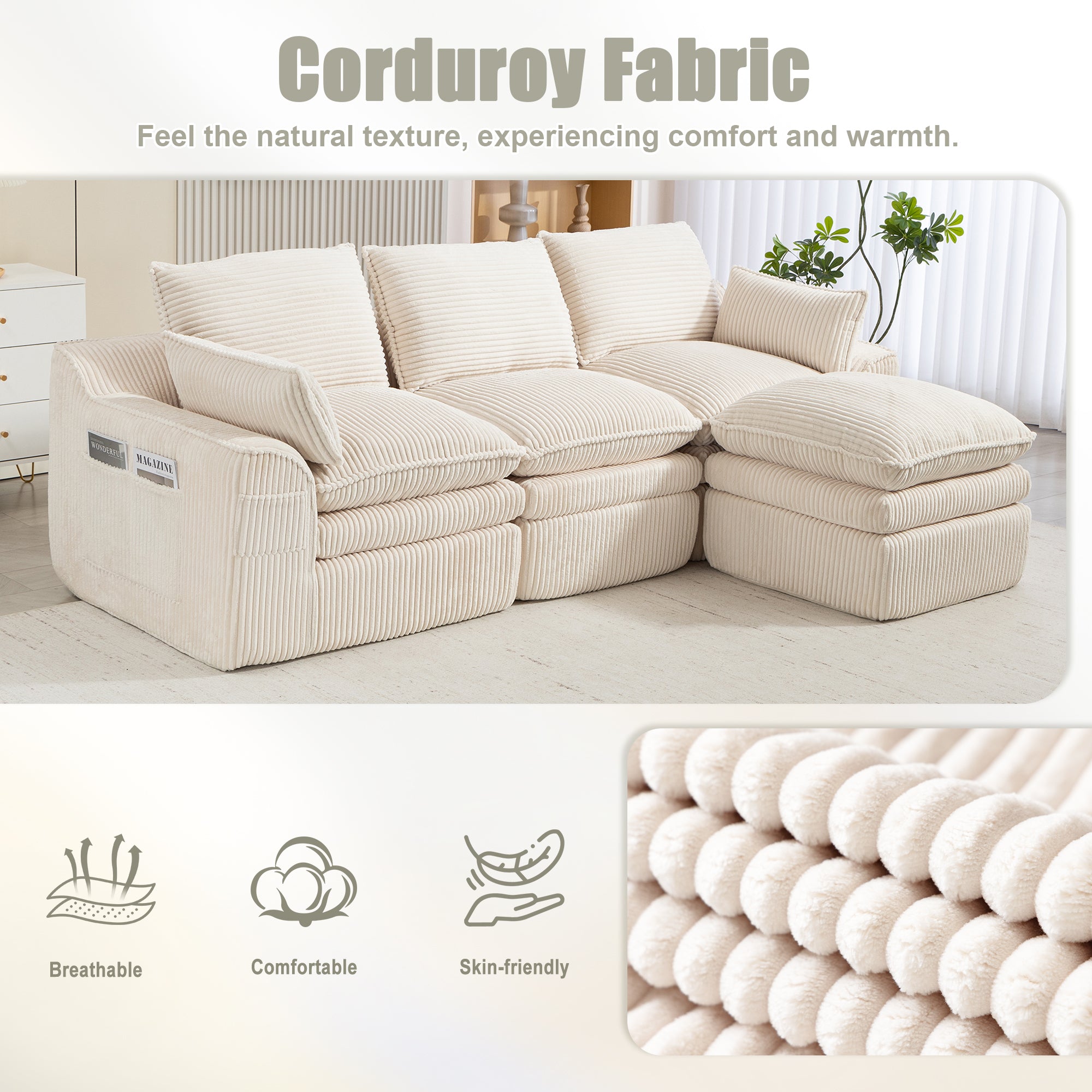 - Fluffy Corduroy Sectional Sofa with:This sofa is crafted from a soft, skin-friendly corduroy fabric that feels as light as clouds and exudes a luxurious appearance.Its warm touch ensures comfort throughout the year. The unique striped pattern and gentle sheen enhance the tactile experience, elevating the sensory experience to new heights. It seamlessly blends comfort with visual appeal, creating a cohesive and harmonious space.