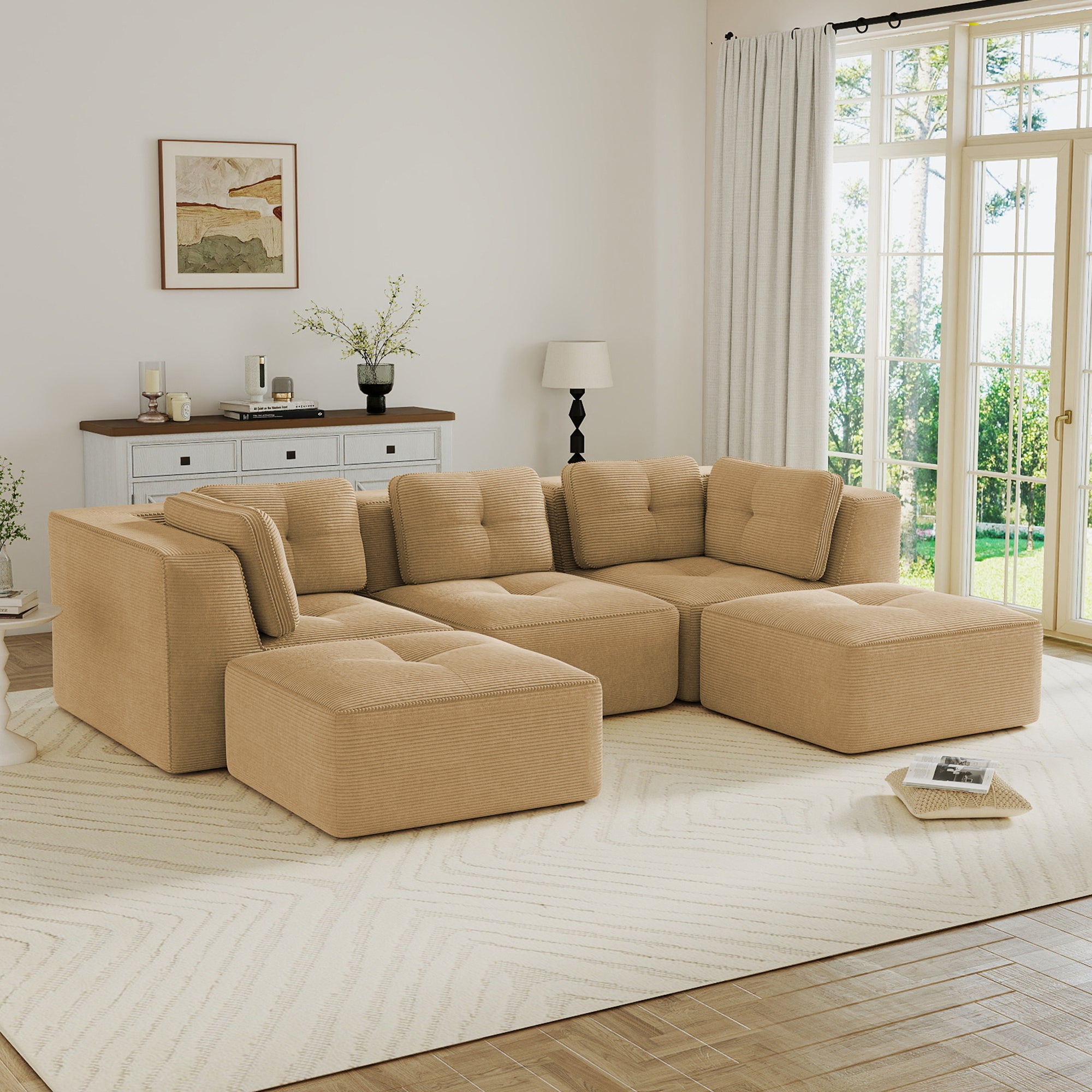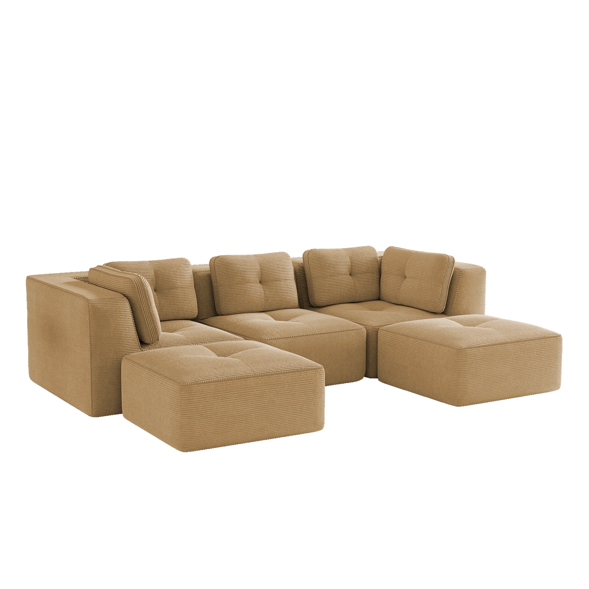 Modern U-Shaped Modular Sectional Sofa for Living Room, Corduroy Fabric, 3-Seater Couch with Deep Seat and 2-Movable Ottoman,Pearl-like piping, Tufted Design, No Assembly, Anti-slip Design, Camel-W714S01785