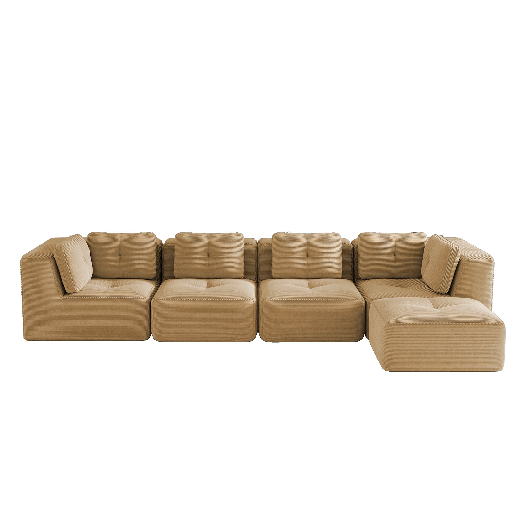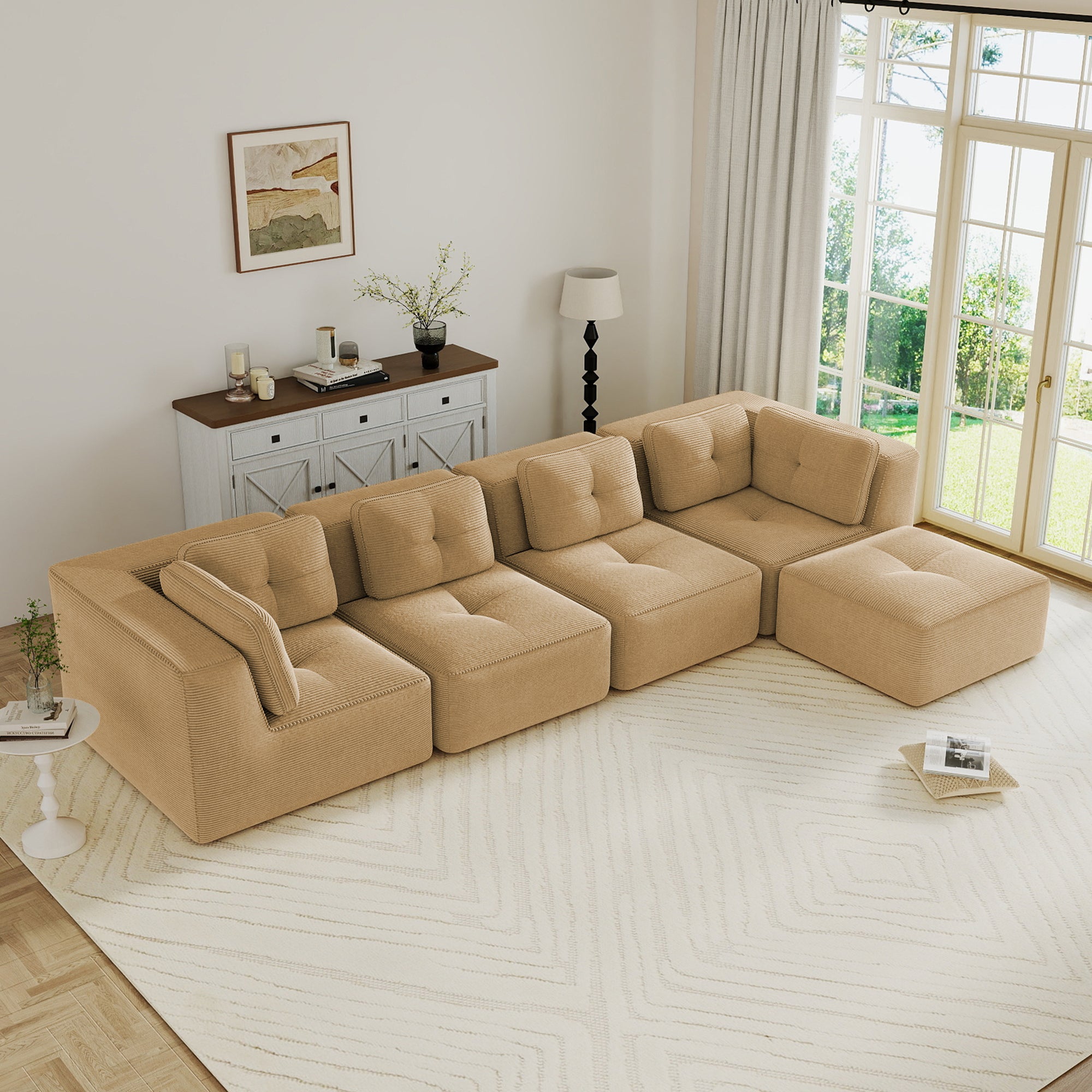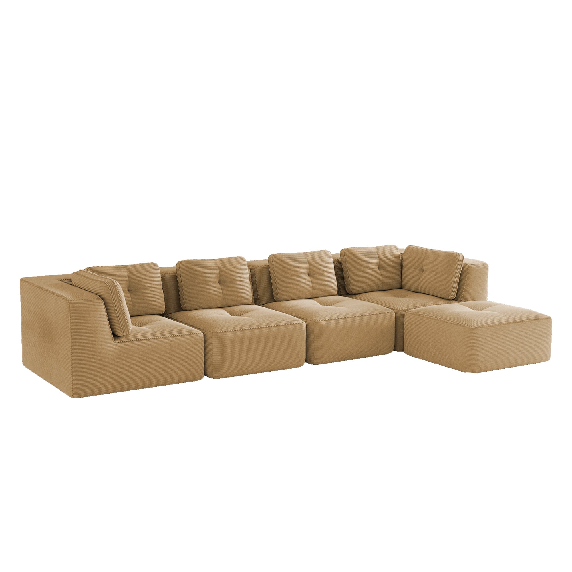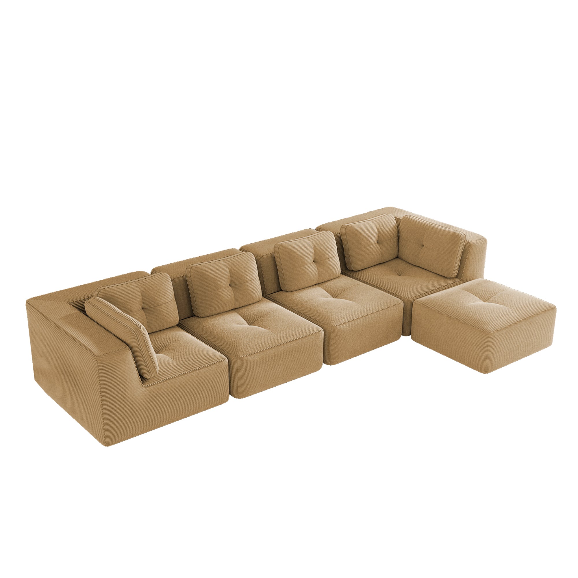 Modern Modular Sectional Sofa for Living Room, Corduroy Fabric, 4-Seater Couch with Deep Seat and Movable Ottoman,Pearl-like piping, Tufted Design,No Assembly, Anti-slip Design,Camel-W714S01787