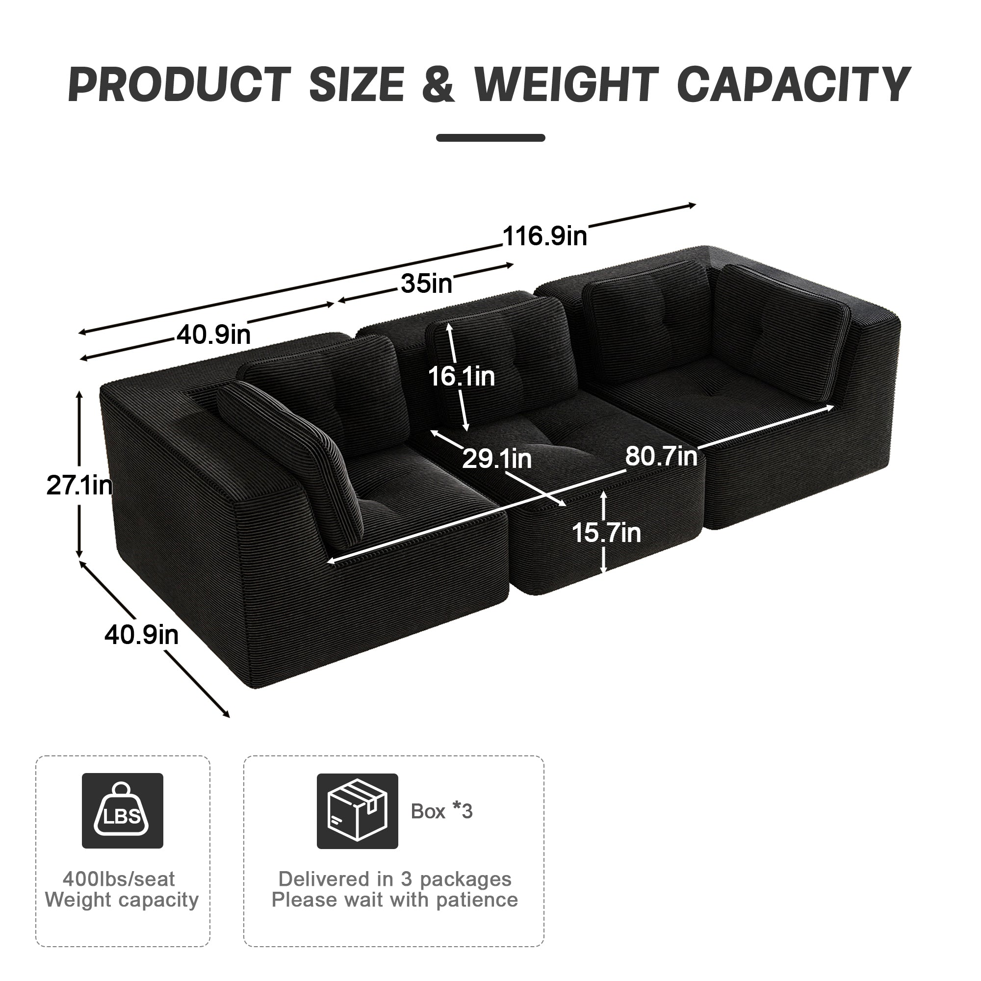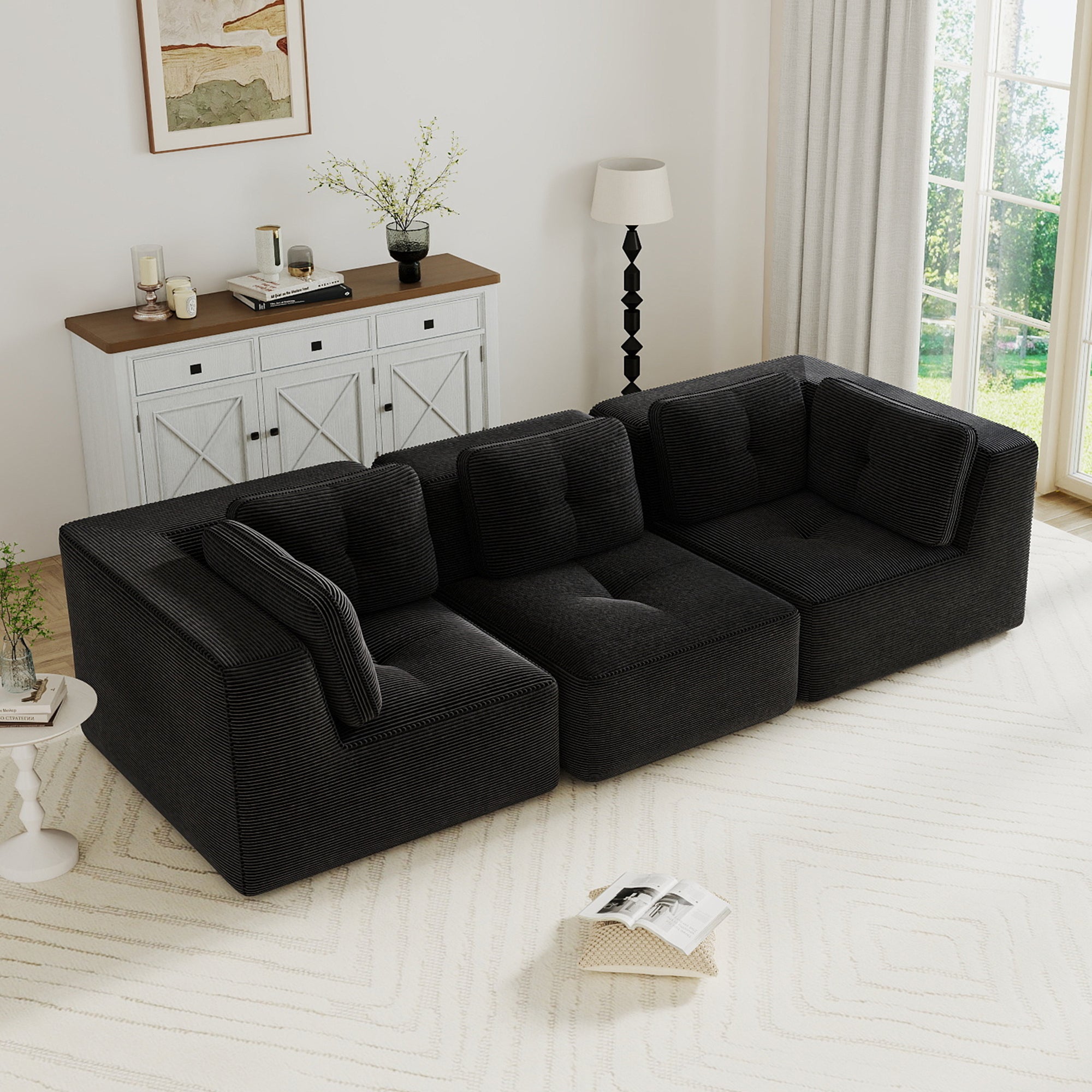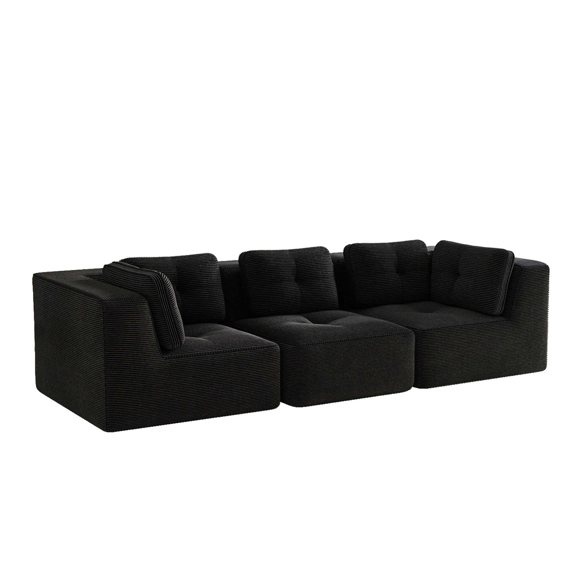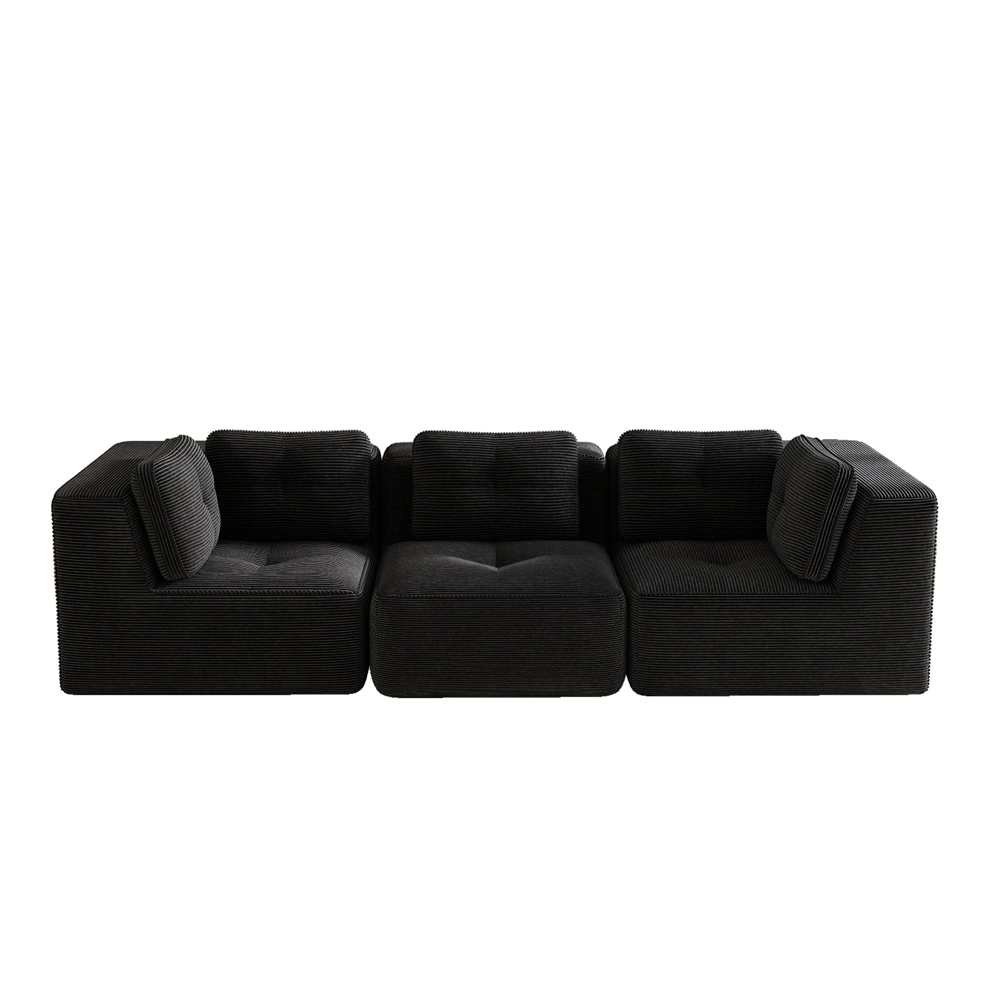 Modern Modular Sectional Sofa for Living Room, Corduroy Fabric, Oversized 3-Seater with Deep Seat , Pearl-like piping, Tufted Design, No Assembly, Anti-slip Design, Black-W714S01789