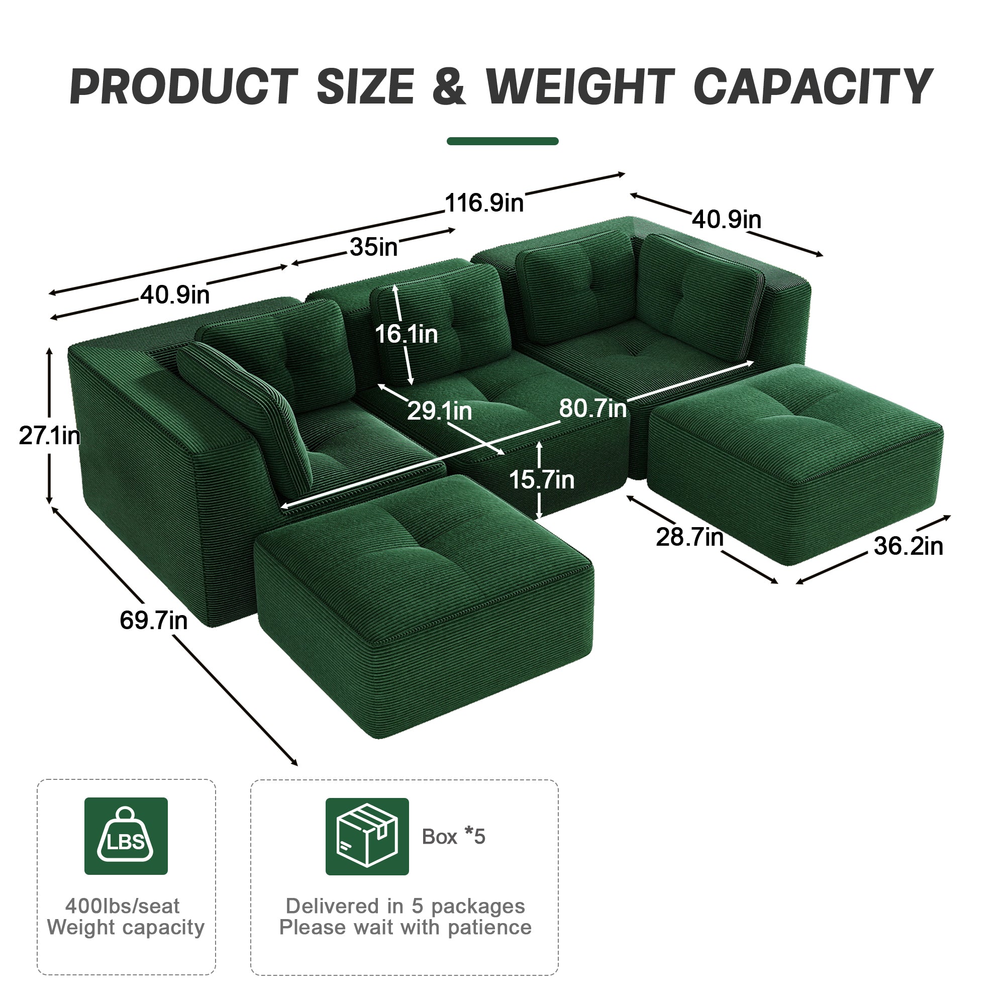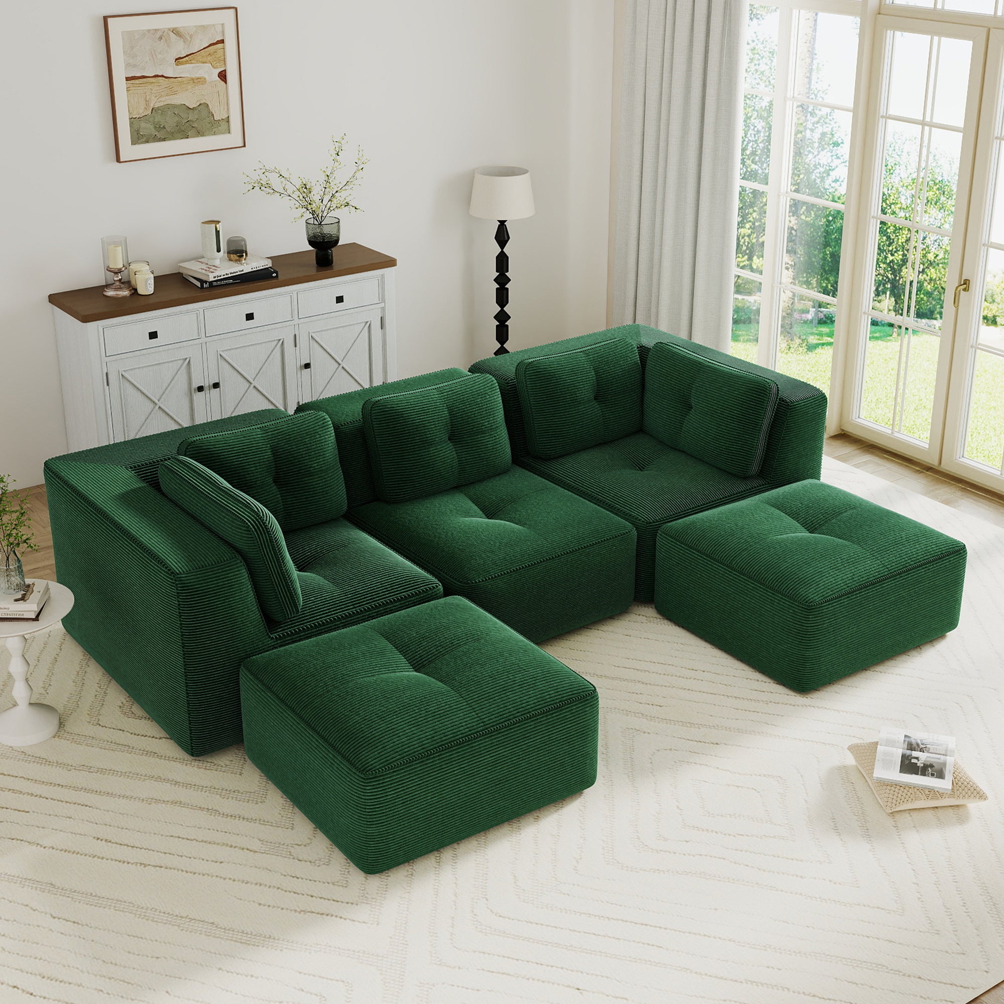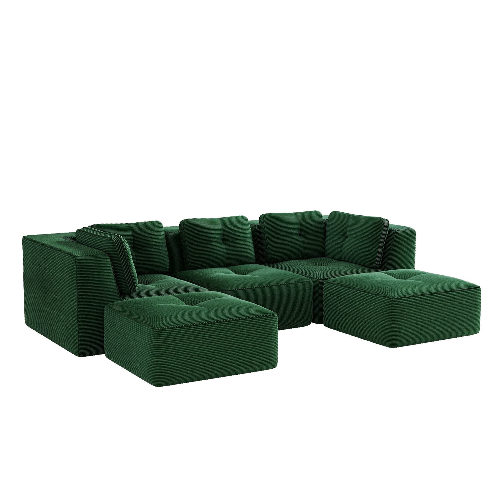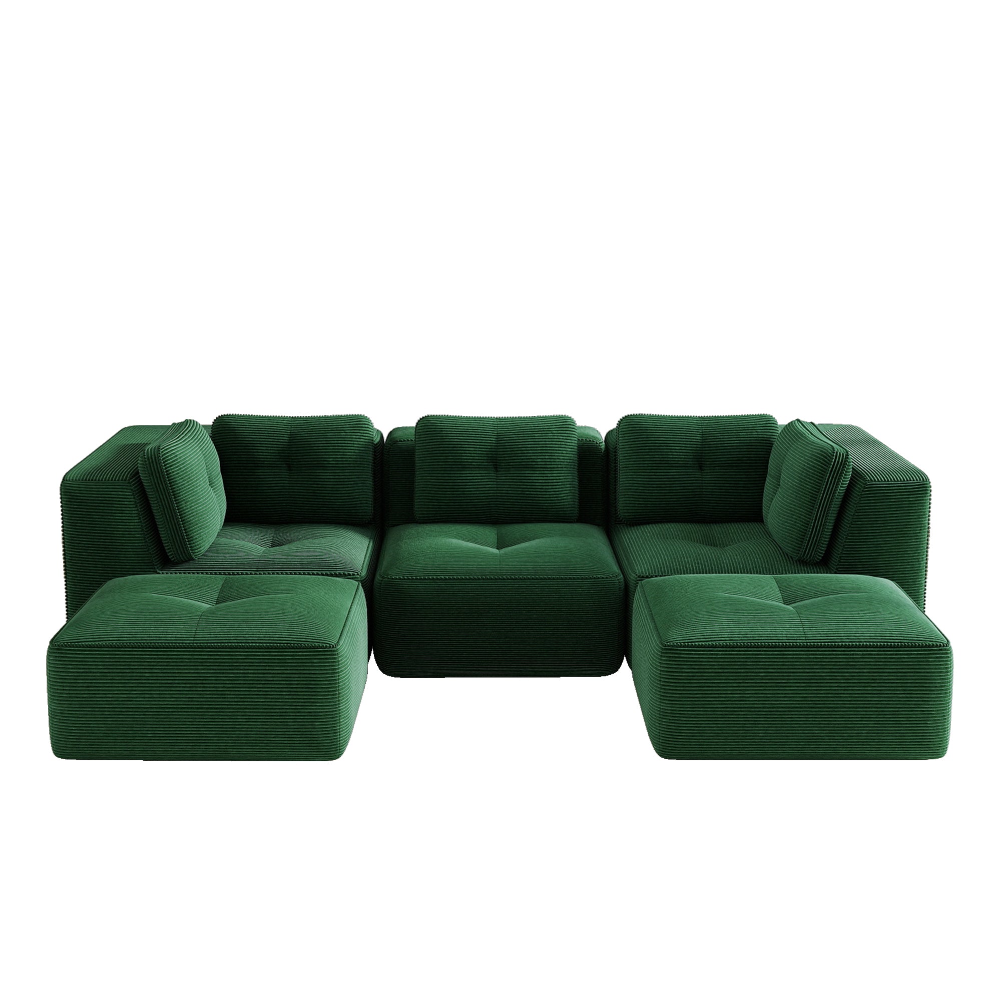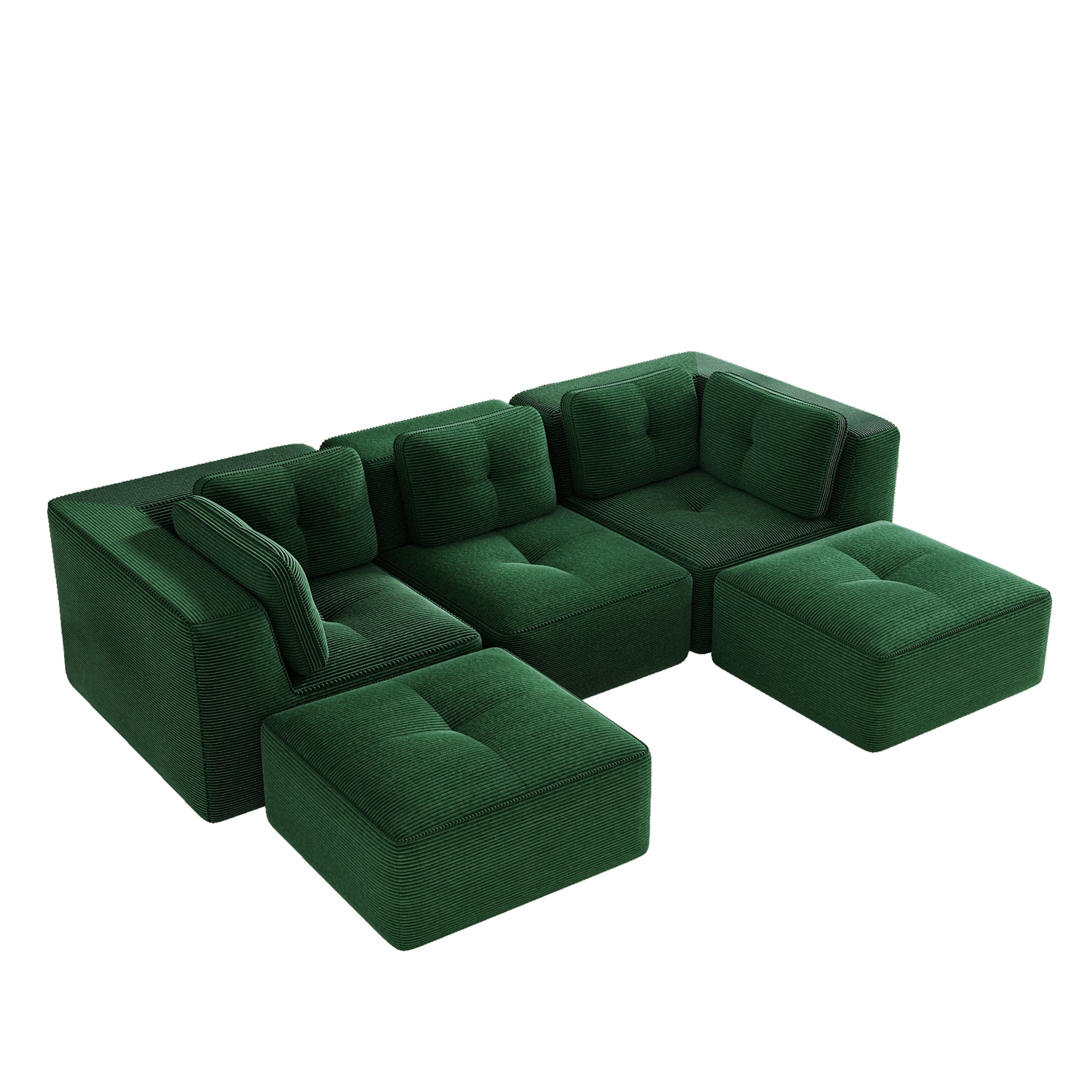 Modern U-Shaped Modular Sectional Sofa for Living Room, Corduroy Fabric,3-Seater Couch with Deep Seat and 2-Movable Ottoman,Pearl-like piping, Tufted Design, No Assembly, Anti-slip Design, Green-W714S01797