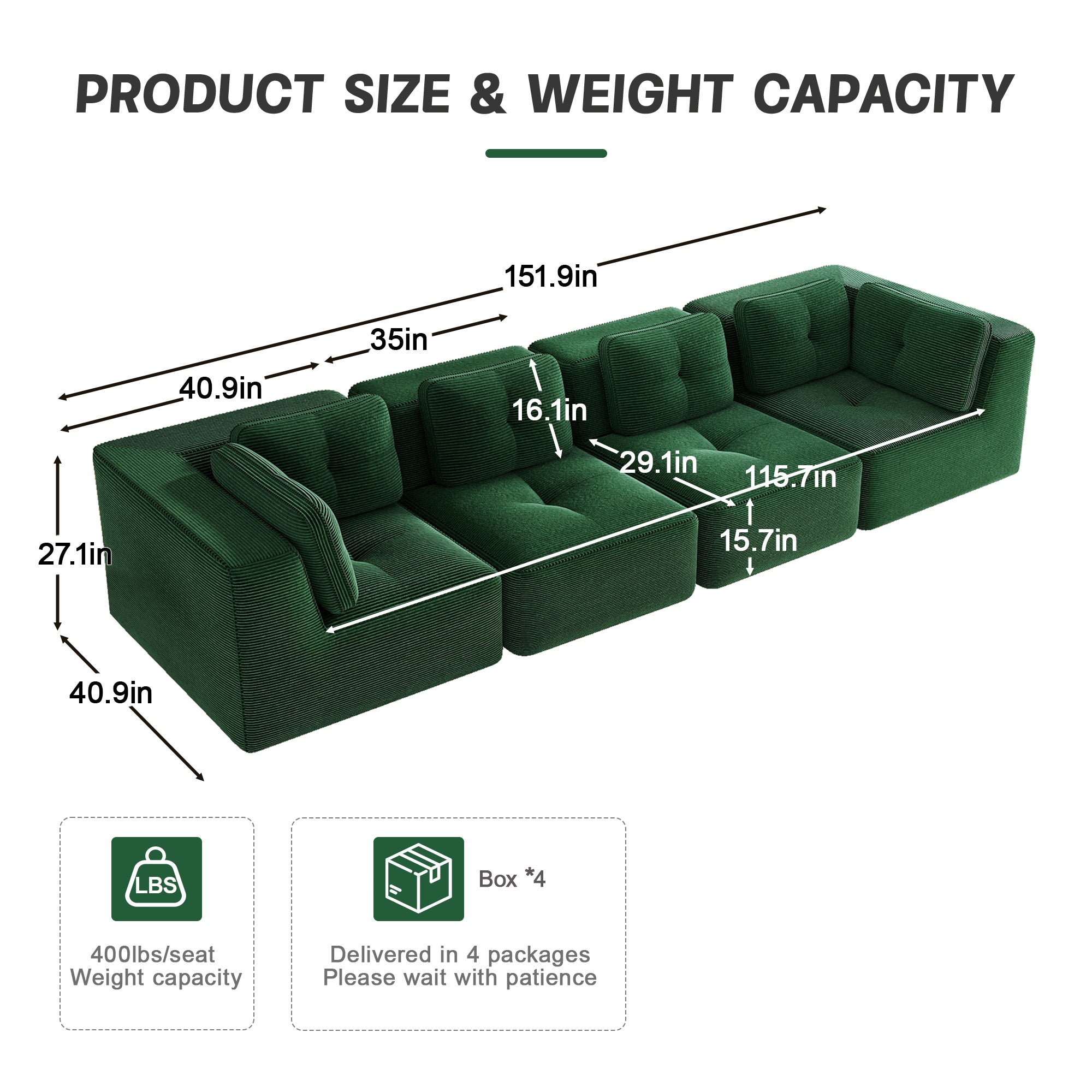 Modern Modular Sectional Sofa for Living Room, Corduroy Fabric, Oversized 4-Seaterwith Deep Seat , Pearl-like piping, Tufted Design, No Assembly, Anti-slip Design, Green-W714S01798