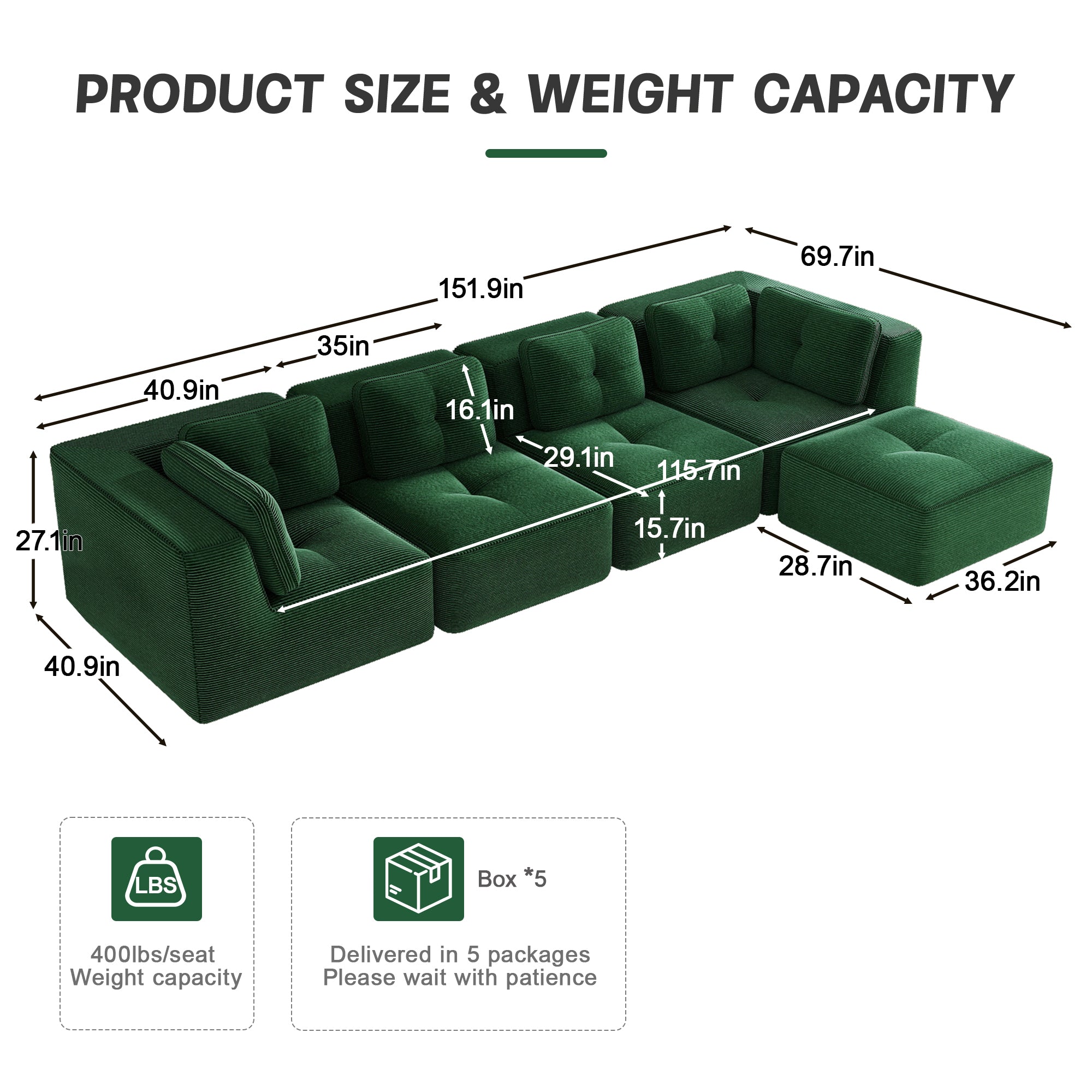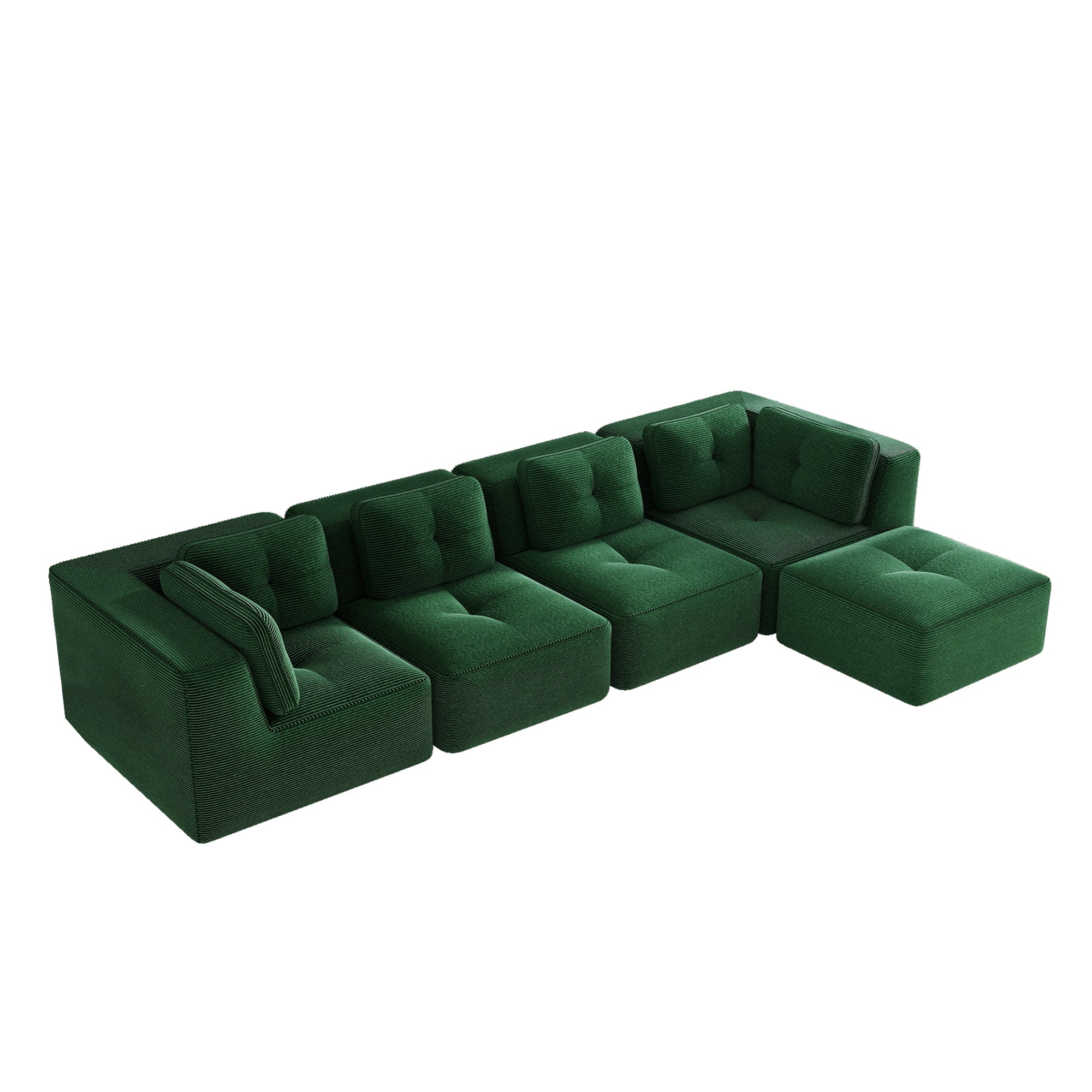 Modern Modular Sectional Sofa for Living Room, Corduroy Fabric, 4-Seater Couch with Deep Seat and Movable Ottoman,Pearl-like piping, Tufted Design,No Assembly, Anti-slip Design,Green-W714S01799