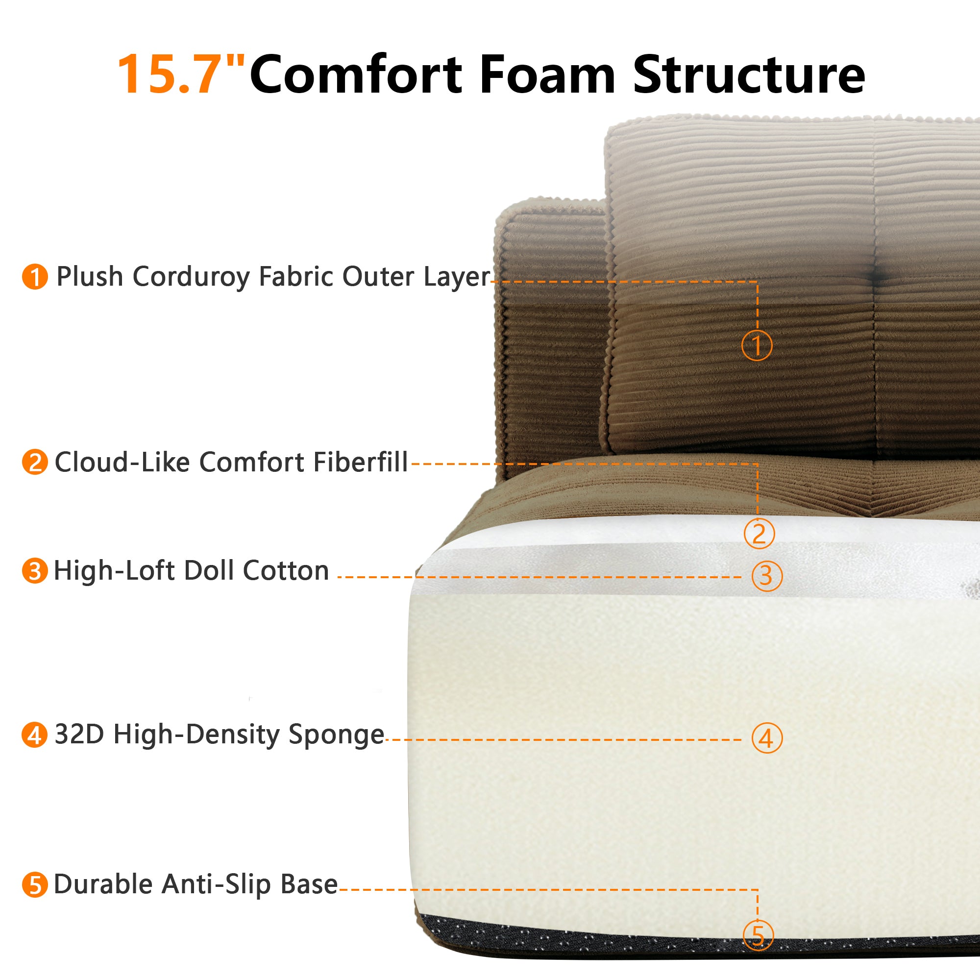 - Premium Corduroy Fabric: Immerse yourself in our velvety-soft corduroy fabric, offering a delicate touch alongside exceptional durability and abrasion resistance. This understated luxury material combines softness with warmth, delivering lasting comfort. Its distinctive texture and subtle sheen not only make the sofa stand out but also provide gentle care throughout every season, elevating your tactile experience.